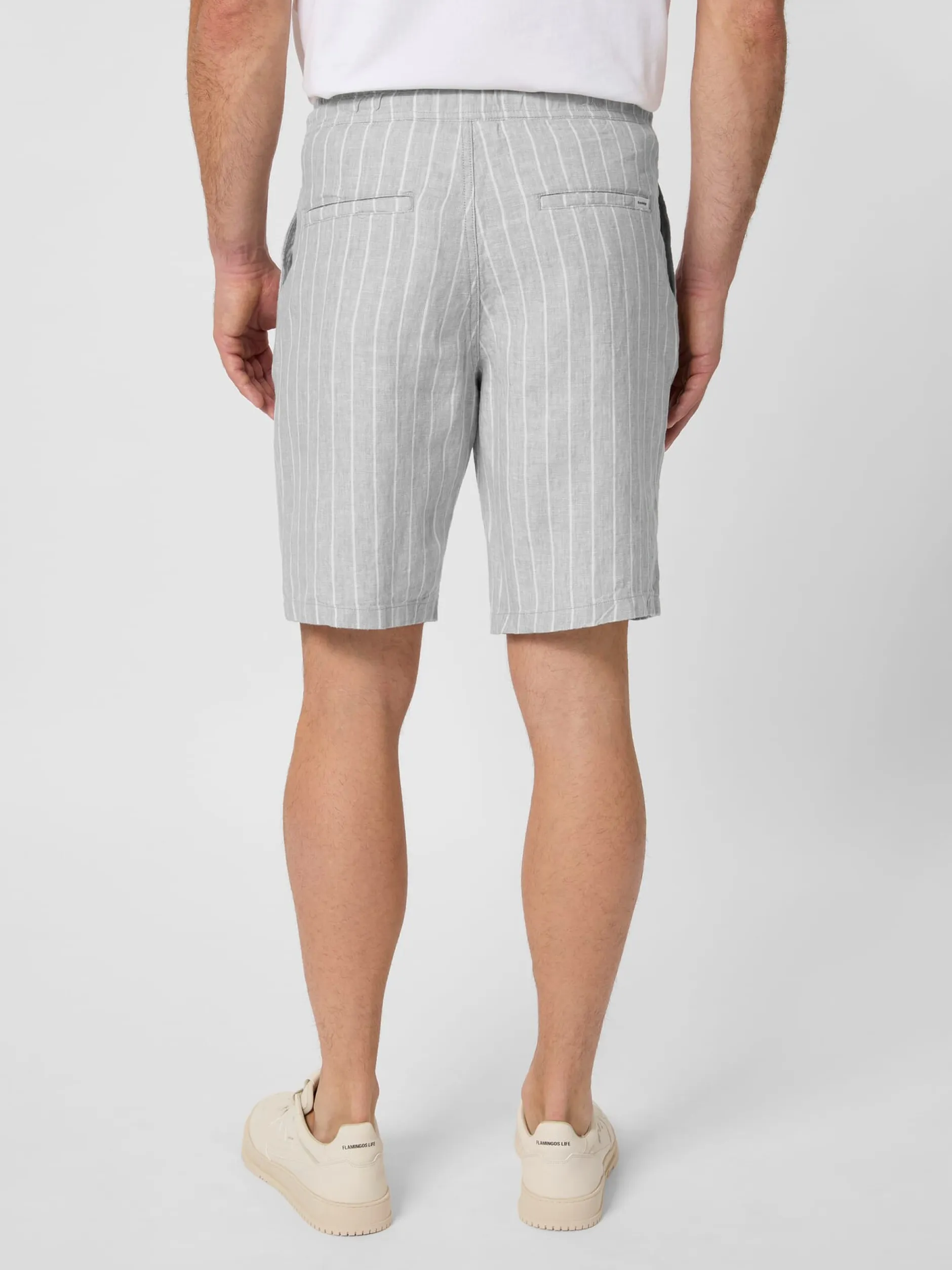 Lässige Shorts, deren gestreifter Stoff aus strapazierbarem, kühlendem Leinen besteht. Das Gewebe zeigt neben den Streifen die leinentypischem Fadenverdickungen und einen schönen Melangeeffekt. Die Shorts wird wird mittels Reißverschluss und Knopf geschlossen, ein Gummibund mit Bindeband im Tunnelzug erhöht den Tragekomfort. Je zwei Seitentaschen und eingesetzte Gesäßtaschen nehmen Kleinteile des täglichen Bedarfs auf. Die Flachsfasern für den Stoff stammen aus kontrolliert biologischem Anbau