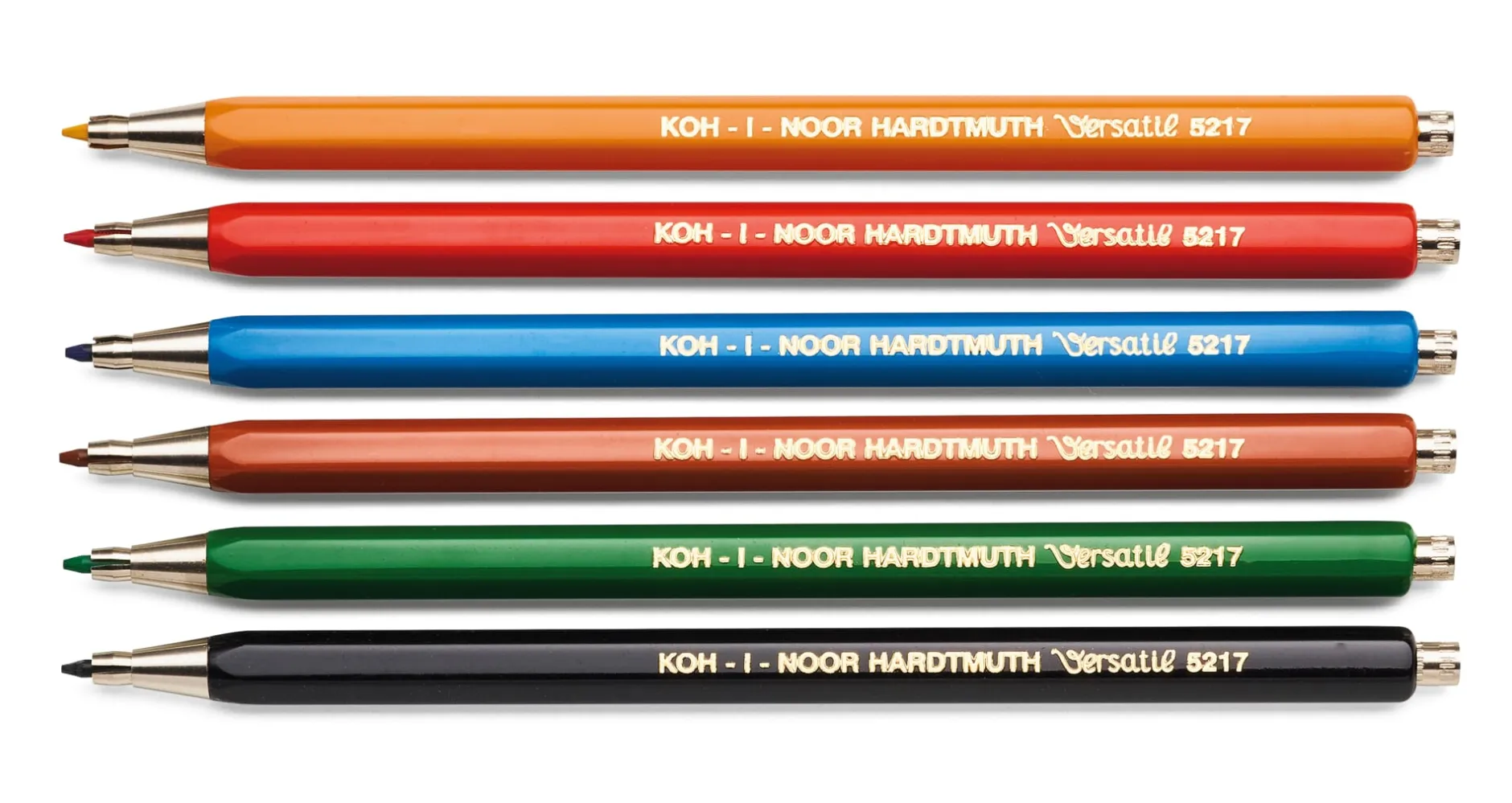 Lederetui mit 6 Minenhaltern aus Stahl (gelb, schwarz, grün, blau, rot, braun), bestückt mit je 1 Mine der entsprechenden Farbe. Hergestellt in Tschechien. Halterlänge 14 cm. Gewicht 15 g. Im Etui aus Rindleder (L 15,5 × B 6 × H 2 cm).