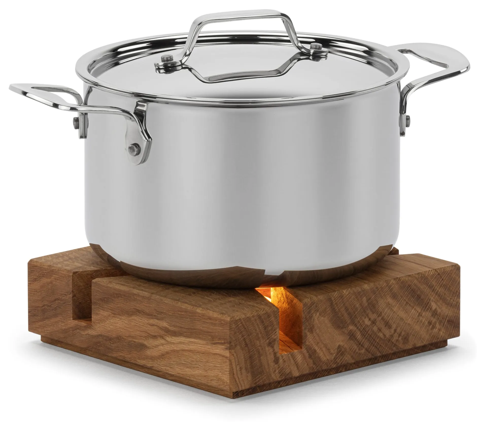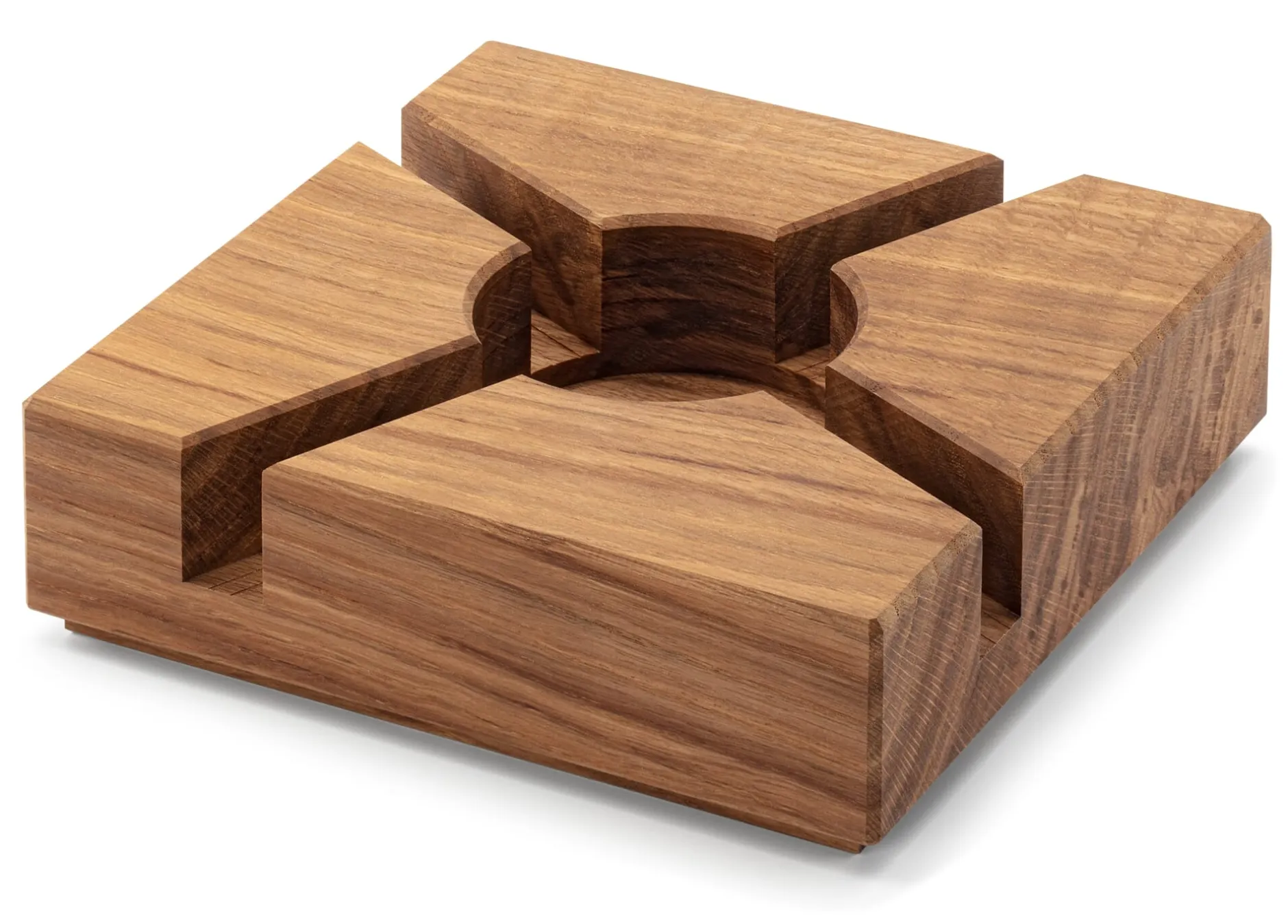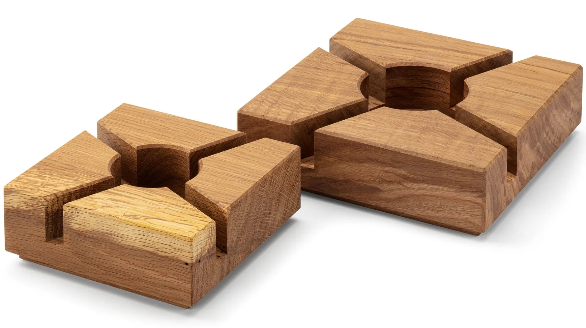 Das größere unserer beiden Eichenholz-Stövchen: bei Tisch auch als Topfuntersetzer mit Rechaud-Funktion zu nutzen. Gelegentlich erreichen die Werkstatt von Kondrad Horsch eher großformatige Hölzer. Daraus kann er größere Stücke wie dieses Stövchen anfertigen.