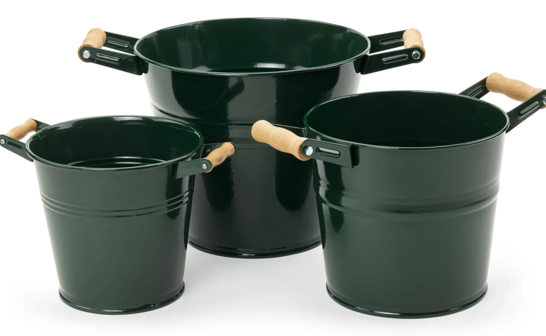 Besonders harmonisch wirkt die Bepflanzung von Balkon und Terrasse, wenn nicht nur Blühzeitpunkte und Blütenfarben aufeinander abgestimmt sind, sondern auch die Pflanzgefäße optisch zu einander passen. So bieten wir hier Pflanzkübel aus verzinktem und grün lackiertem Stahlblech an. Wetterfest sind diese Kübel also ohnehin, Wasserabzugslöcher im Boden sorgen außerdem dafür, dass sie direkt bepflanzt werden können, weil überschüssiges Gießwasser ablaufen kann. An den handschmeichlerisch rundgeschliffenen Handgriffen lassen die Gefäße sich sehr angenehm tragen. Wir haben drei Größen ausgewählt, die schon als Solisten ihre Wirkung nicht verfehlen, mit- und nebeneinander aber erst recht ein schönes Ensemble ergeben.
