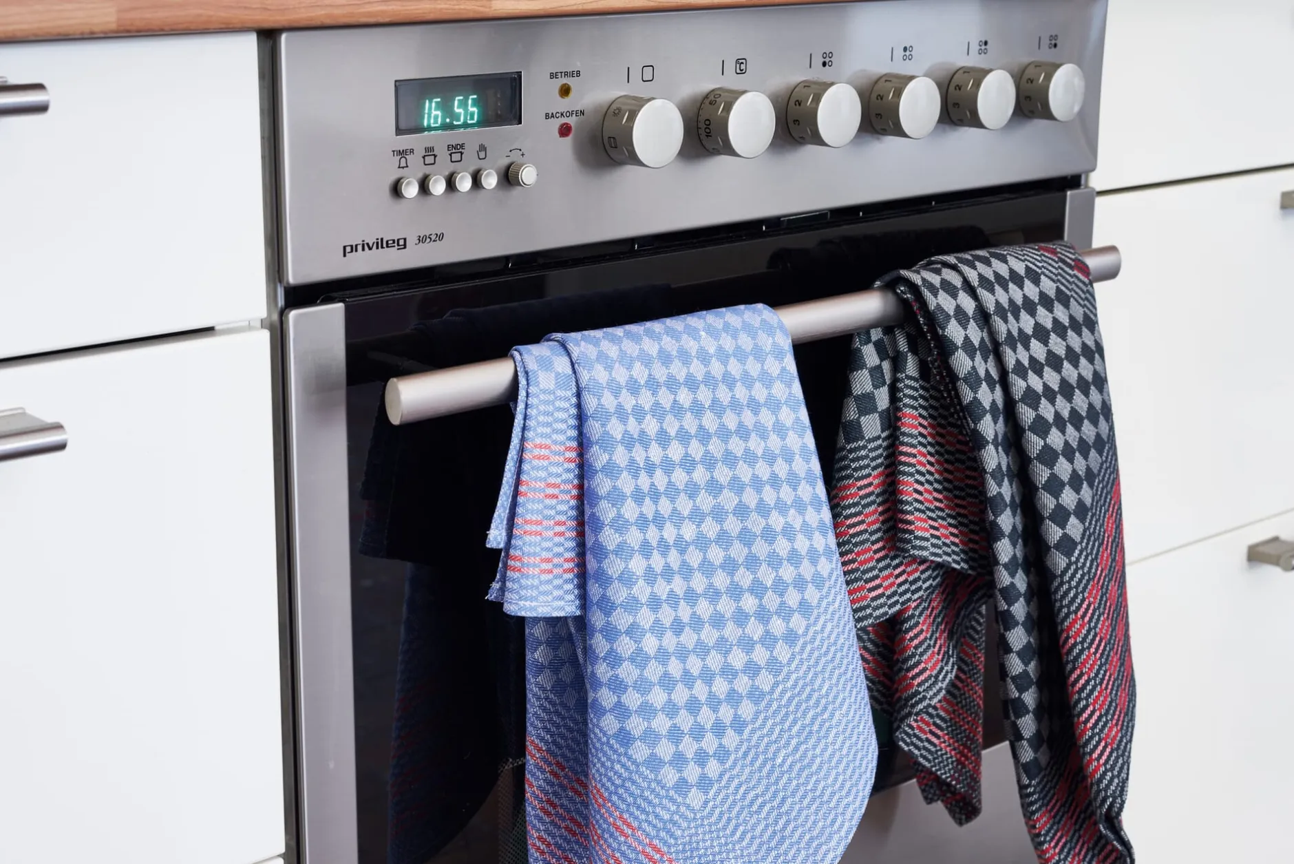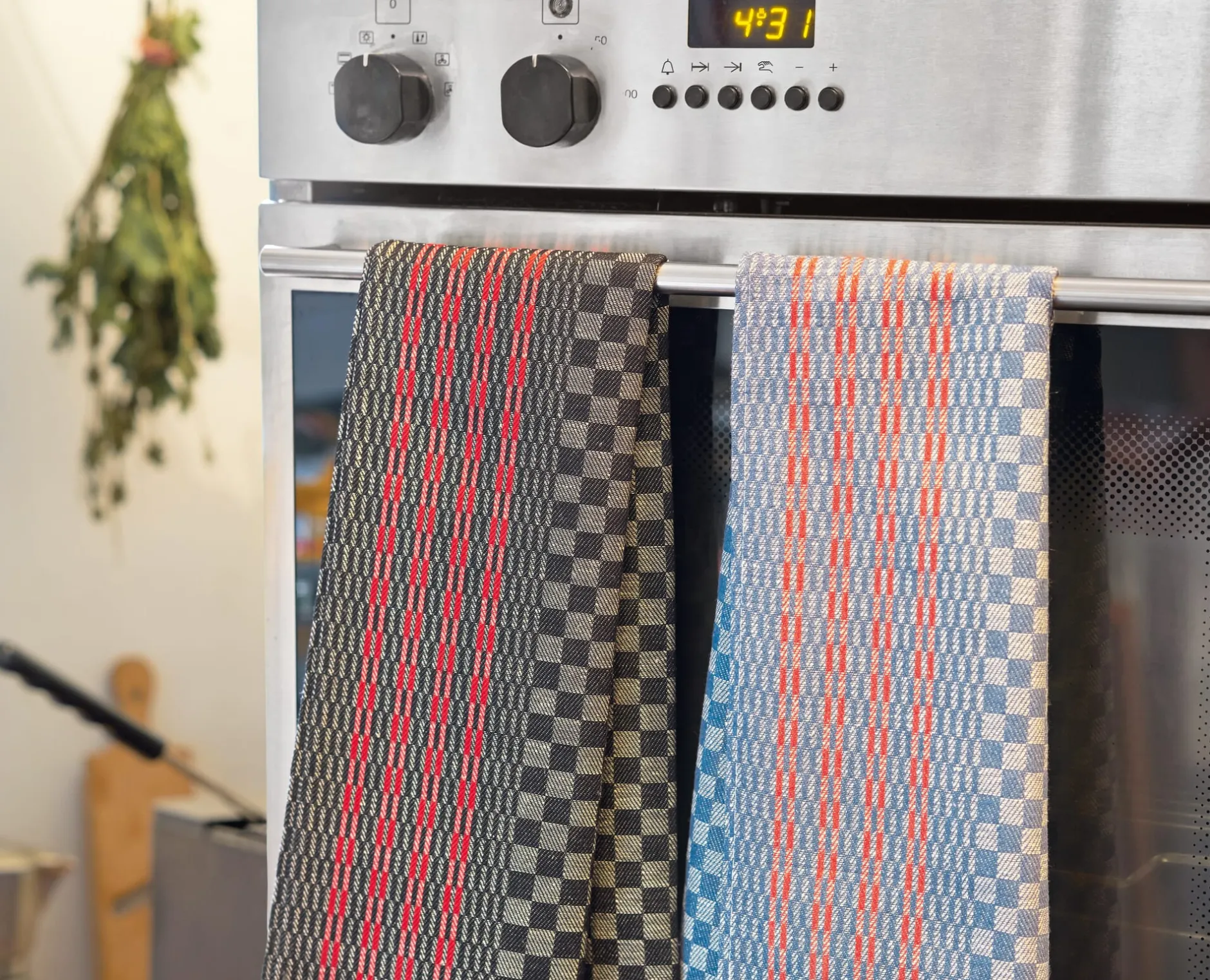 Im Ruhrgebiet heißt es Grubentuch und fehlte einst in keines Bergmanns Kaue. Dank des äußerst langlebigen und robusten Gewebes findet es sich mittlerweile auch in vielen Haushalten anderer Regionen und Länder. Noch öfter ist es in der professionellen Gastronomie anzutreffen – was zeigt, wie strapazierbar das Geschirr- und Händetuch ist. Dieses Grubentuch wird aus einem kräftigen Halbleinen in Halbzwirnqualität in versetztem Köpergrat gewebt, typisch gedeckt blau-hellblau kariert und im Rand rot abgesetzt. Das Leinen stammt aus Europa.