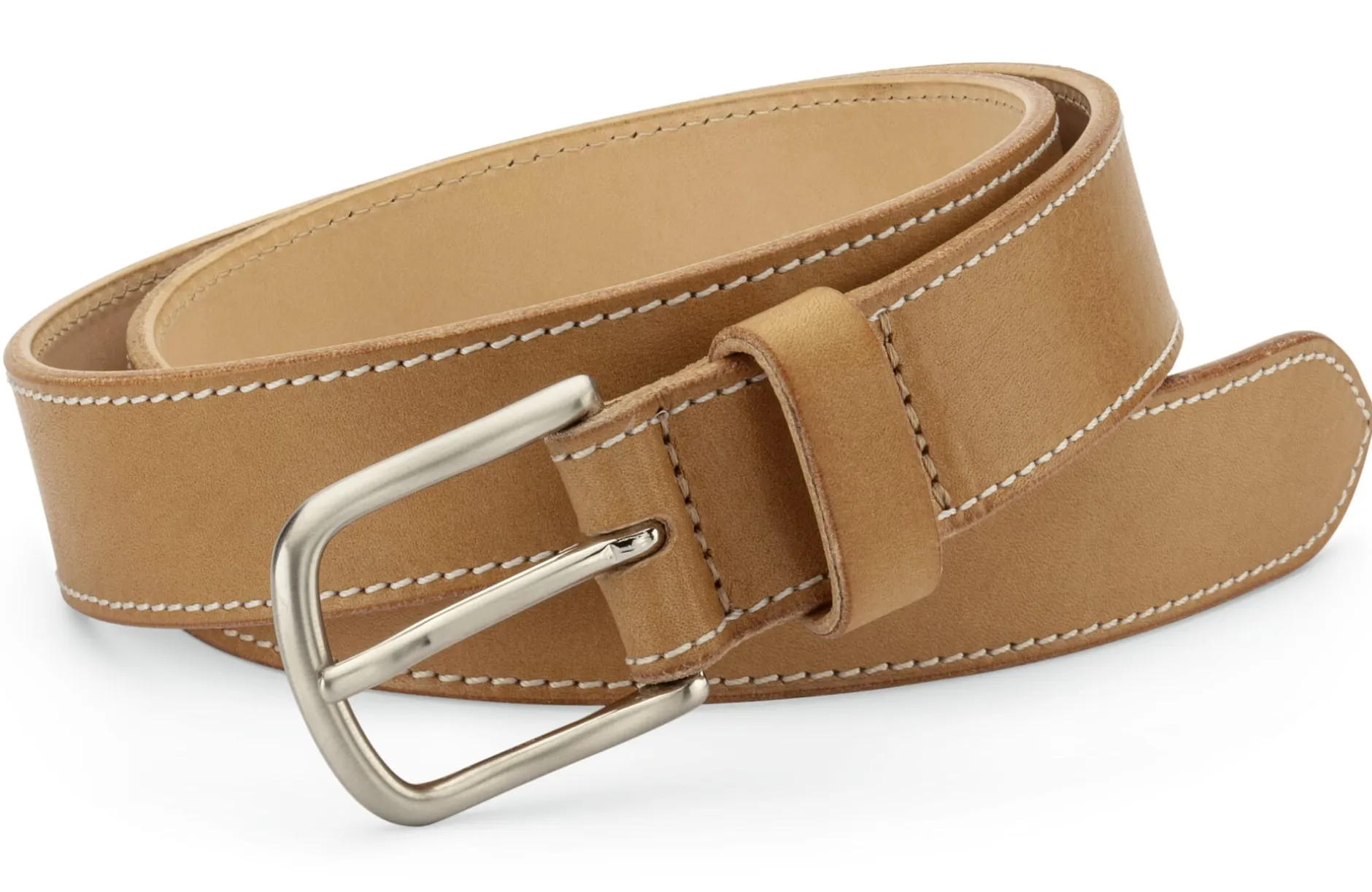 In der Ledermanufaktur Kreis entsteht dieser markante Gürtel, der aus zwei Lagen feinster Leder flach und offenkantig gearbeitet wird. Für das Oberleder wird ein vegetabil gegerbtes Kalbleder aus Italien verwendet, das durch den Vorgang des „Glanzstoßens“ ein seidenmattes Finish erhält. Das Innenleder ist ein kräftiges, grubengegerbtes Blankleder aus der deutschen Gerberei Kobel in Kellinghusen. Das naturfarbene Leder wird an der Gürtelkante mit einem farblosen, transparenten Wachs poliert, wodurch der Gürtel einen lässigen und sportiven Charakter erhält. Gürtel, die in dieser Machart gefertigt werden, werden auch als „Sneakergürtel“ bezeichnet. Dank des hohen Fettgehalts des Innenleders wird der Gürtel bereits nach kurzer Eintragezeit besonders geschmeidig. Ausgestattet ist er mit einer vernickelten und gebürsteten Vollmessingschließe aus Italien.