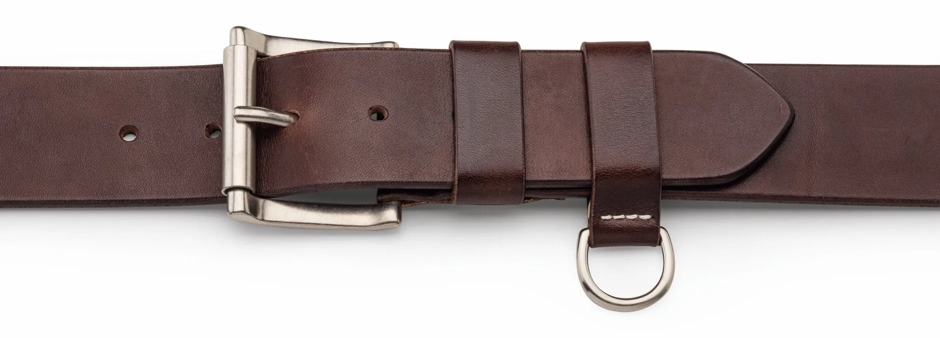 Das Rindleder für diesen Gürtel stammt aus dem Rückenbereich der Tiere (den sogenannten Croupons, dem wertvollsten und besten Teil). Es wird in einer deutschen Gerberei über wenigstens zwei Monate pflanzlich gegerbt und anschließend anilingefärbt und mit Bienenwachs behandelt. Die Rollschließe und der D-Ring werden in einem italienischen Familienbetrieb aus Messing gegossen und galvanisch versilbert. In der Ledermanufaktur Kreis in Offenbach werden nach dem Lederzuschnitt die Kanten gefräst, in mehreren Durchgängen geschliffen, in Lederfarbe gebeizt und anschließend mit Hartwachs poliert. Diese traditionelle Arbeitsweise ist aufwendig, dafür industrieller Beschichtung weit überlegen – und diese echte Sattlerkante kann bei Bedarf einfach mit farbloser Schuhcreme poliert werden.
