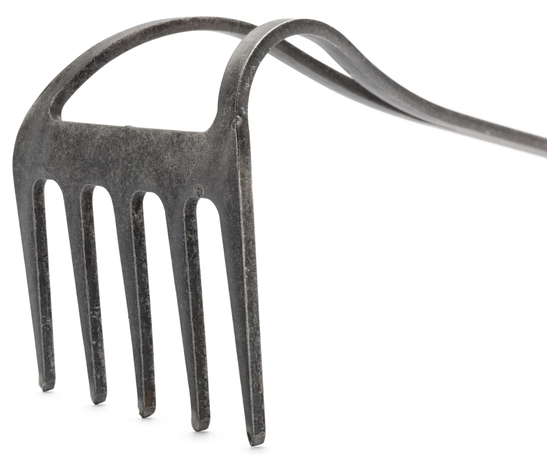 Werkzeugkopf mit fünf geschmiedeten Zinken aus Mangan-Bor-Stahl. Handgriff Eschenholz lackiert. Zinken Länge 5 cm, Breite 8,5 cm. Gesamtlänge 32 cm. Gewicht 200 g.