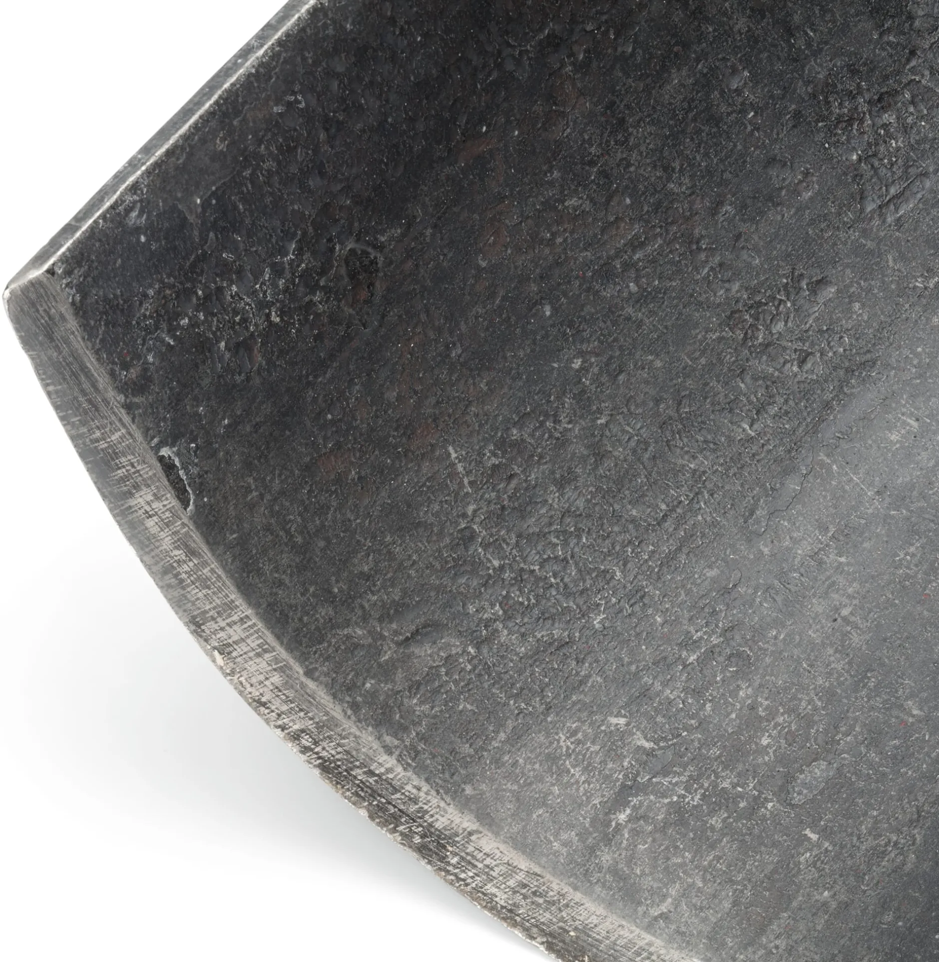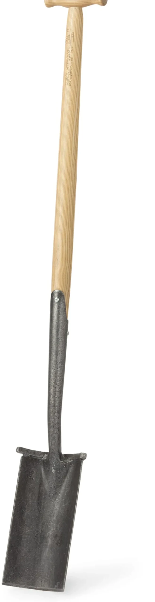Blatt (L 24 × B 12,5 cm) aus Mangan-Bor-Stahl geschmiedet. Stiel Eschenholz (Herkunft Europa) lackiert. Mit T-Griff (B 12 cm). Gesamtlänge 111,5 cm. Gewicht 2,4 kg.