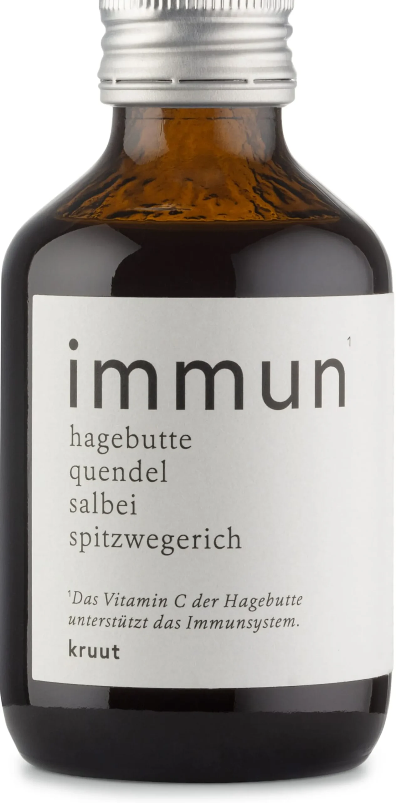 In diesem Kruut stecken die Auszüge von vier heimischen Pflanzen: Hagebutten (mit natürlichem Vitamin C), Quendel, Salbei und Spitzwegerich. Er bündelt die Kraft der unkultivierten Natur in einem fruchtigen, säuerlich-frischen Oxymel. Der Hersteller empfiehlt den Bio-Kruut Immun als tägliches Ritual und immer dann, wenn das Gefühl aufkommt, dem eigenen Körper etwas Gutes tun zu wollen.