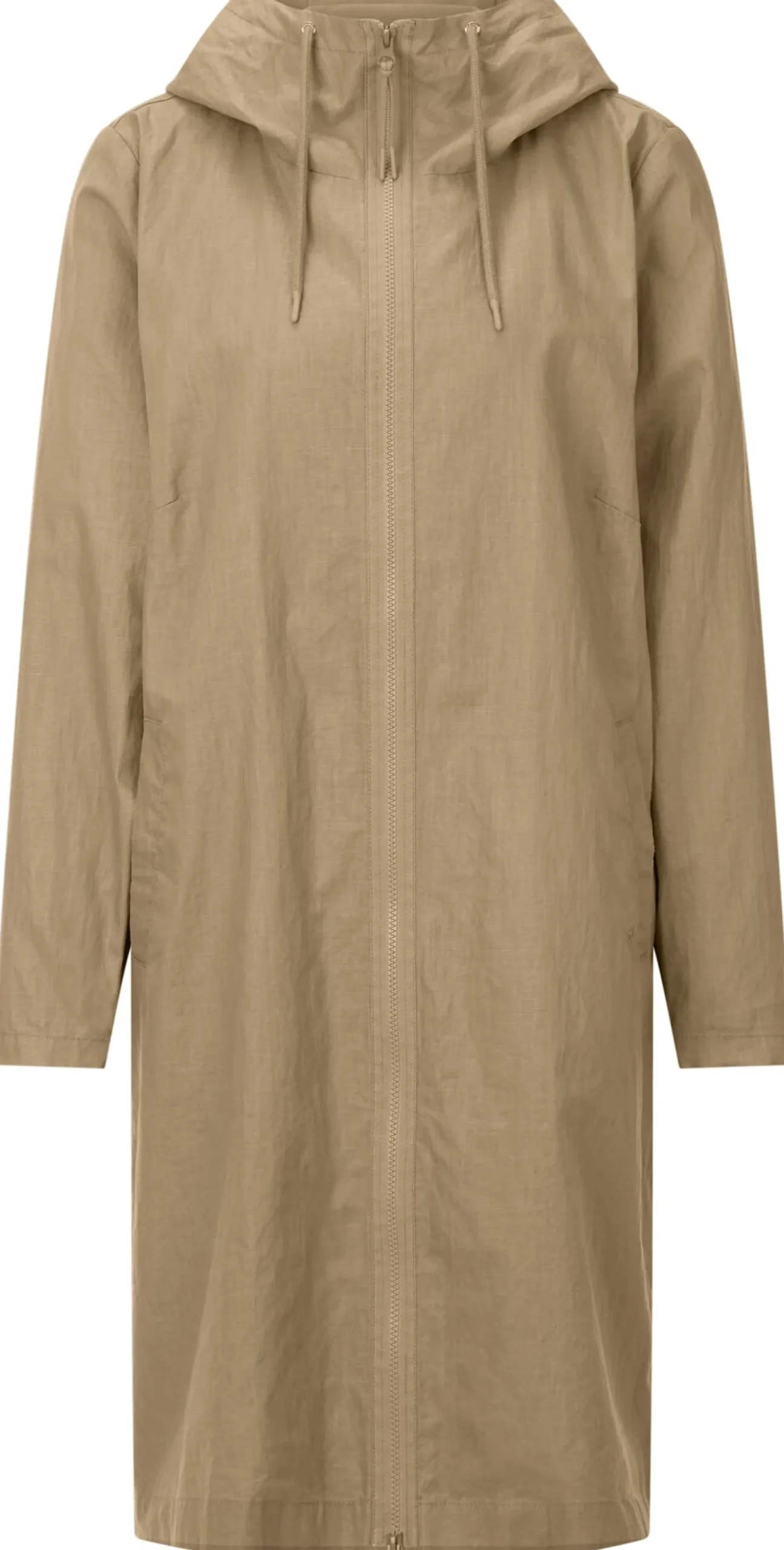 Der Oberstoff dieses Mantels besteht vollständig aus kontrolliert biologisch angebautem Leinen. Das Gewebe ist angenehm leicht und zeigt einen schönen Melangeton. Innen ist das Material mit einer PFC-freien Polyurethan-Beschichtung versehen, was das Manteltuch wind- und wasserabweisend macht. Die geräumige Kapuze ist mittels Tunnelzug in der Weite anpassbar und bietet so einen zusätzlichen Schutz vor unbeständigem Wetter. Der Zweiwegereißverschluss lässt sich hoch bis zum Kinn schließen und die Ärmelabschlüsse können dank eines Druckknopfs weit oder eng anliegend getragen werden. Zwei Seitentaschen mit Druckknöpfen und eine Innentasche mit Reißverschluss nehmen Kleinteile des täglichen Bedarfs auf. Die legere Passform sorgt zusammen mit den langen Seitenschlitzen, die mit Druckknöpfen zu schließen sind, für viel Bewegungsfreiheit. Belüftungsösen unter den Achseln erhöhen den Tragekomfort. Damit ist der Mantel nicht nur alltagstauglich, sondern auch gut für sportliche Aktivitäten wie Wandern oder Fahrradfahren geeignet.