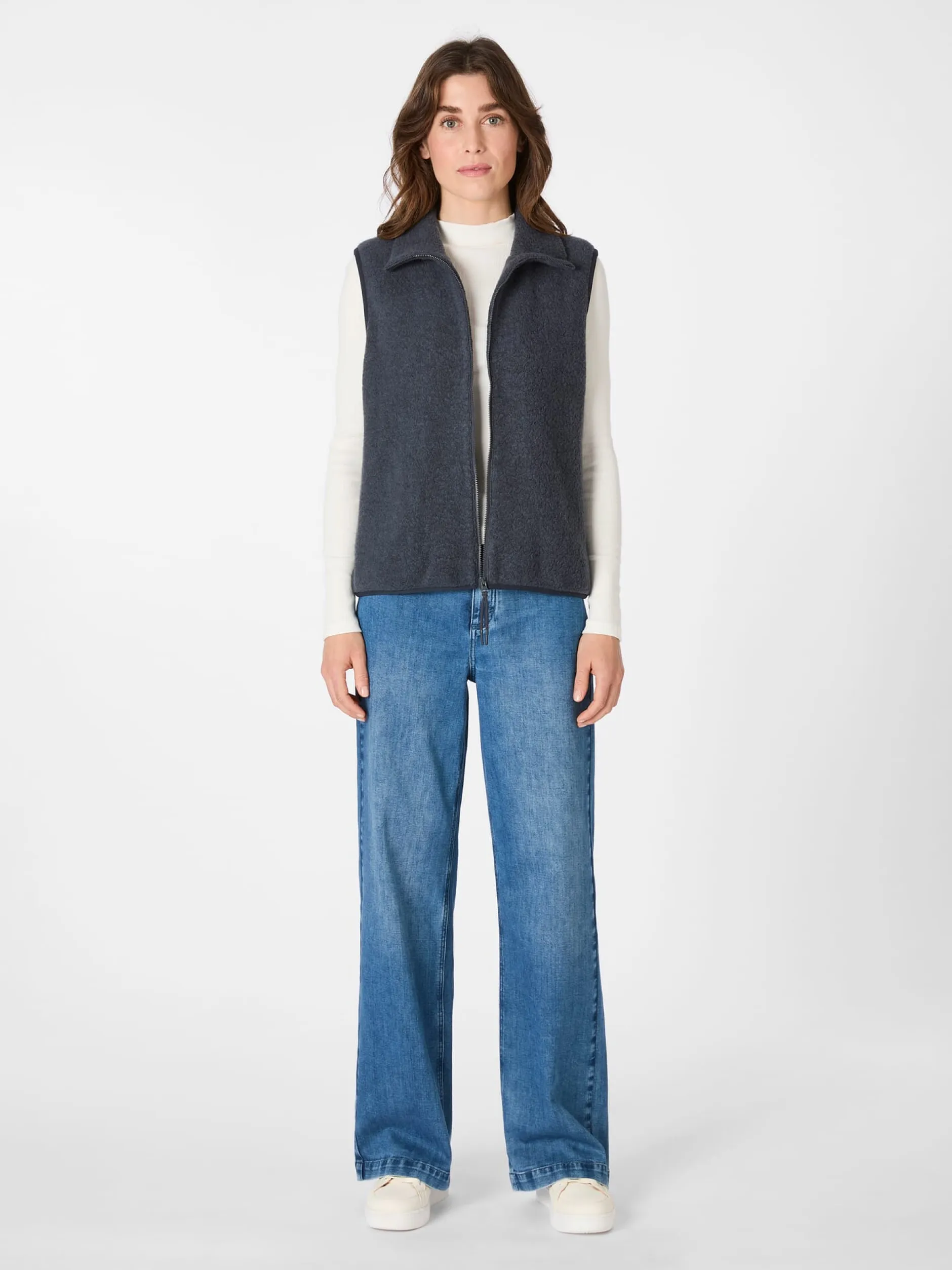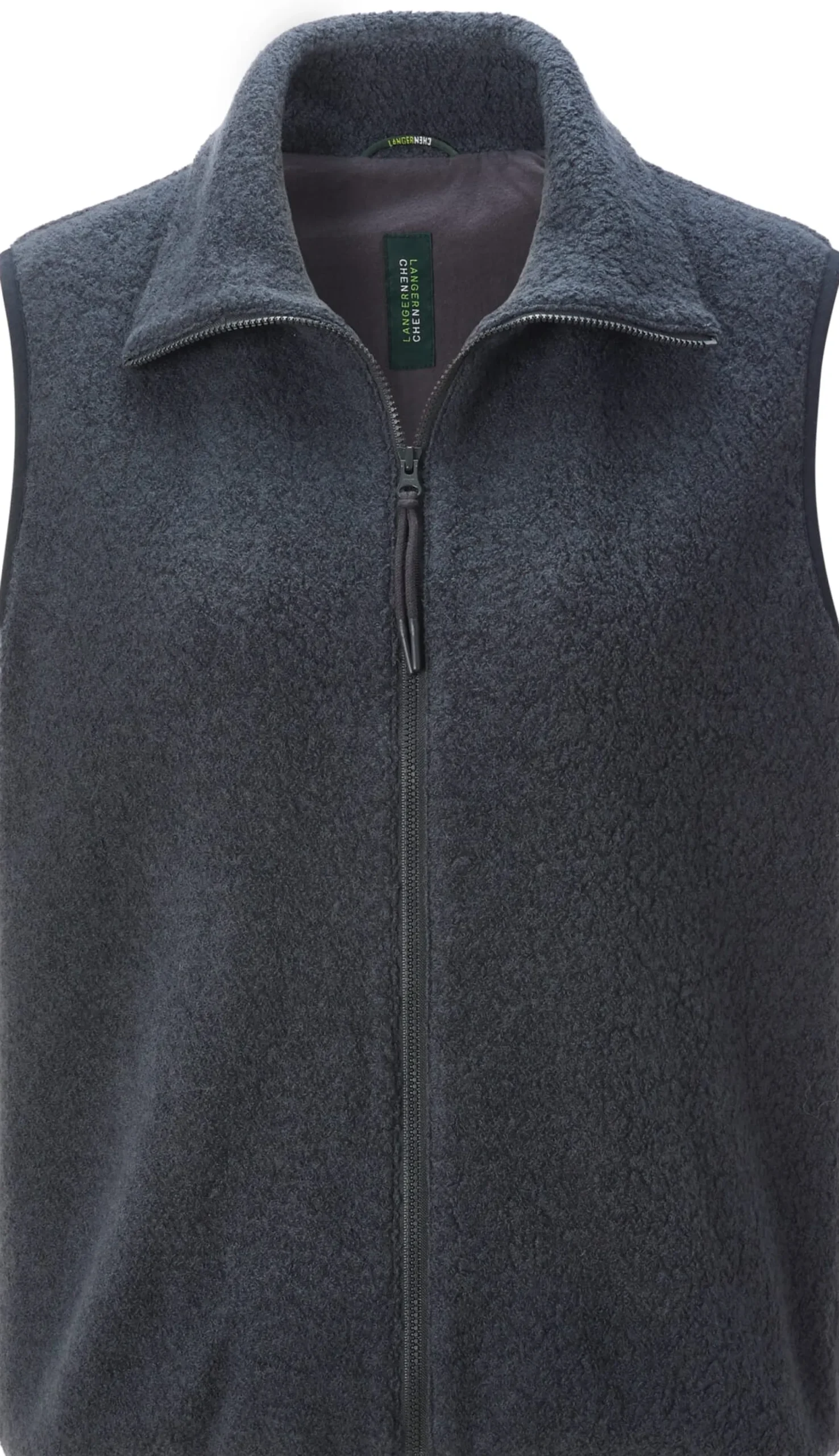 Dank legerer Passform und durchdachter Materialwahl ist diese Weste eine gute Wahl für kühle Tage. Für den Oberstoff verwendet LangerChen einen flauschigen Teddy-Stoff, der aus wärmender und temperaturausgleichender Schurwolle aus kontrolliert biologischer Tierhaltung und kontrolliert biologisch angebauter Baumwolle gefertigt ist. Hinzu kommen zwölf Prozent Polyamid, die den Stoff strapazierbarer und formbeständiger machen. Das Jerseyfutter besteht aus weicher und hautsympathischer Baumwolle, die ebenfalls aus kontrolliert biologischem Anbau stammt. Ausgestattet ist die Weste mit Stehkragen, zwei Seitennahttaschen und einer Innentasche mit Reißverschluss. Der hoch bis zum Kinn schließende Reißverschluss bietet zusätzlichen Schutz vor kühlem Wind. Rumpfsaum und Armausschnitte sind mit elastischen Bändern gefasst, was für einen guten Schluss sorgt.
