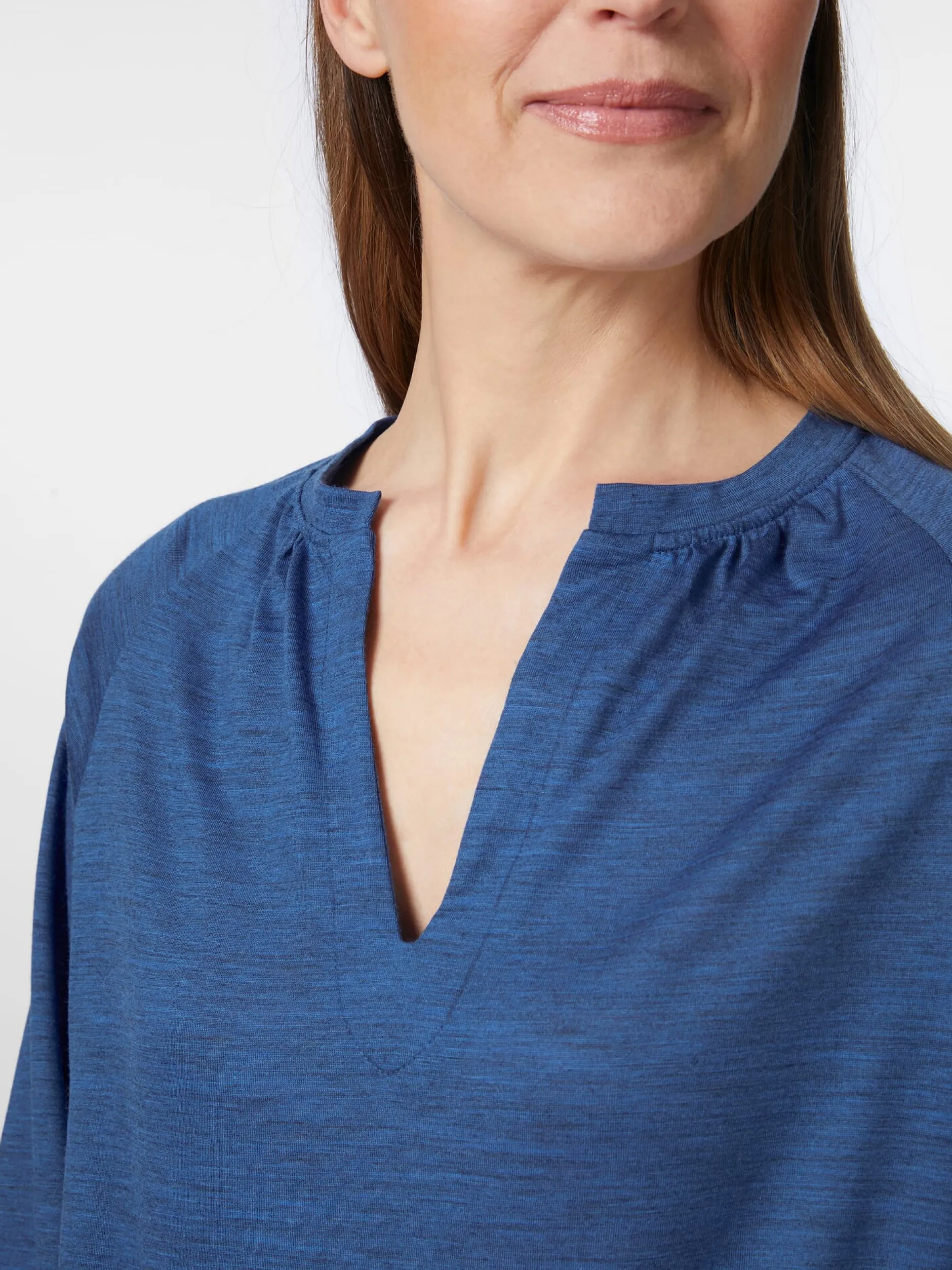 Passt zu eleganten wie zu lässigen Outfits: feminines Blusenshirt in leicht verspielter Optik: mit V-Ausschnitt und gerafften Partien am Halsausschnitt und an den elastischen Ärmelbündchen. Das feine, leichte Gestrick besteht aus reiner Schurwolle aus kontrolliert biologischer Tierhaltung – wärmend und temperaturausgleichend.