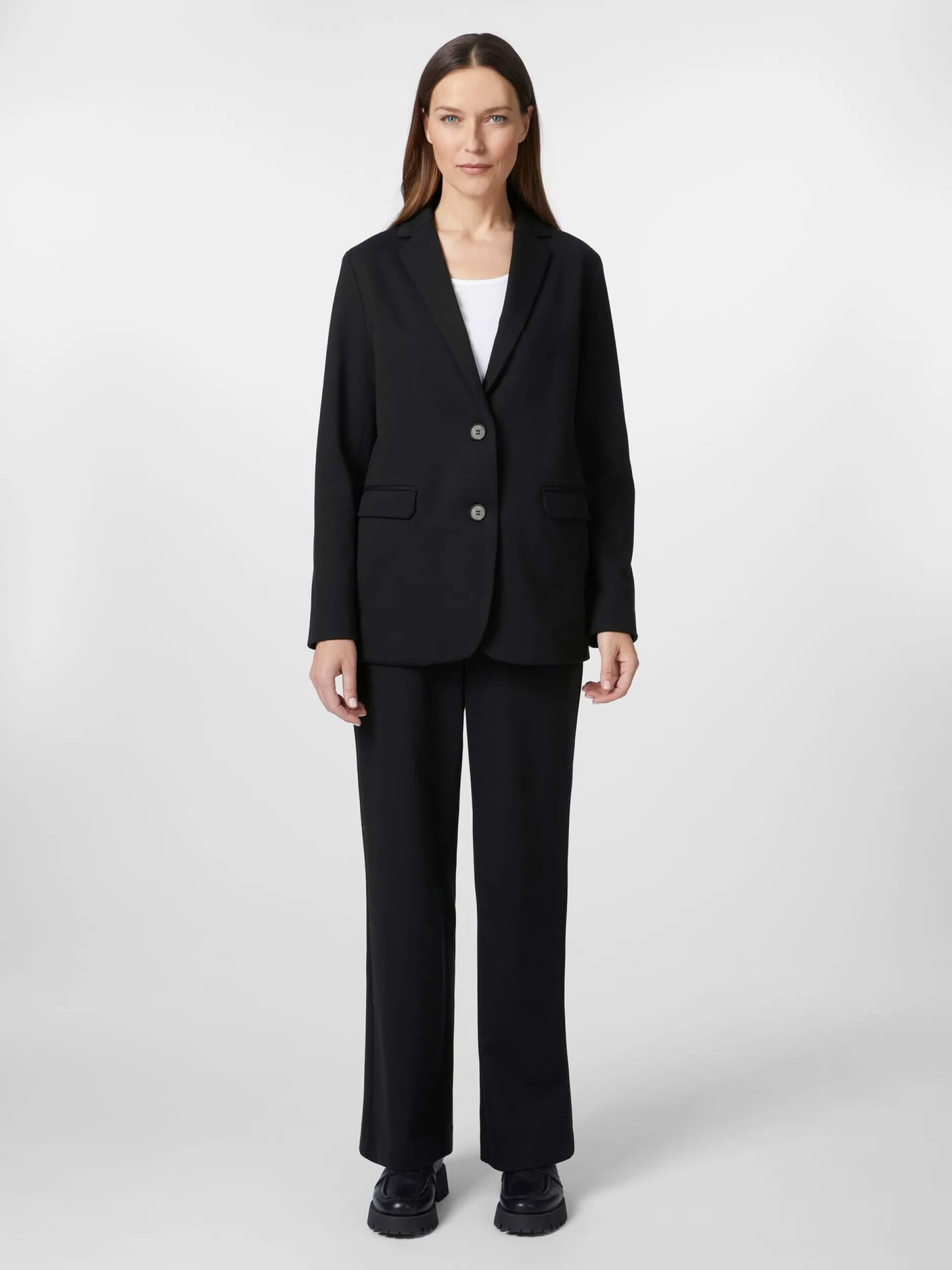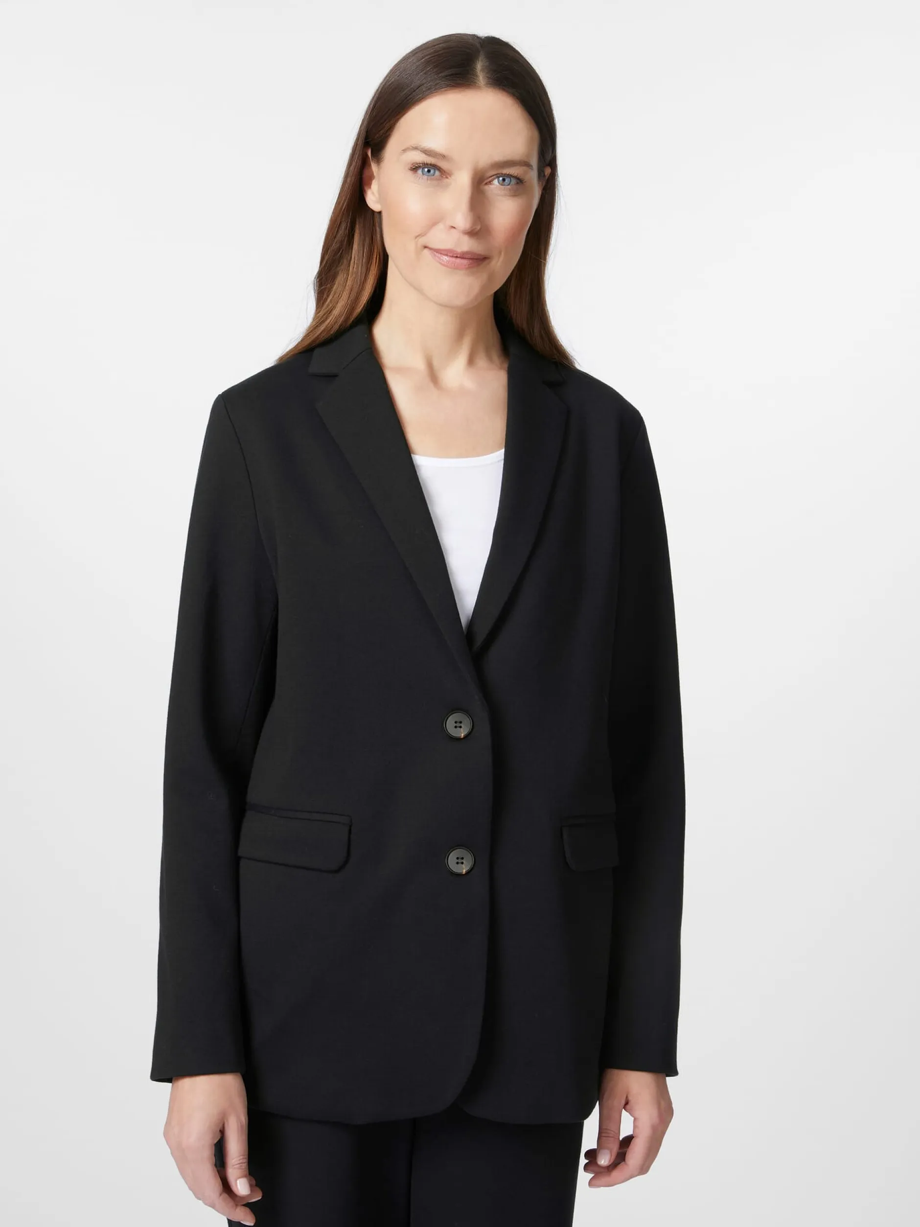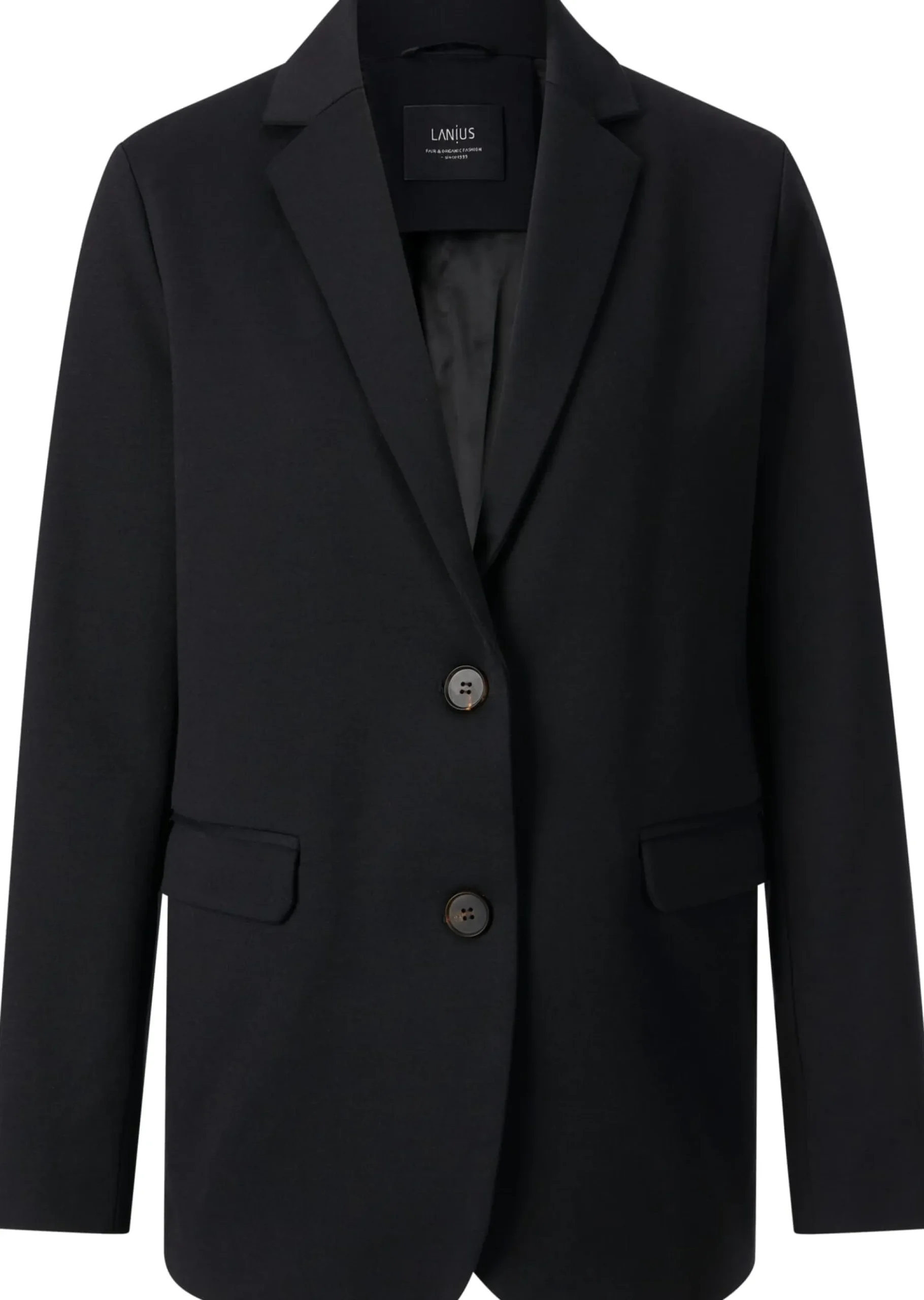 Eleganter Blazer in klassischem Schnitt: mit gerader Passform, Reverskragen, formgebender Teilungsnaht im Rücken und zwei eingesetzten Pattentaschen. Geschlossen wird er mit zwei markanten Echthornknöpfen. Nicht ganz klassisch ist hingegen das Material, das für den hohen Tragekomfort mit viel Bewegungsfreiheit sorgt. Lanius fertigt ihn aus Heavy Jersey – einem besonders schweren Interlock-Jersey, der fester, griffiger und feinmaschiger und damit strapazierbarer als normaler Jersey ist. Zudem weist er eine hohe Formbeständigkeit auf. Der Stoff wird aus unterschiedlichen Materialien gewirkt. Hier wird hautsympathische, kontrolliert biologisch angebaute Baumwolle und wärmende und temperaturausgleichende Schurwolle verwendet. Das atmungsaktive Viskosefutter liegt angenehm glatt auf der Haut und erleichtert das An- und Ausziehen. Der Blazer ist vielseitig zu kombinieren und lässt sich zu formellen Outfits tragen oder als schickes Element in ein Freizeit-Outfit integrieren.