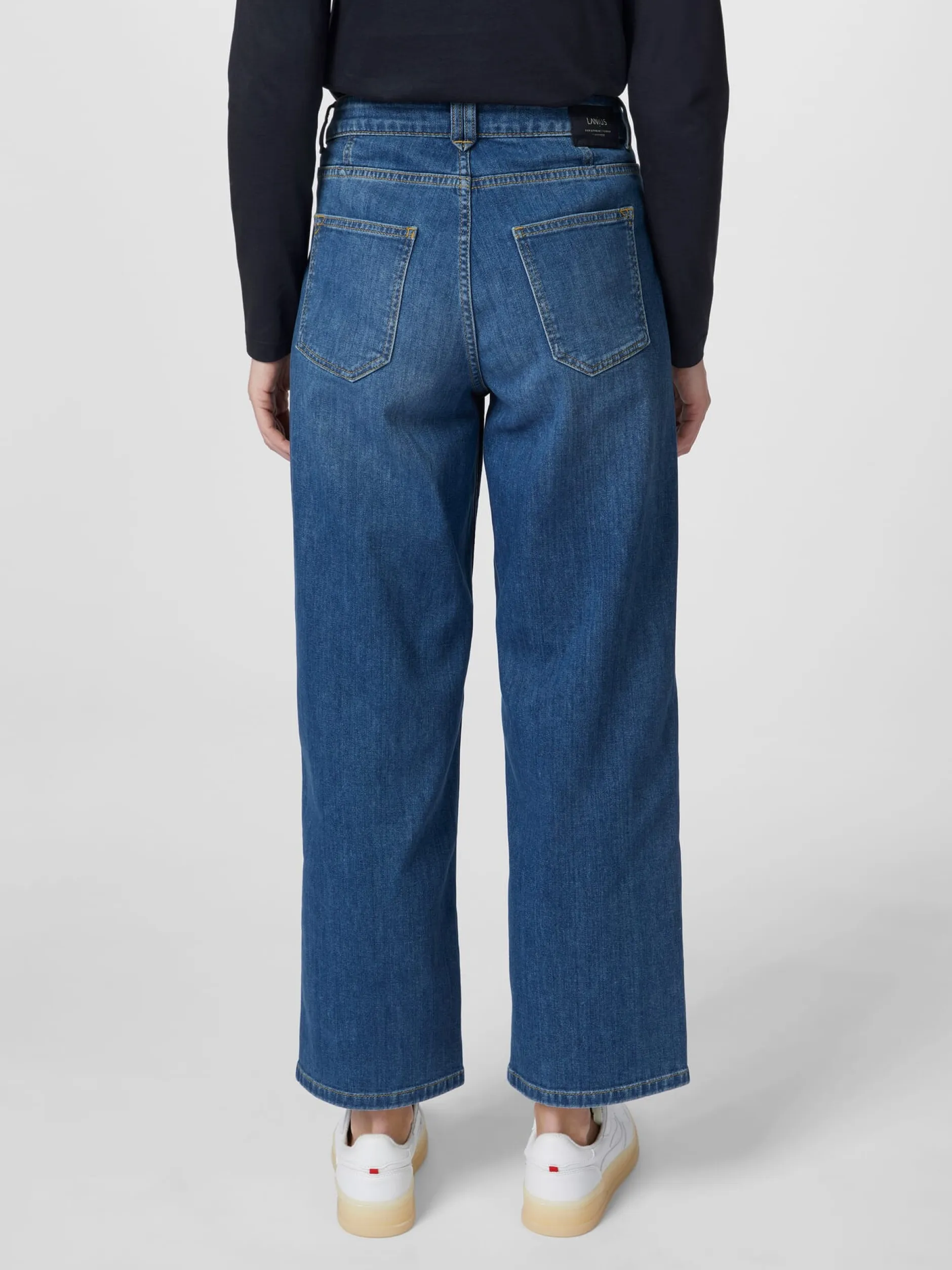 Lässige und bequeme Jeans im Used Look mit hohem Bund und gerade geschnittenem, weitem und leicht verkürztem Bein. Der weich gewaschene Denim besteht aus kontrolliert biologisch angebauter Baumwolle. Hinzu kommen etwas Elastomultiester und Elastan für mehr Elastizität und Formtreue. Die Jeans ist mit zwei Seitentaschen sowie zwei Gesäßtaschen ausgestattet und wird mittels Metallreißverschluss und Knopf geschlossen.