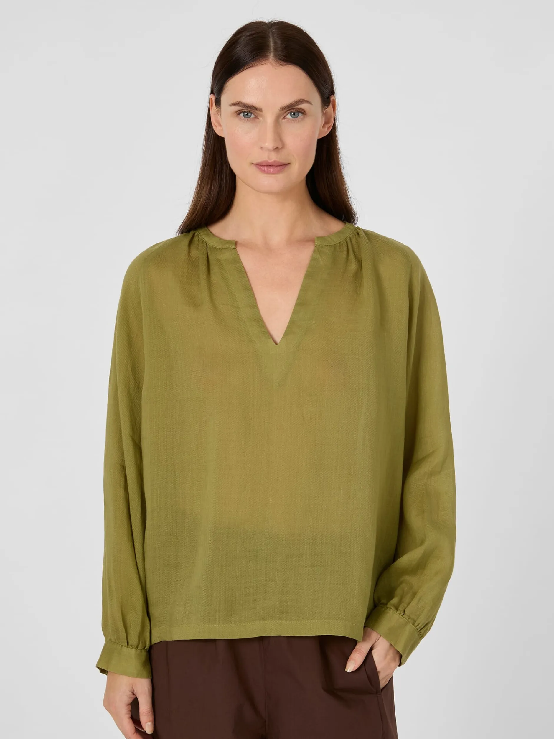 Ramie ist eine schnell wachsende Pflanze aus der Familie der Brennnesselgewächse, die beim Anbau nur wenig Wasser verbraucht. Die langen, reißfesten Fasern lassen sich zu feinen Garnen verspinnen und werden daher schon seit Jahrtausenden zu hochwertigen Textilien verarbeitet. Gewebe daraus sind überaus strapazierbar, dabei luftig-leicht und angenehm griffig. Ähnlich wie Leinen können sie viel Feuchtigkeit aufnehmen schnell wieder nach außen ableiten, was sie besonders atmungsaktiv macht – ideal für eine sommerliche Schlupfbluse wie diese. Lanius fertigt sie aus reiner, seidig glänzender Ramie. Sie ist in lockerer Passform gearbeitet, mit V-Ausschnitt und Raglanärmeln. Der Saum ist vorn gerade und hinten leicht gerundet. Für einen schönen femininen Look sorgen die gerafften Partien vorn und hinten am Ausschnitt und an den Ärmeln.