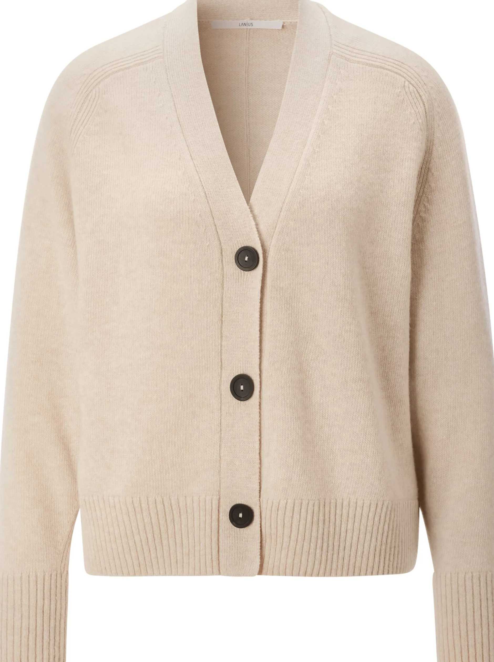 Der zehnprozentige Kaschmiranteil macht das Gestrick dieser Strickjacke besonders schmiegsam. Die restlichen 90 Prozent sind Schurwolle aus kontrolliert biologischer Tierhaltung. Das Gestrick, das einen schönen Melangeton zeigt, ist ebenso wärmend wie temperaturausgleichend und atmungsaktiv. Dank dieser natürlichen Materialeigenschaften und der leger gehaltenen Passform ist die glattgestrickte Jacke so gemütlich, dass sie sicherlich zu einer Ihrer liebsten Begleiterinnen werden wird – in der Übergangszeit wie im Winter, an kühlen Frühlings- oder Sommertagen. Gearbeitet ist sie mit Raglanärmeln und breitem Rippenstrick an Ärmeln und Rumpf. Die nach außen verlegte Langsteilungsnaht im Rücken setzt einen markanten optischen Akzent. Große, farblich kontrastierende Hornknöpfe runden das Design ab.