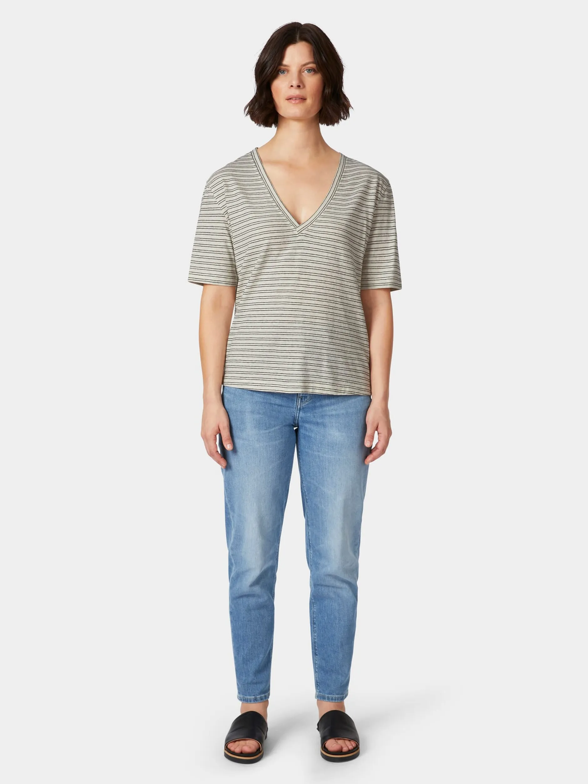 Hanf war einst das textile Material der Wahl. Gut, dass die Textilindustrie sich heute wieder auf die Nutzung der alten Kulturpflanze besinnt. Denn bei Hanf handelt sich um eine schnell nachwachsende, anspruchslose Pflanze, die beim Anbau wenig Wasser und keine Herbizide, Pestizide oder synthetische Dünger benötigt. Dieses T-Shirt kombiniert die natürlichen Vorteile von Hanf und kontrolliert biologisch angebauter Baumwolle. Der feine Stoff bietet ein angenehmes Tragegefühl und besitzt eine hervorragende Atmungsaktivität – ideal für die warme Jahreszeit. Das gewirkte, leicht unregelmäßige Ringelmuster verleiht dem T-Shirt lässigen Look und der tiefe V-Ausschnitt betont das Dekolleté. Alles in allem der perfekte Begleiter für entspannte Freizeitoutfits und ein gutes Basisstück für elegante Lagenlooks.
