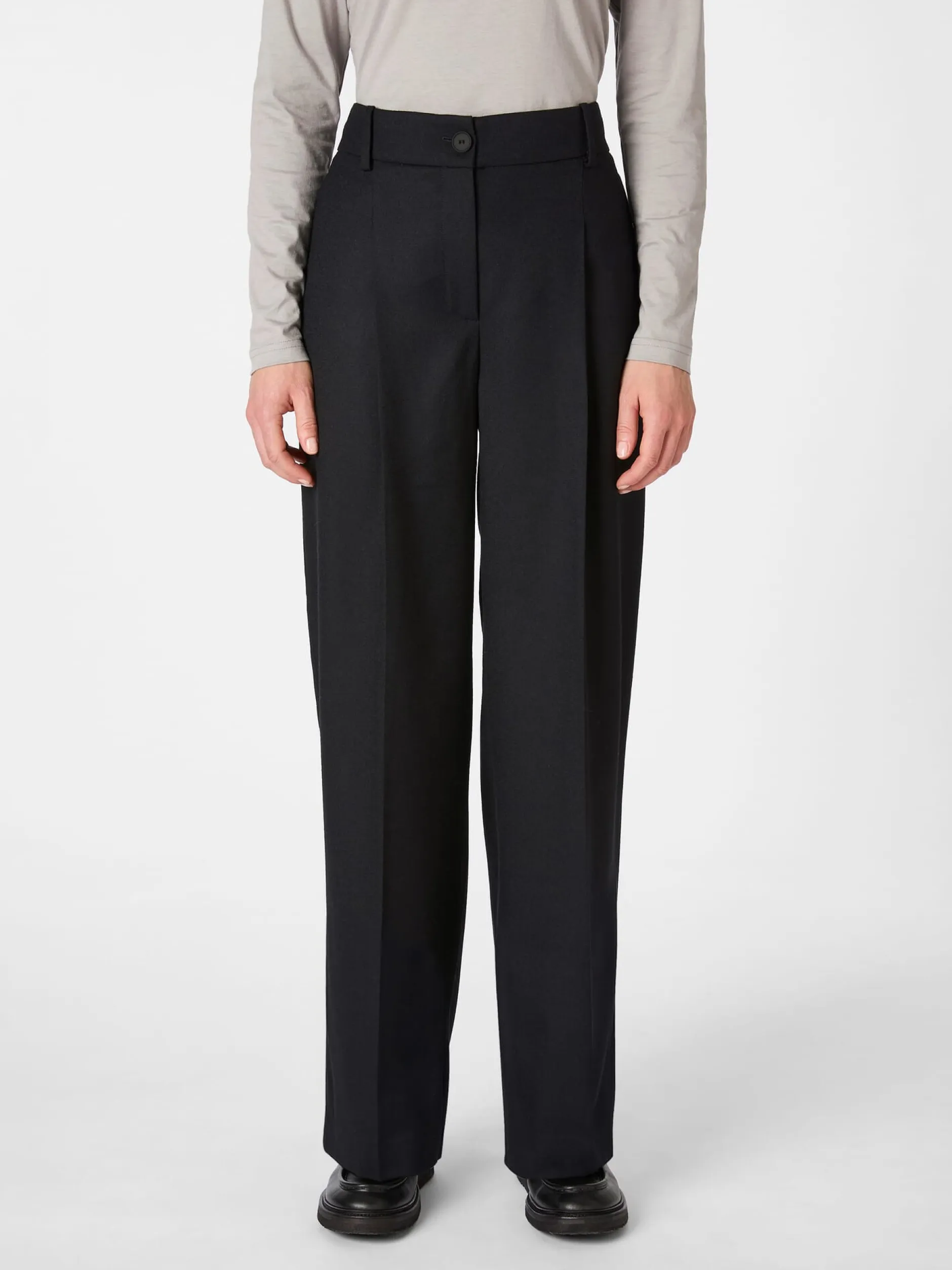 Schlicht und klassisch im Stil sorgt diese Wollhose für einen eleganten Auftritt. Auch in puncto Materialwahl weiß sie zu überzeugen. Lanius fertigt sie aus reiner Schurwolle aus kontrolliert biologischer Tierhaltung. Das wärmende Gewebe hat einen schmiegsamen Griff und zeigt einen feinen Köpergrat. Dank des komfortablen Schnitts mit weitem, geradem Bein, je einer Bundfalte auf jeder Seite und Bügelfalten vorn und hinten formt die Hose eine schmeichelhafte Silhouette. Geschlossen wird sie mit Reißverschluss und einem markanten Hornknopf. Die seitlichen Taschen bieten nicht nur Platz für Kleinigkeiten, sondern fügen sich harmonisch in das Gesamtbild ein. Blinde Gesäßtaschen runden das Design ab.