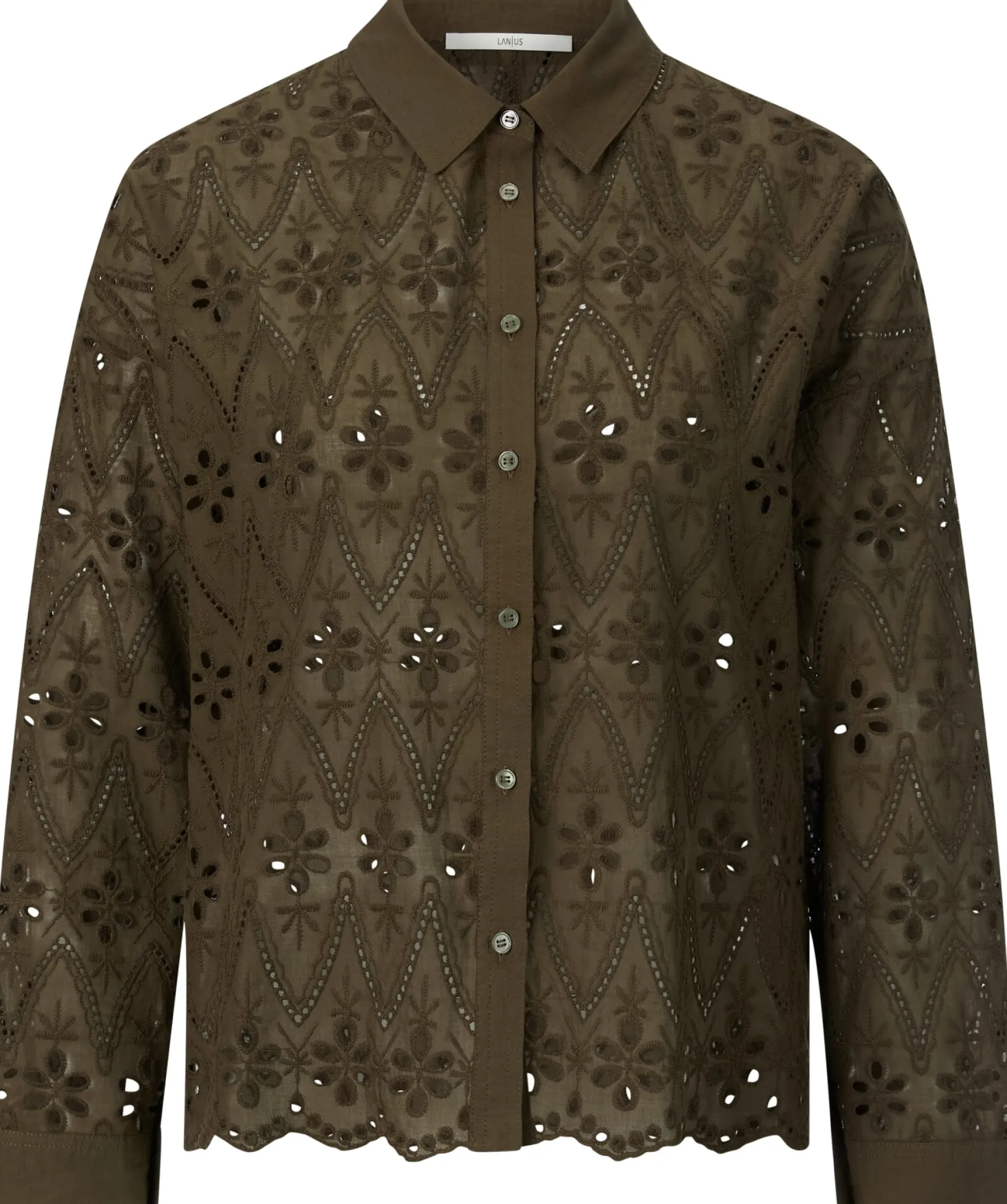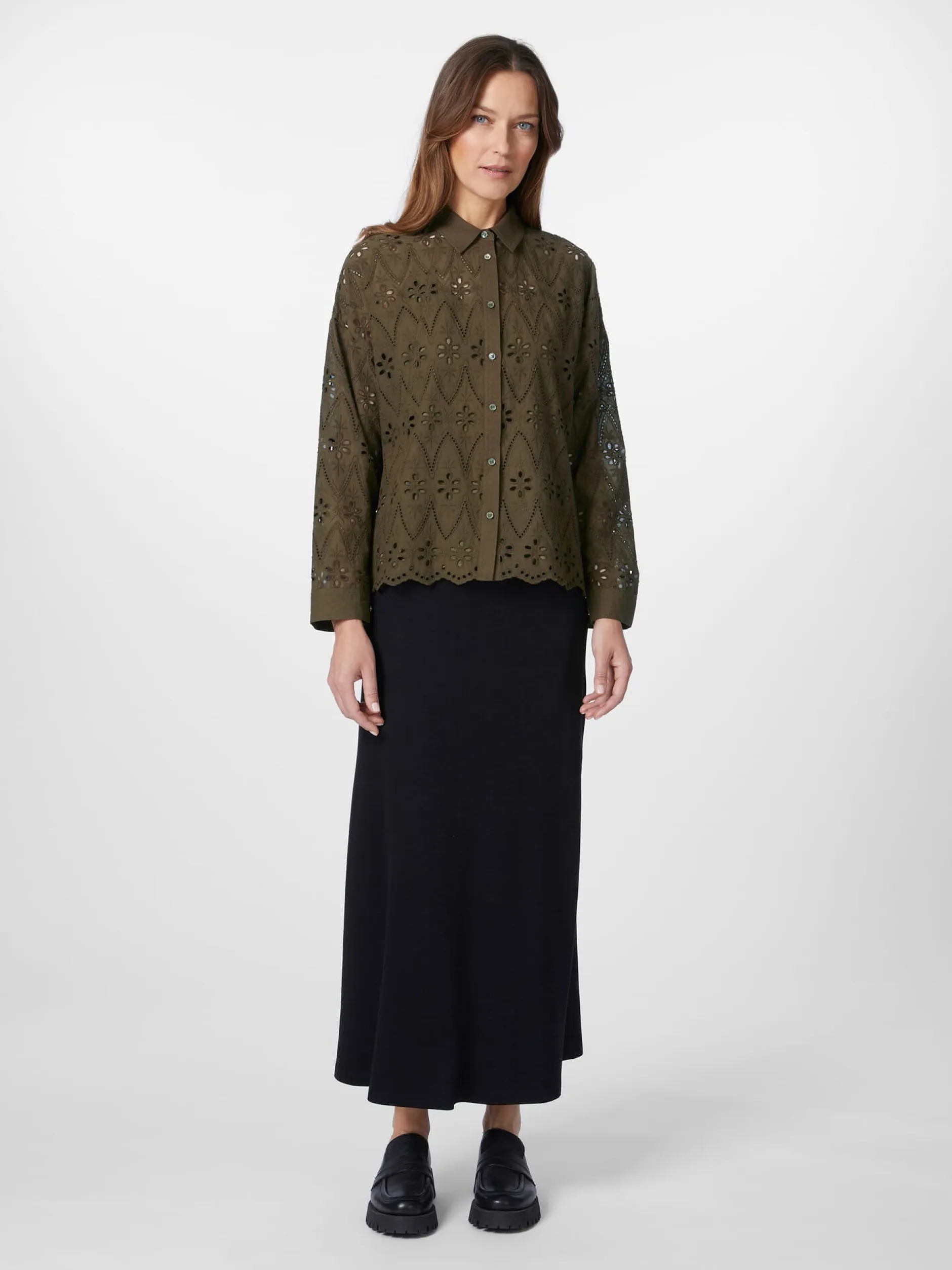 Das durchbrochene Muster mit floralen und geometrischen Motiven verleiht dieser Bluse eine feine Transparenz. Der Schnitt ist gerade und leger gehalten und der Blusenstoff besteht aus hautsympathischer, kontrolliert biologisch angebauter Baumwolle, was für einen hohen Tragekomfort sorgt. Gearbeitet ist die Bluse mit durchgehender Knopfleiste, klassischem Hemdkragen und langen Ärmeln mit geknöpften Manschetten. Der gewellte Saum und die grün schimmernden Perlmuttknöpfe runden das Design ab. Für weniger Transparenz lässt sich die Bluse mit einem Unterzieh-Top kombinieren – am besten in ähnlicher Farbstellung oder in Schwarz.