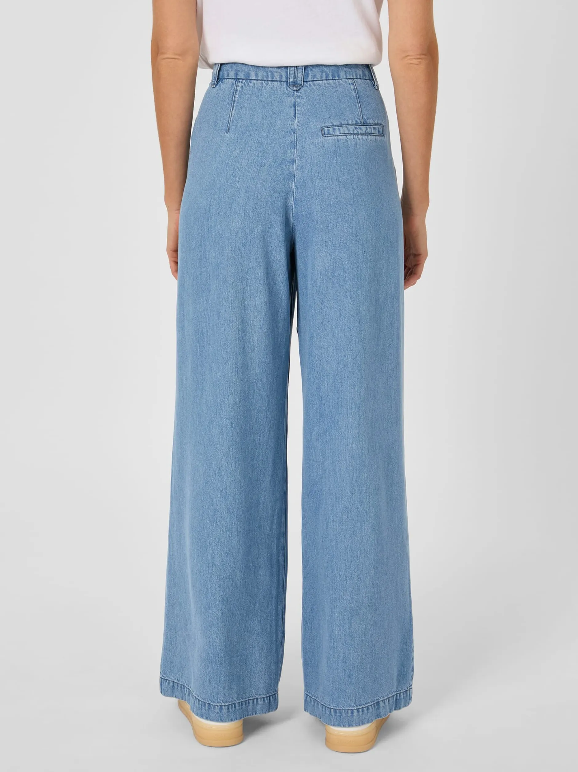 Jeanshosen bestehen gewöhnlich aus Baumwolle, dieses lässige Modell wird jedoch aus reinem Lyocell (TENCEL™) gefertigt, einer Regeneratfaser, die aus Holz gewonnen wird, das aus zertifizierten und kontrollierten Quellen stammt. Das Lyocell-Gewebe liegt schmiegsam auf der Haut und hat einen schönen weichen Fall. Zudem ist es besonders atmungsaktiv, daher trägt sich die Jeans auch bei höheren Temperaturen sehr angenehm. Sie ist mit mittelhohem Bund, sehr weitem Bein, zwei Seitentaschen und einer blinden Gesäßtasche gearbeitet und wird mit Reißverschluss und Knopf geschlossen. Eine Bundfalte auf jeder Seite sorgt für einen guten und bequemen Sitz.