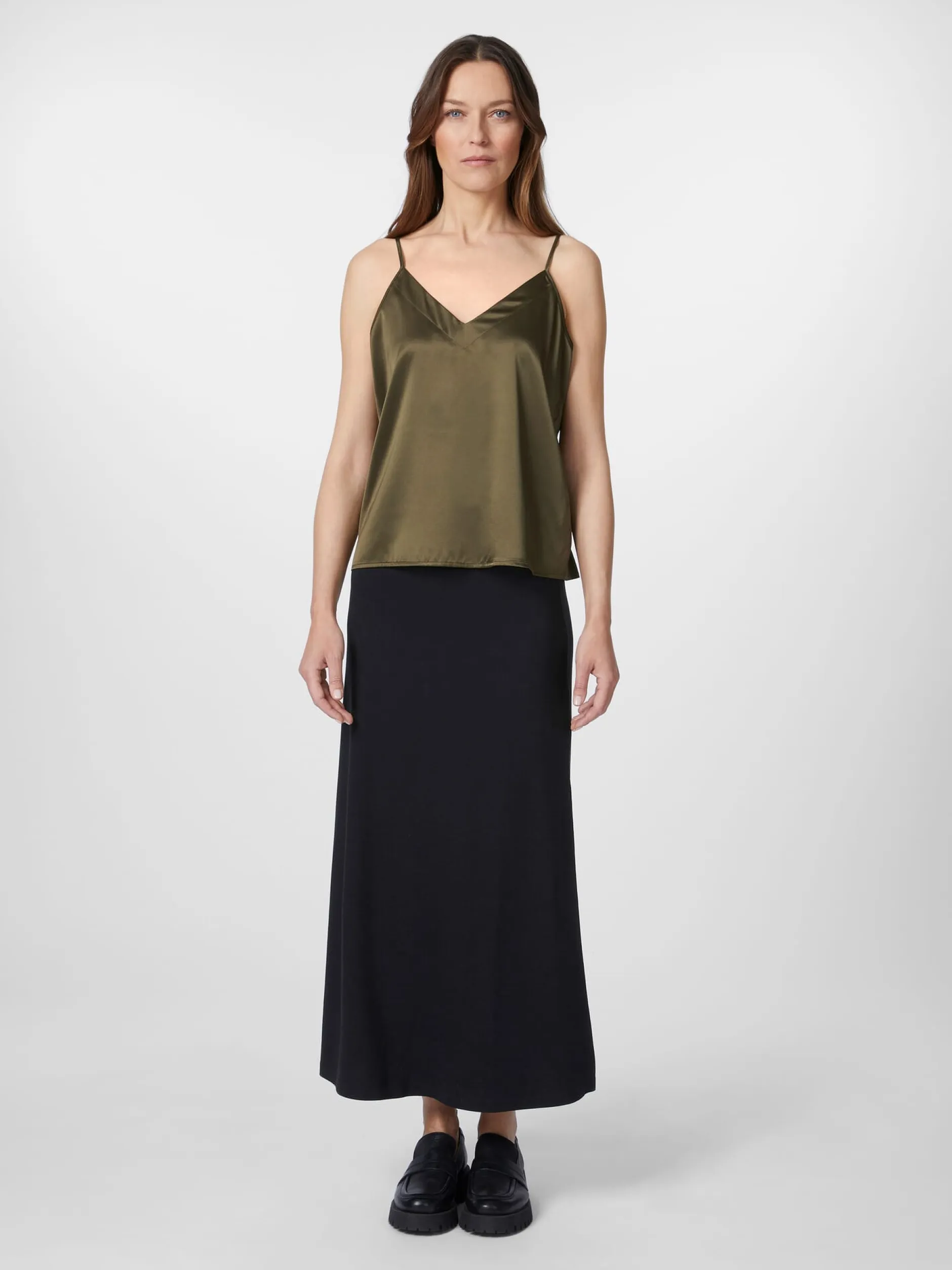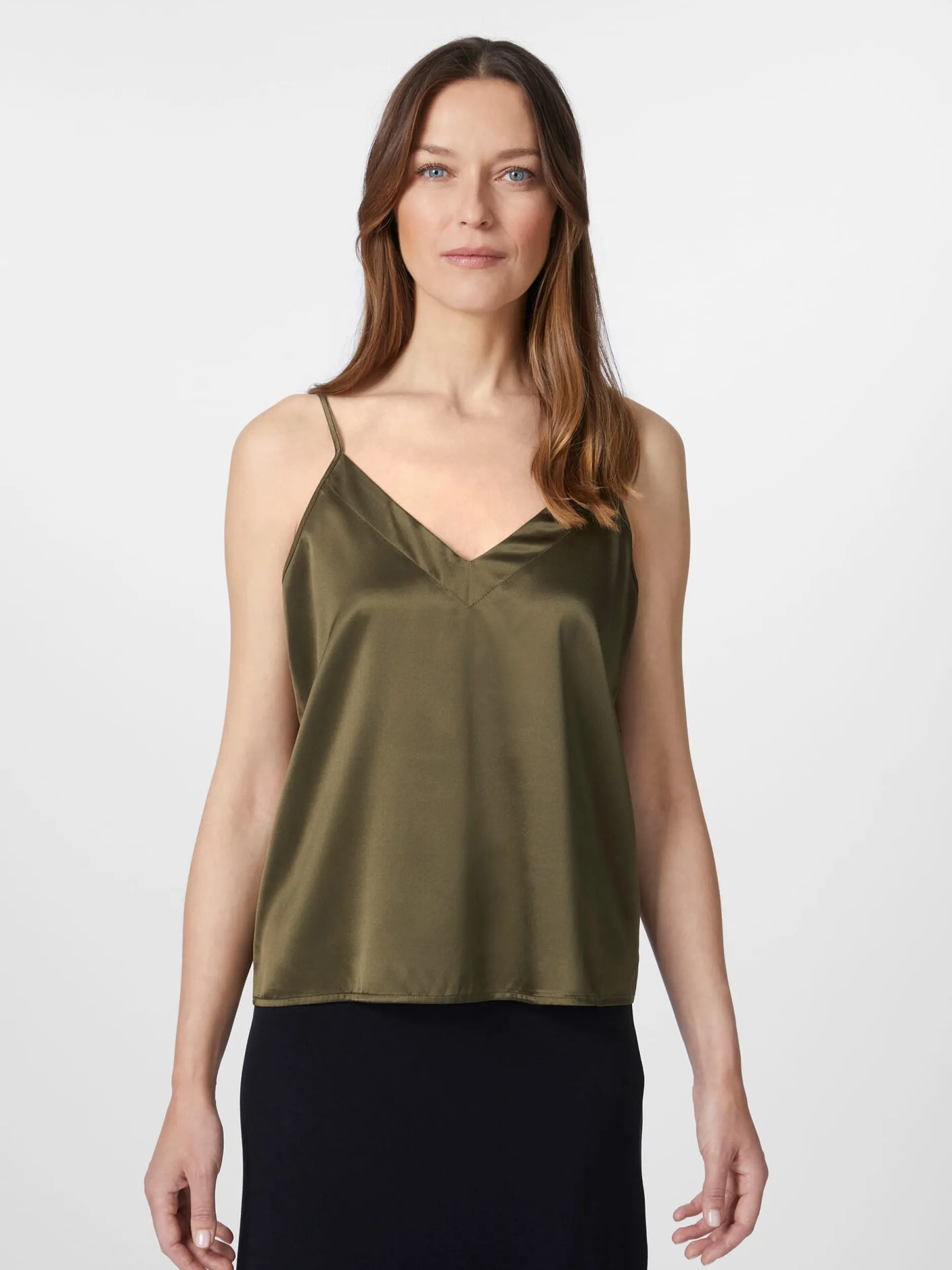 Dieses zeitlos elegante Top liegt zart auf der Haut und umspielt die Figur. Lanius fertigt es aus einem weich fließenden und angenehm glatten Seidensatin, dem eine Beigabe von Elastan mehr Elastizität und Formtreue verleiht. Gearbeitet ist das Top mit Spaghettiträgern und einem V-Ausschnitt vorn und hinten. An warmen Tagen lässt es sich solo tragen, genauso gut kann es mit einem Blazer kombiniert werden.