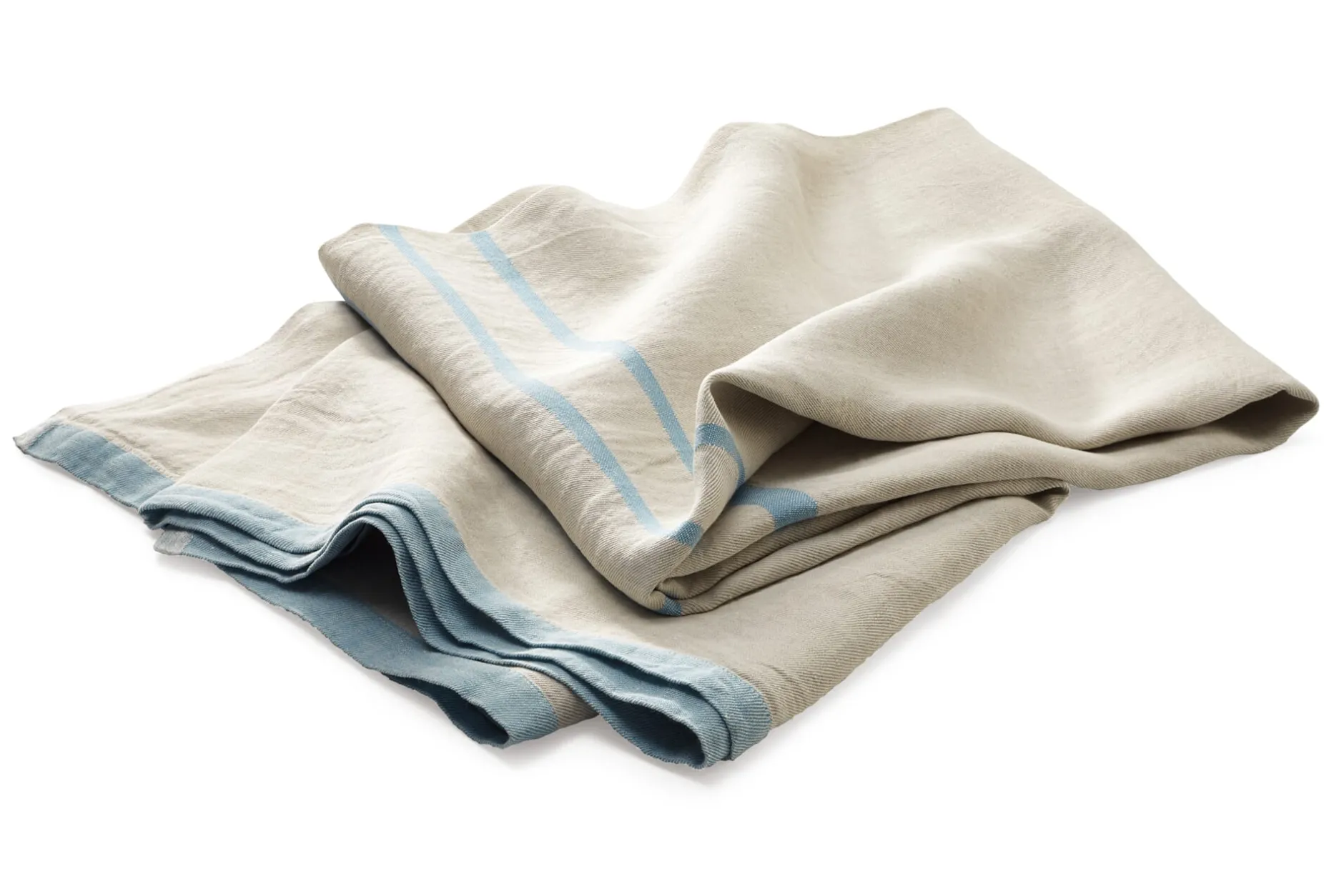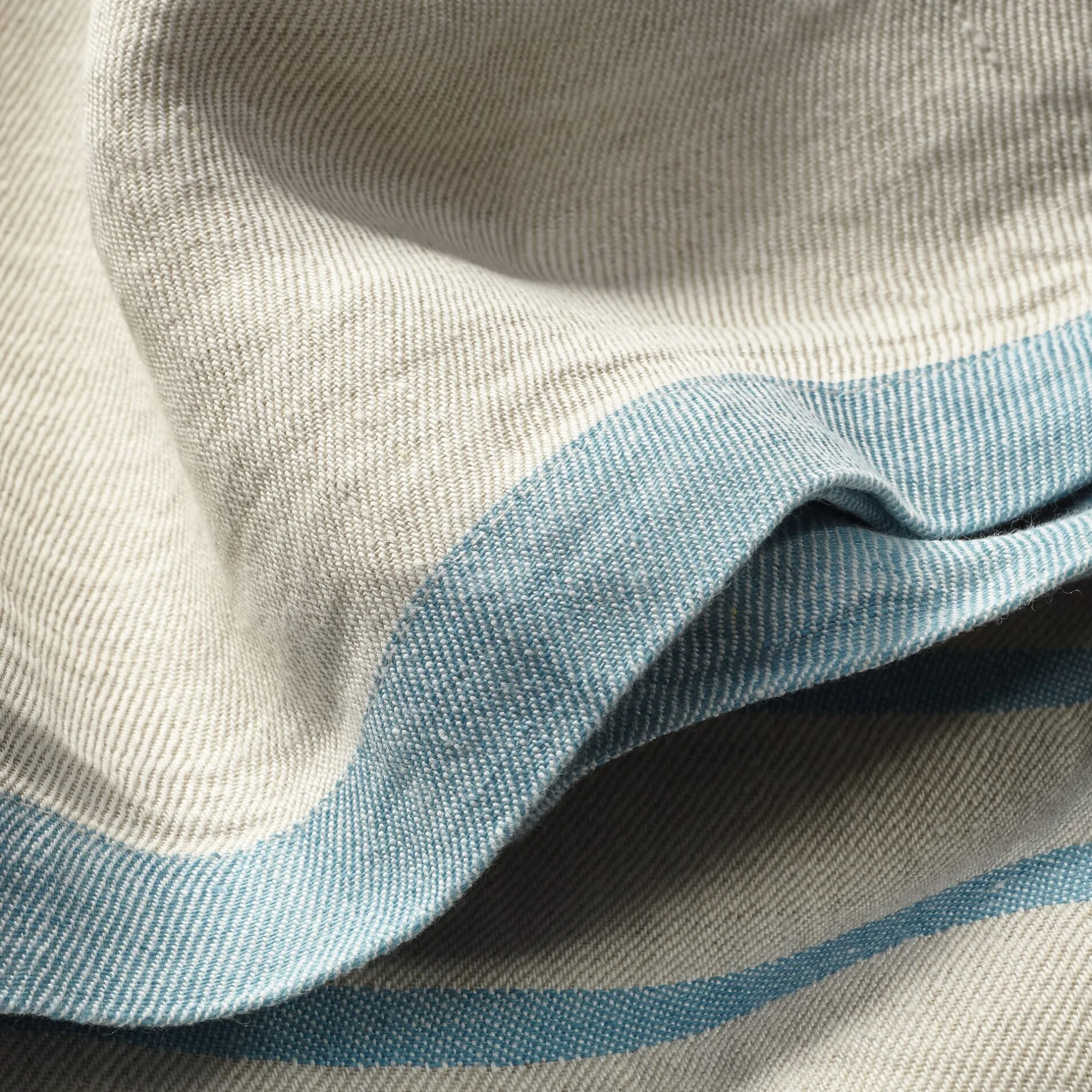 Die finnische Leinenweberei Lapuan Kankurit webt den Fond des Tuchs aus kräftigem, ungefärbtem Leinen, die Streifen aus gefärbtem Leinengarn. Mit einem Gesamtgewicht von etwa 780 g ist es nicht zu schwer fürs Gepäck, das Gewebe hingegen ist kräftig genug, um allen Anforderungen unterwegs standzuhalten. Leinen ist vor allem im Sommer angenehm, da es rasch viel Feuchtigkeit aufnehmen und ebenso schnell wieder abgeben kann – es fühlt sich angenehm kühlend an, ist zudem antistatisch und aufgrund der glatten Faseroberfläche pollen-, staub- und schmutzabweisend. Das Tuch ist sanforisiert und hat daher einen weichen, schmiegsamen Griff.