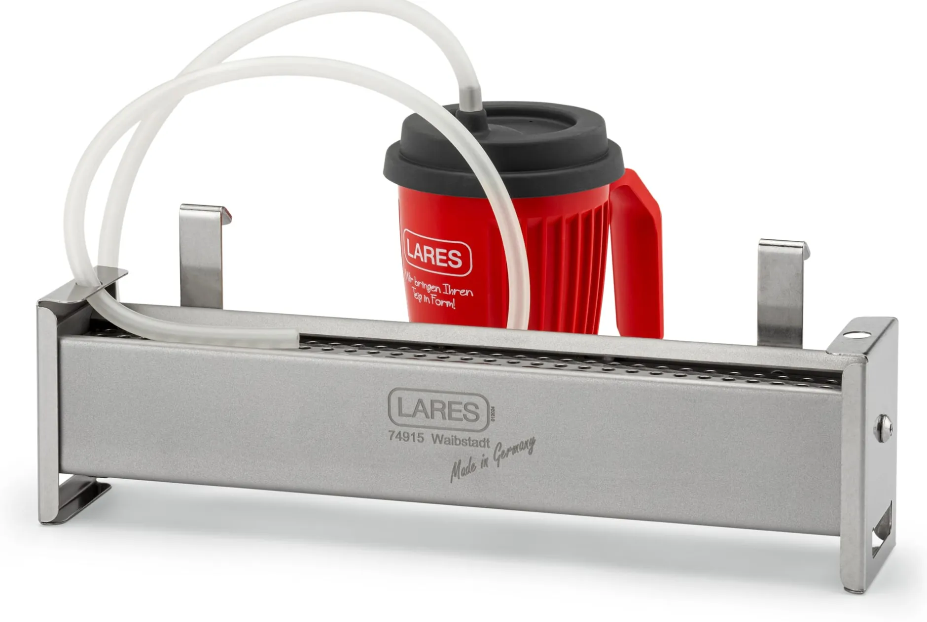 Als Ausweg aus dem wackeligen Improvisieren und Hantieren mit vorgeheizten und befeuchteten Backblechen, feuerfesten Schälchen mit Wasser und/oder Lavasteinen hat der Schweizer Marcel Paa – gelernter Bäcker- und Konditormeister, You-Tuber und Brot-Sommelier – gemeinsam mit dem deutschen Hersteller Lares diesen Dampferzeuger für Hobbybäcker*innen entwickelt. Das Prinzip ist so simpel wie überzeugend (und überzeugend verbrühsicher): Eine mit Quarzsteinen befüllte Edelstahlform wird im Backofen platziert und mit vorgeheizt. Sie können wählen, ob Sie die Form auf ihre Füßchen stellen oder mithilfe der beiliegenden Haken seitlich einhängen möchten. Nun fädeln Sie den ebenfalls beiliegende Wasserschlauch – aus Gründen der Hitzebeständigkeit ein Silikonschlauch – ein, und zwar so, dass das eine Schlauchende in die Form hinein- und das andere aus ihrem Backofen herausragt. Schließen Sie die Ofentür, und voilà: So ist selbst das mehrfache Schwaden oder Bedampfen möglich, ohne dass Sie Ihren Ofen während des Backvorganges öffnen müssen. Ein Wasserbecher mit Deckel wird mitgeliefert, den Sie tropfsicher an den Wasserschlauch anschließen können: für die besten Sonntagsbrötchen und das schmackhafteste Sauerteigbrot, das sie je selbst gebacken haben.