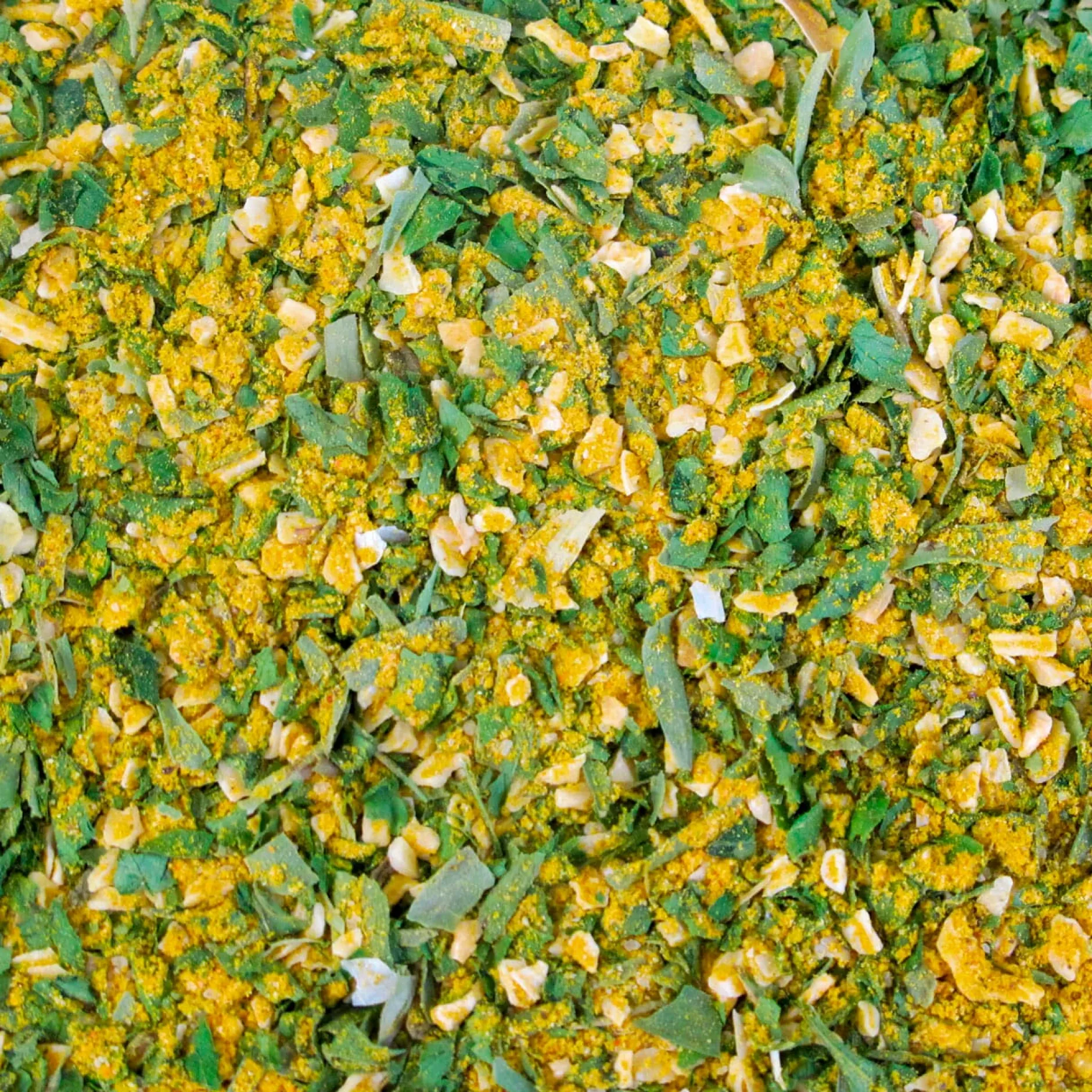 Zwiebeln, Meersalz, 12,5% Knoblauch, Kurkuma, Petersilie, Karotten, Sellerie, Currypulver, Pfeffer, Estragon, Säuerungsmittel: Zitronensäure