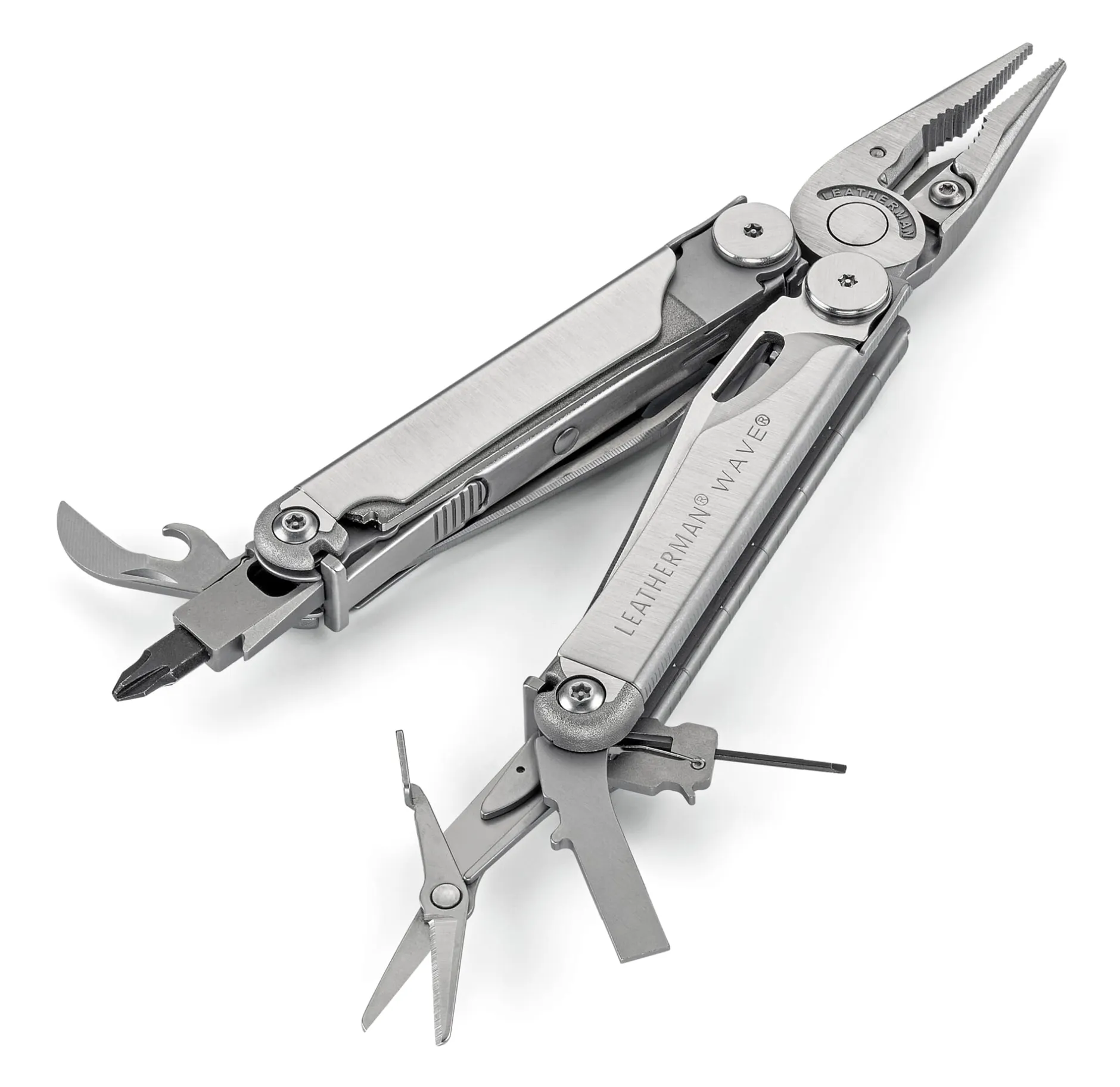 Ein Klassiker unter den Leatherman®, in optimierter Form, denn das Wave+ kommt mit auswechselbaren Drahtschneidern. Viele Werkzeuge sind von außen zugänglich, sodass das zugeklappte Tool wie ein Taschenmesser funktioniert: Eine Säge, ein Wellenschliffmesser, eine Feile für Holz oder Metall, eine diamantbeschichtete Feile und ein Messer lassen sich ausklappen. Das geöffnete Werkzeug hält eine Kombizange (Spitz- und normale Zange), eine Crimpzange, eine Schere mit Federbetätigung, einen mittleren Schraubendreher, einen großen und kleinen Bithalter, einen Draht- und einen Hartdrahtschneider, eine Abisolierklinge, einen Dosen- und Flaschenöffner sowie ein Lineal vor. Mitgelieferte Bits: eine Uhrmacher-Schraubendreher sowie einen 1/2″- und einen 3/16″-Kreuzschlitz-Schraubendreher. Mit Anhängeöse.