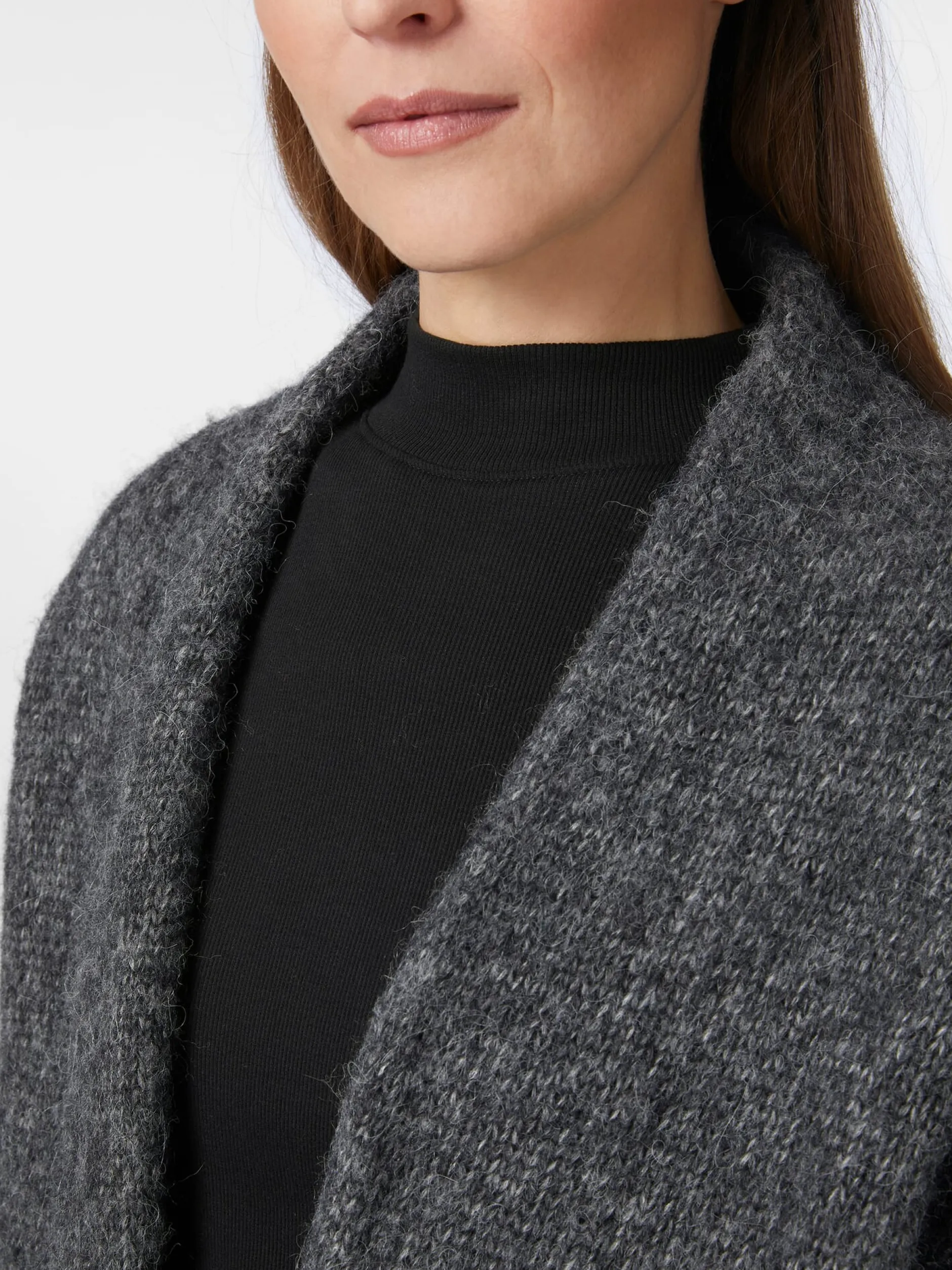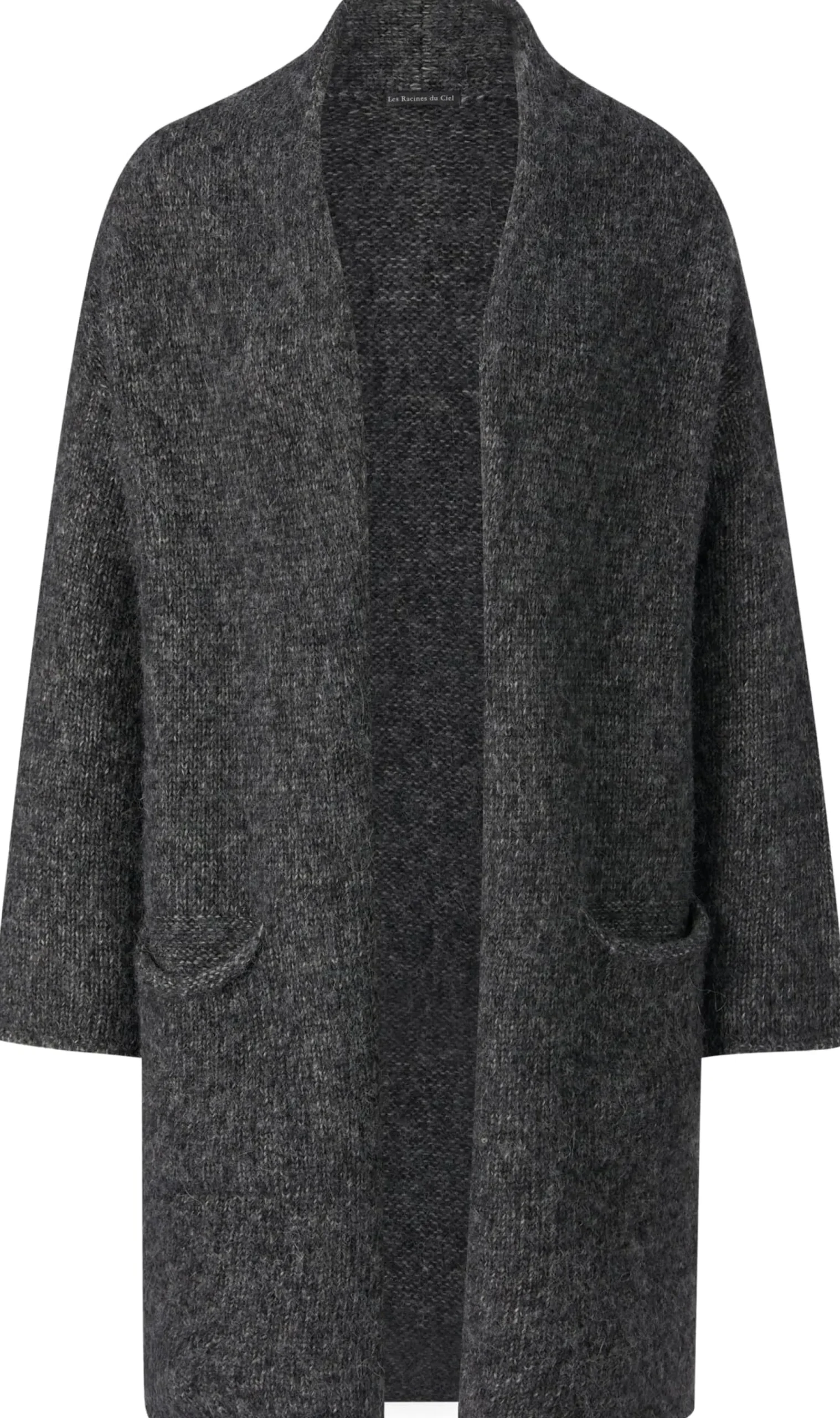 Diese lange, offen zu tragende Strickjacke fertigt Les Racines du Ciel aus nahezu gleichen Teilen von Alpakahaar und kontrolliert biologisch angebauter Baumwolle. Die Materialkombination verleiht dem voluminösen Gestrick hervorragende Trageeigenschaften: es ist wärmend und temperaturausgleichend, dabei nicht zu schwer, und besonders weich im Griff – geradezu ideal für die Übergangszeit. Und da Alpakahaar besonders feine Fasern besitzt und dazu noch kaum Lanolin enthält, werden sich selbst Menschen, die empfindlich oder sogar allergisch auf Wolle reagieren, in dieser Langstrickjacke rundum wohl fühlen. Sie ist knopflos und ohne Gürtel gearbeitet und mit zwei eingestrickten Taschen mit Rollsäumen ausgestattet.