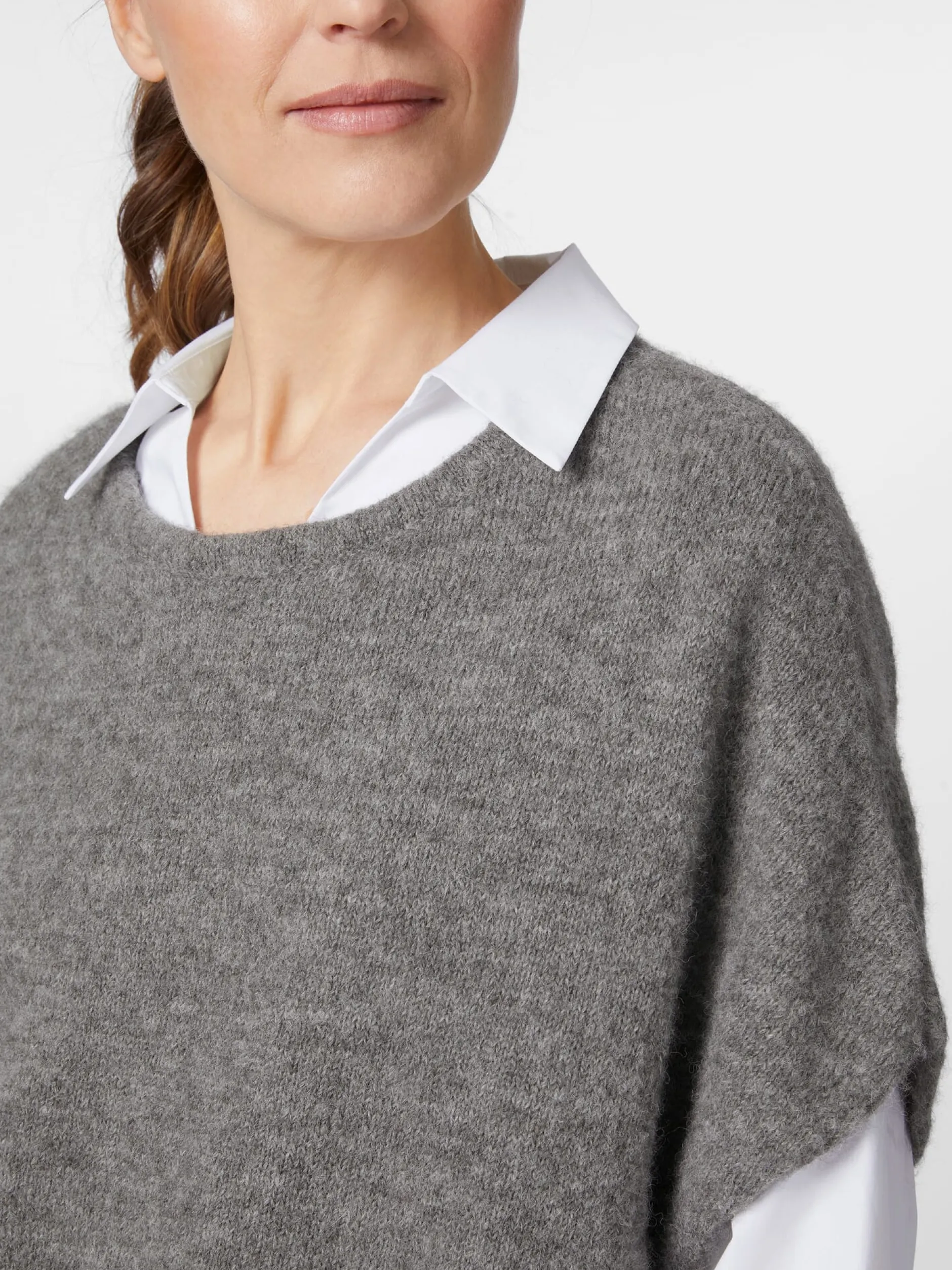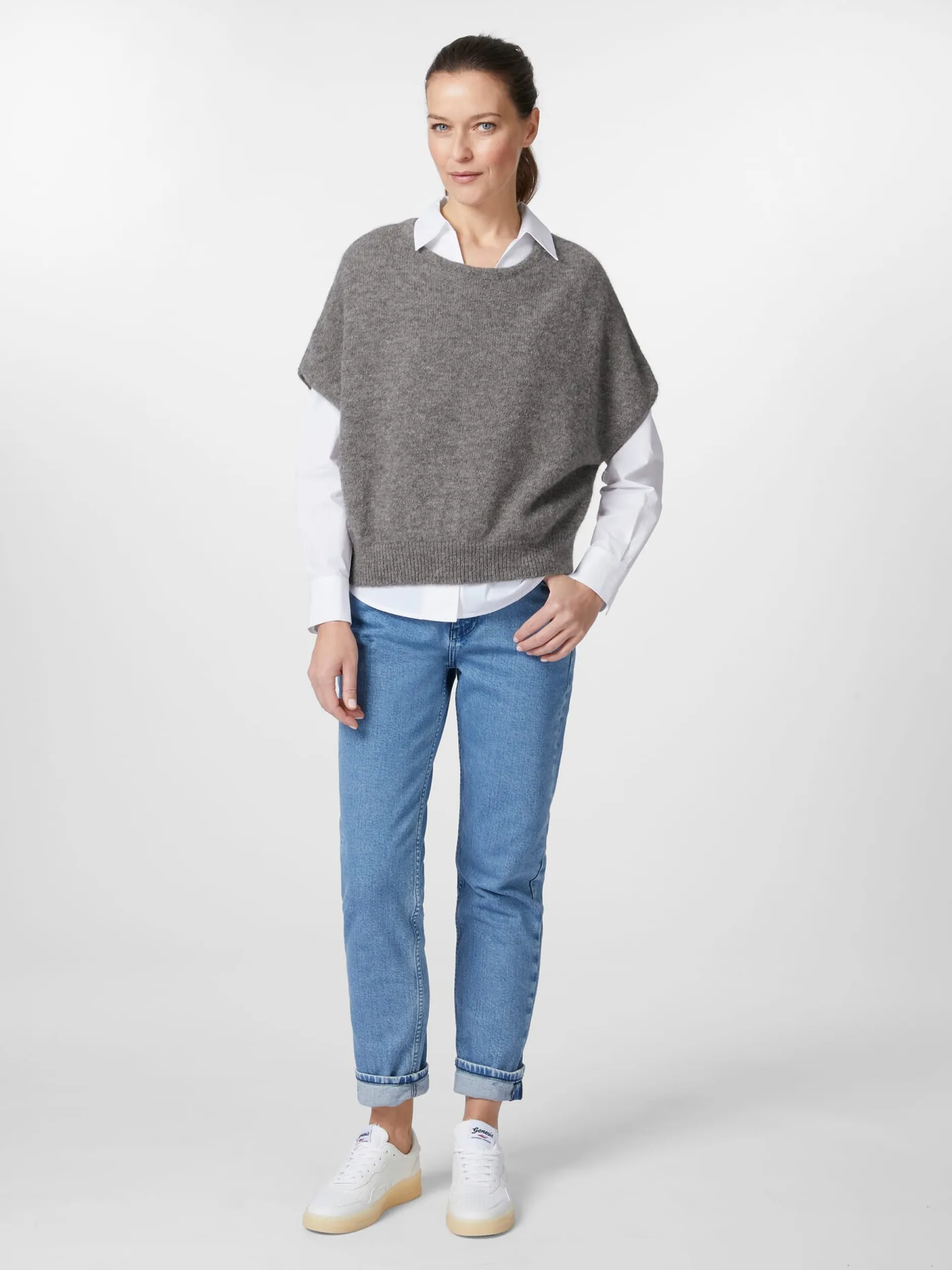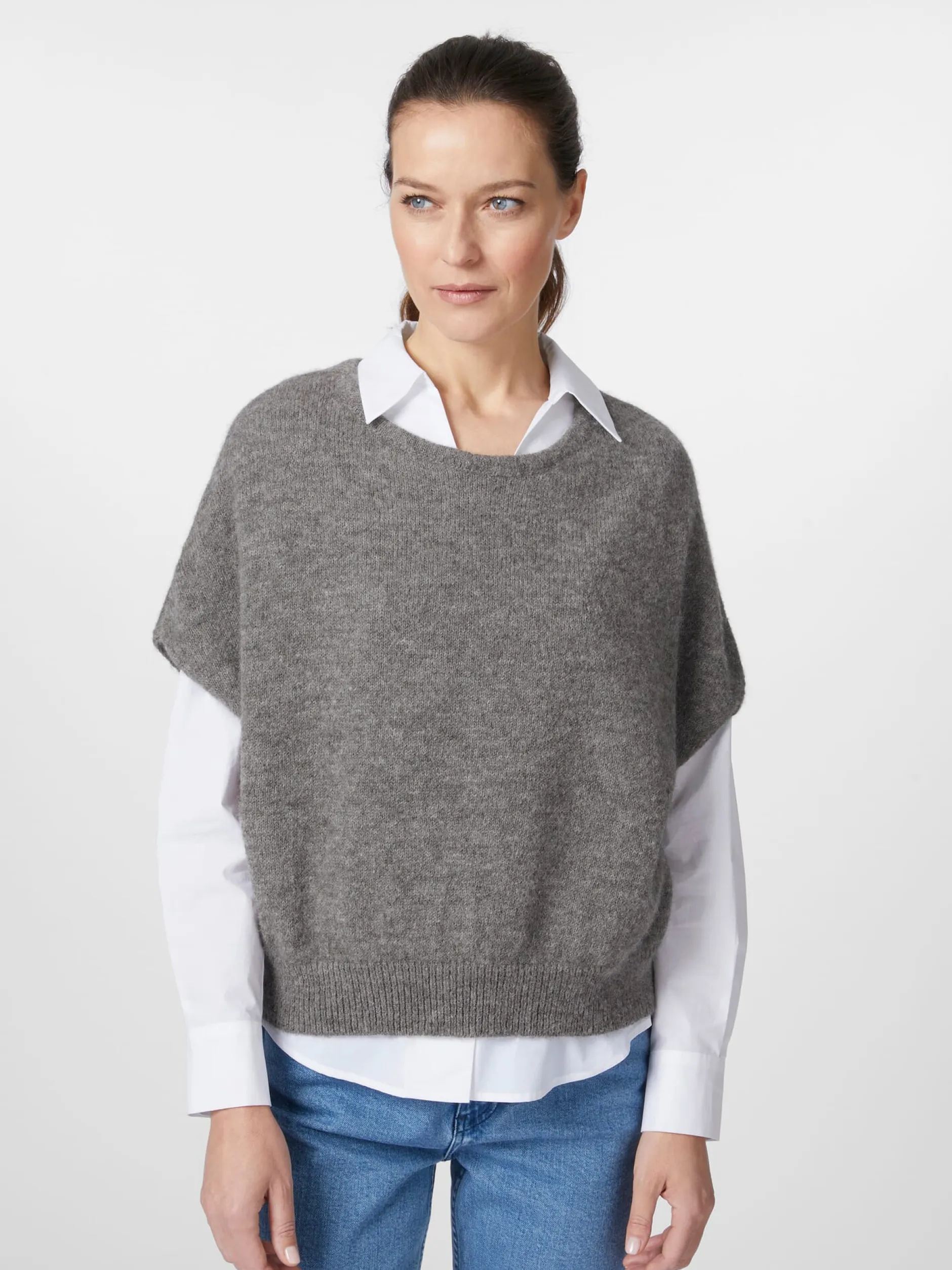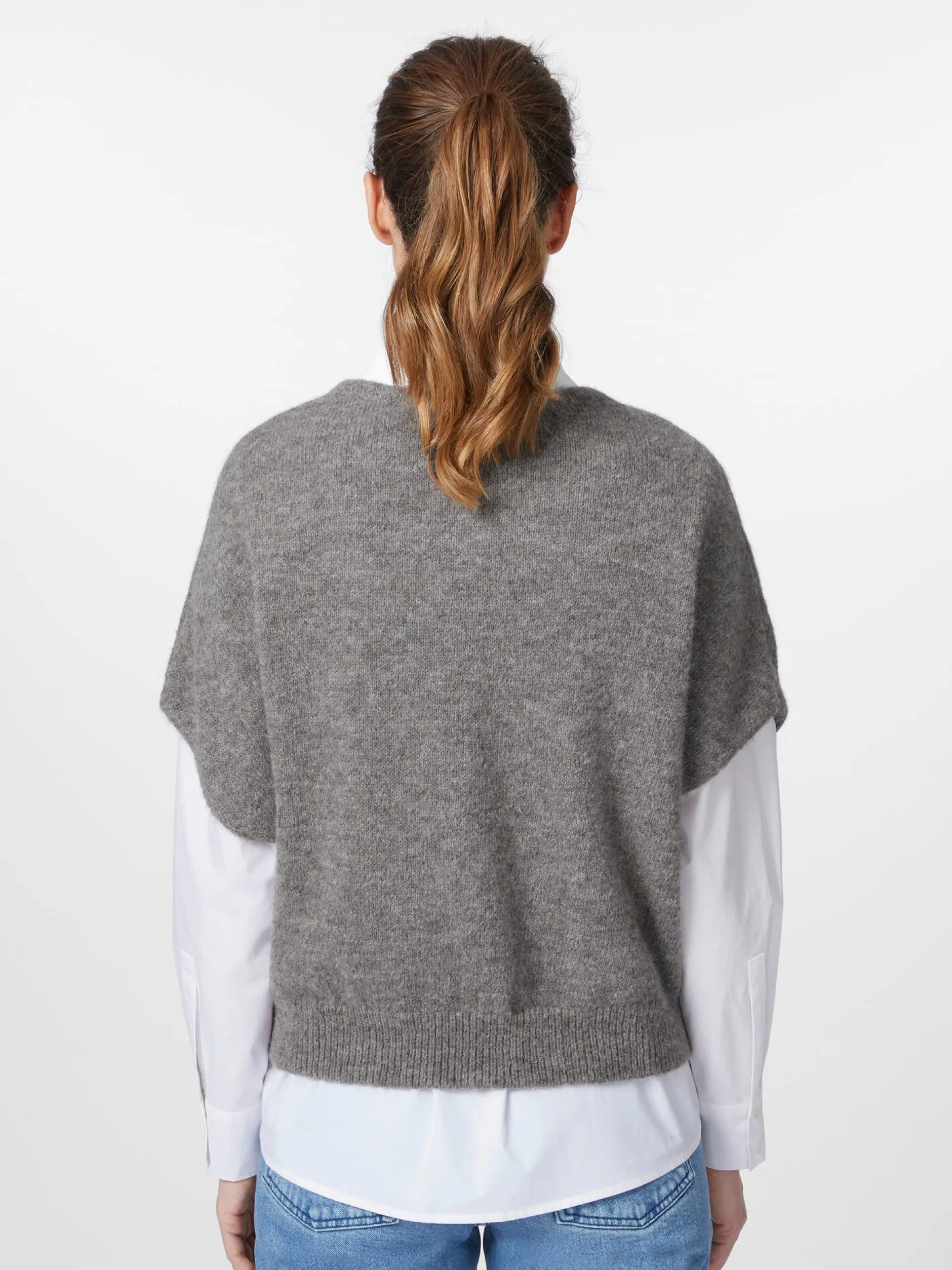 Ein echtes Lieblingsstück für die Übergangszeit: gestrickt aus reinem Babyalpaka. Alpakahaar zählt zu den wertvollsten Naturfasern. Es ist ungemein wärmend, leicht und schmiegsam, zeigt einen natürlichen Glanz und ist trotz seiner Feinheit sehr widerstandsfähig. Noch feiner und weicher ist Babyalpaka – so wird das Haar von Jungtieren aus der ersten Schur, aber auch das Haar ausgewachsener Alpakas bezeichnet, wenn dessen Faserfeinheit zwischen 20,1 und 23 Mikron liegt. Daher ist das Material selbst für wollempfindliche Menschen angenehm zu tragen. Der Pullunder ist in lockerer Passform mit überschnittener Schulter gearbeitet, was ebenfalls zum Tragekomfort beiträgt. Der Rumpf schließt mit einem Rippenstrickbündchen.