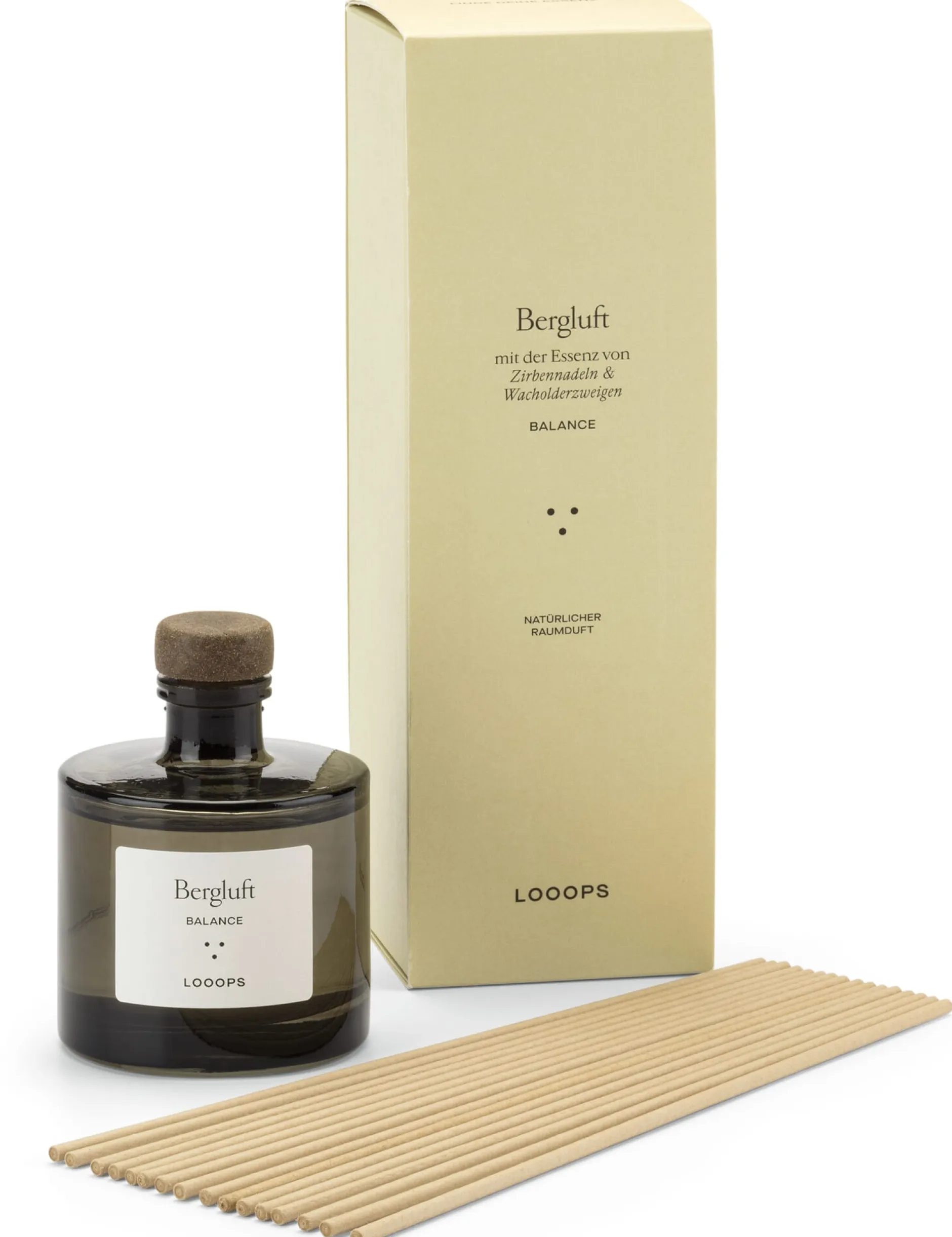 Hier entfalten die Raumdüfte ihr wohltuendes Aroma durch das Prinzip der Verdunstung. Dafür werden einige der beiliegenden Naturpapierstäbchen in den Glasflakon gestellt, sie saugen sich mit der duftenden Flüssigkeit voll, die dann langsam verdunstet und ihren Duft verströmt. Wie bei den Looops Duftkerzen verleihen auch beim Diffusor naturreine ätherische Öle das herrliche Aroma – mit dem Vorteil, dass sich bei Diffusoren die Intensität des Dufts steuern lässt. Je mehr Stäbchen sich im Flakon befinden, desto intensiver wird der Duft. Wir empfehlen, zunächst mit drei bis vier Papierstäbchen zu beginnen. Ein wenig Geduld sollten Sie anfangs mitbringen, da es eine Weile dauern kann, bis sich die Papierstäbchen vollgesogen haben. Dies ist übrigens gut erkennbar, weil das vollgesogene Papier dunkel wird. Eine Flasche reicht je nach Anzahl der verwendeten Holzstäbchen für vier bis acht Wochen.