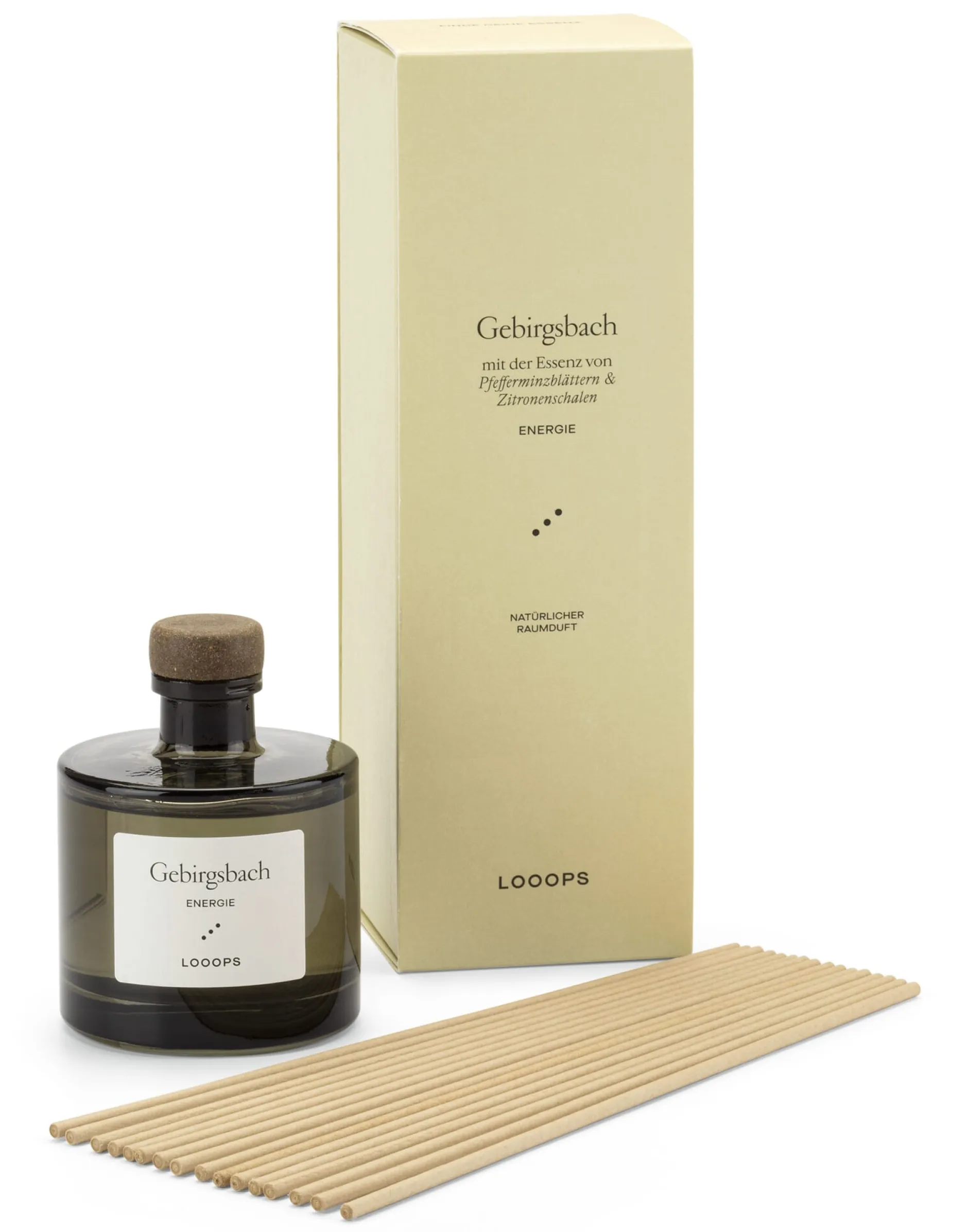 Gebirgsbach: Mit dem erfrischenden Duft von Pfefferminze und Zitrone, begleitet von leichten blumigen Noten der Palmarosa (einer in Asien beheimateten Grasart) zur Stimmungsaufhellung und Harmonisierung.