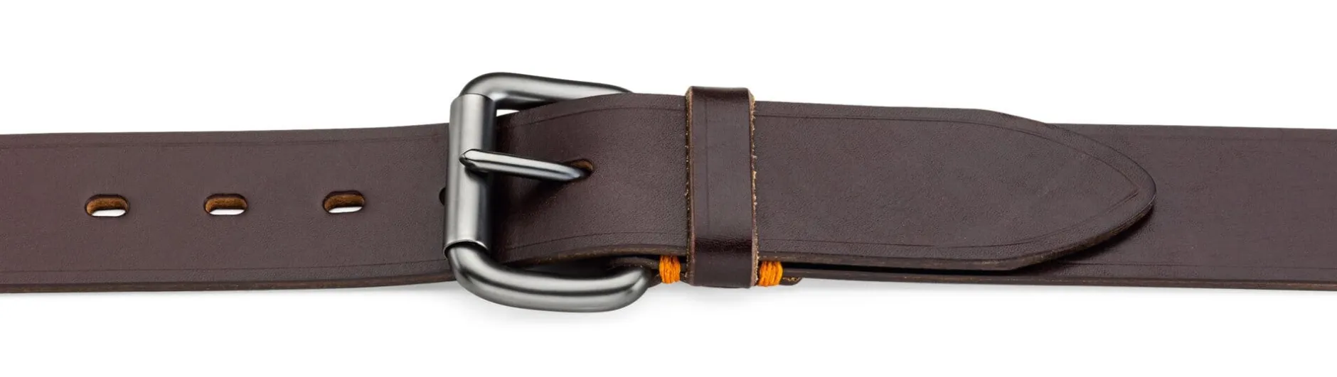 Einlagiger Gürtel aus braunem Glattleder der Gerberei Kobel in Kellinghusen. Es stammt aus den Kernstücken (Doppelcroupons), dem stabilsten und wertvollsten Teil der Rinderhaut. Der Gürtel zeigt eine feine, umlaufende Zierprägung, die dunkle, mit Rolle gearbeitete Schließe ist mittels kontrastierendem Sattlerstich angenäht.