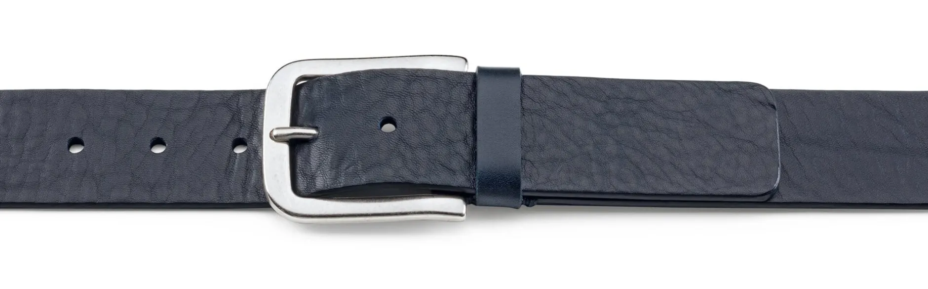 Die Basis dieses einlagigen Gürtels ist ein pflanzlich gegerbtes Rindleder deutscher Herkunft. Es zeigt ein natürliches, markantes Narbenbild und wurde im Fass in kräftigem Dunkelblau durchgefärbt. Die solide Gürtelschließe aus versilbertem Messing passt perfekt zu dem charaktervollen Leder.