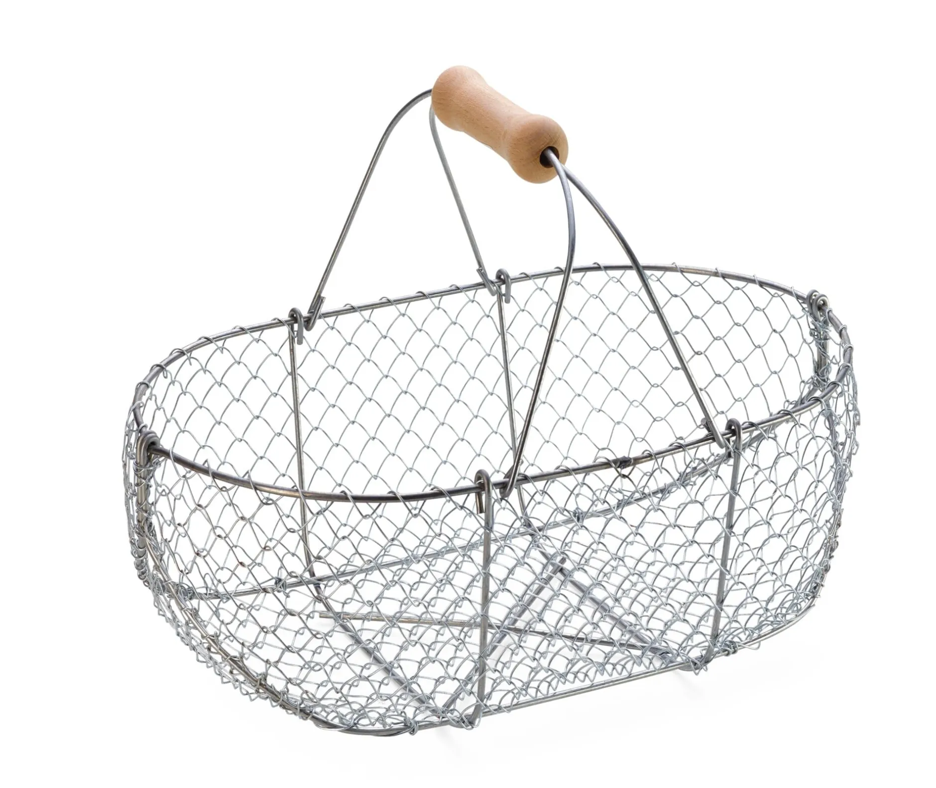 Feuerverzinktes Drahtgeflecht in einem Rahmen aus galvanisch verzinktem Draht. Henkel ebenfalls aus galvanisch verzinktem Draht, mit Buchenholzgriff. Hergestellt in Frankreich.