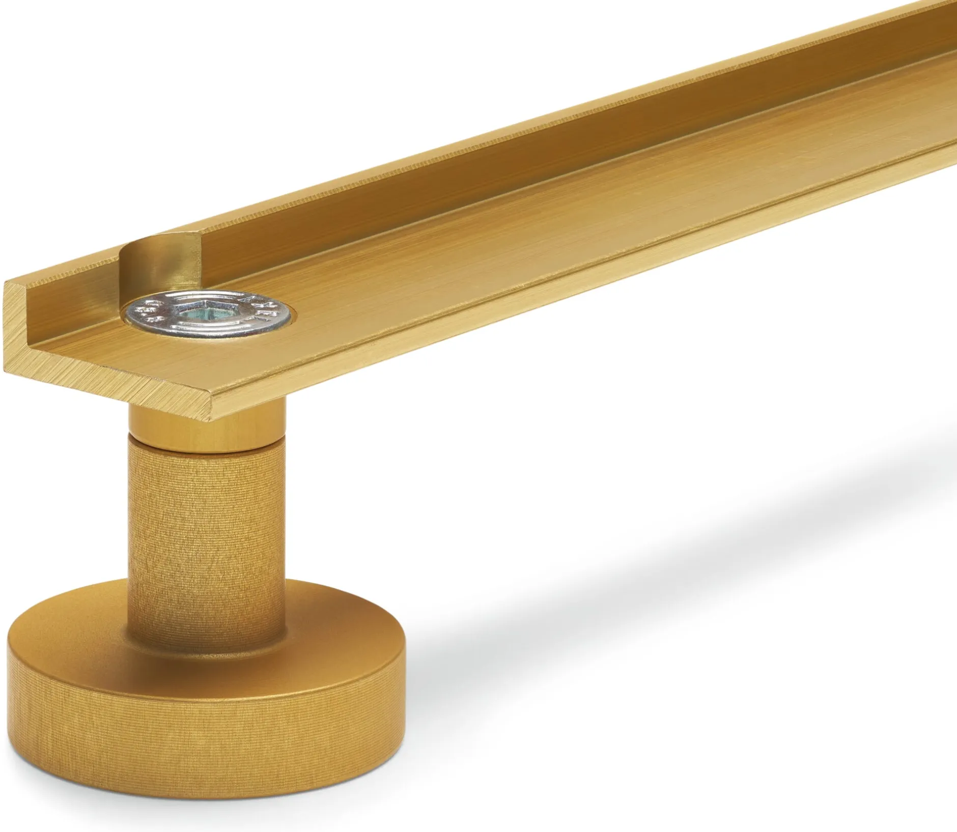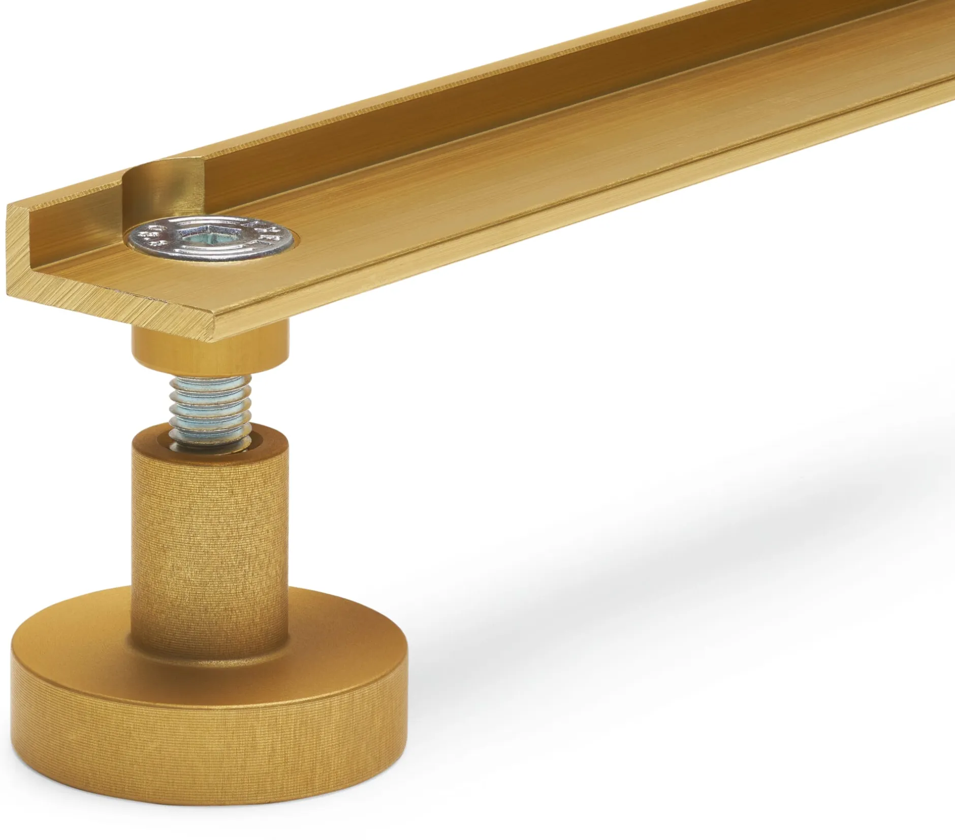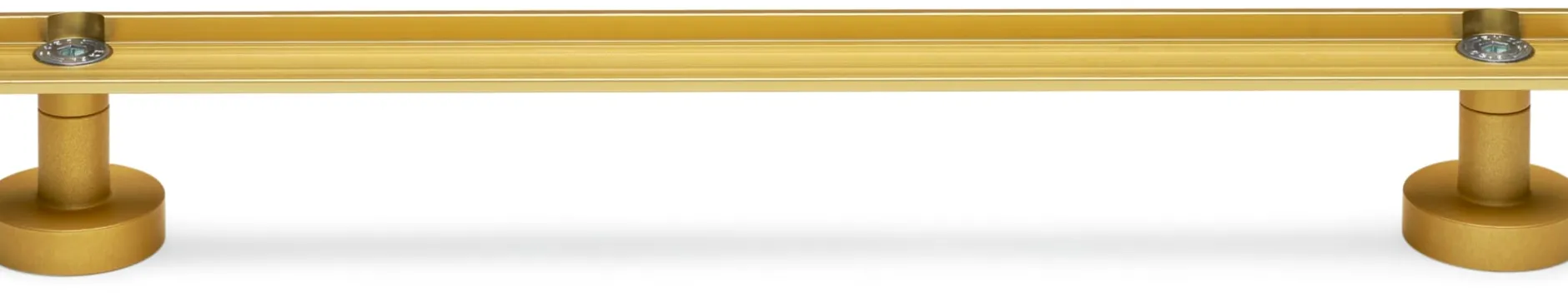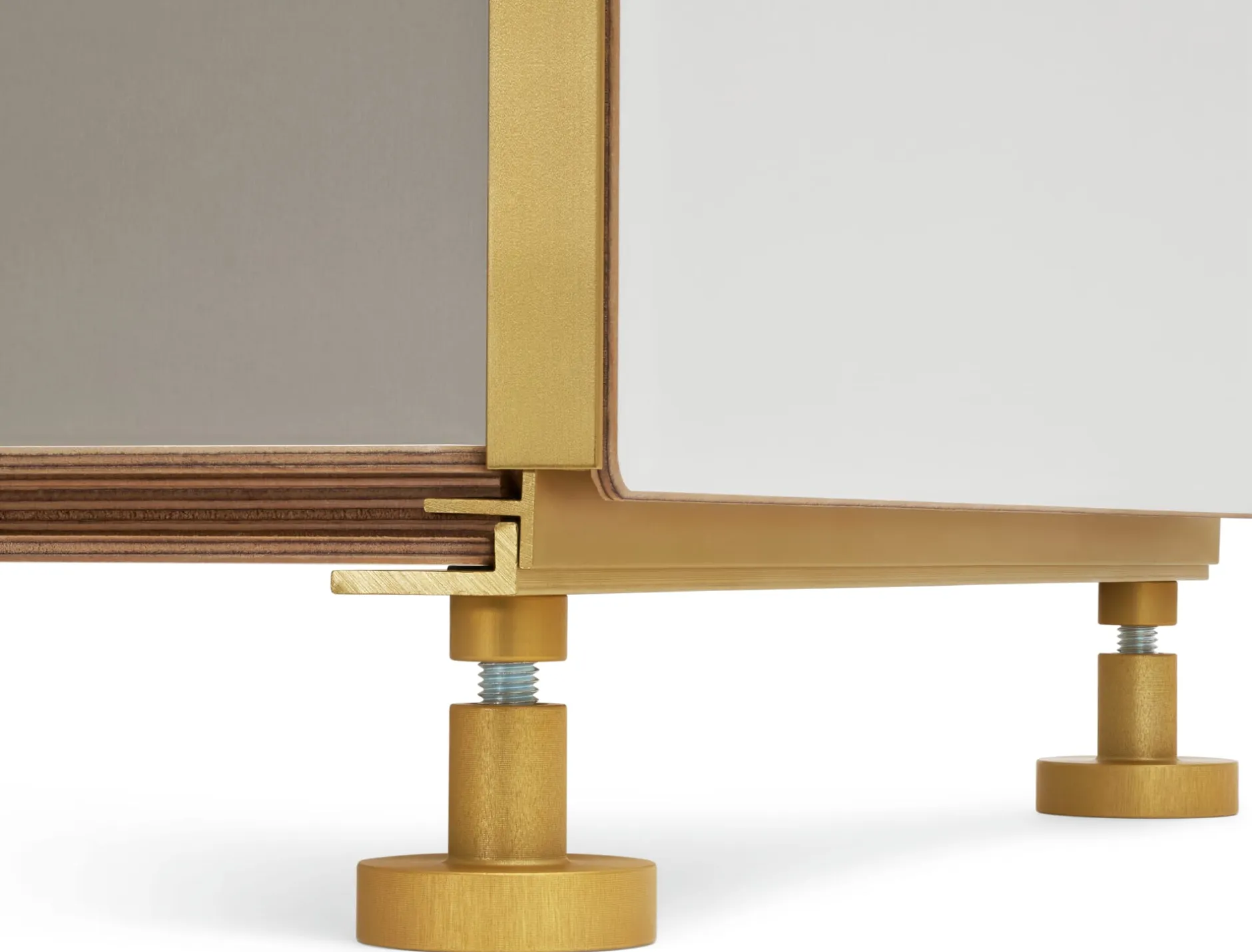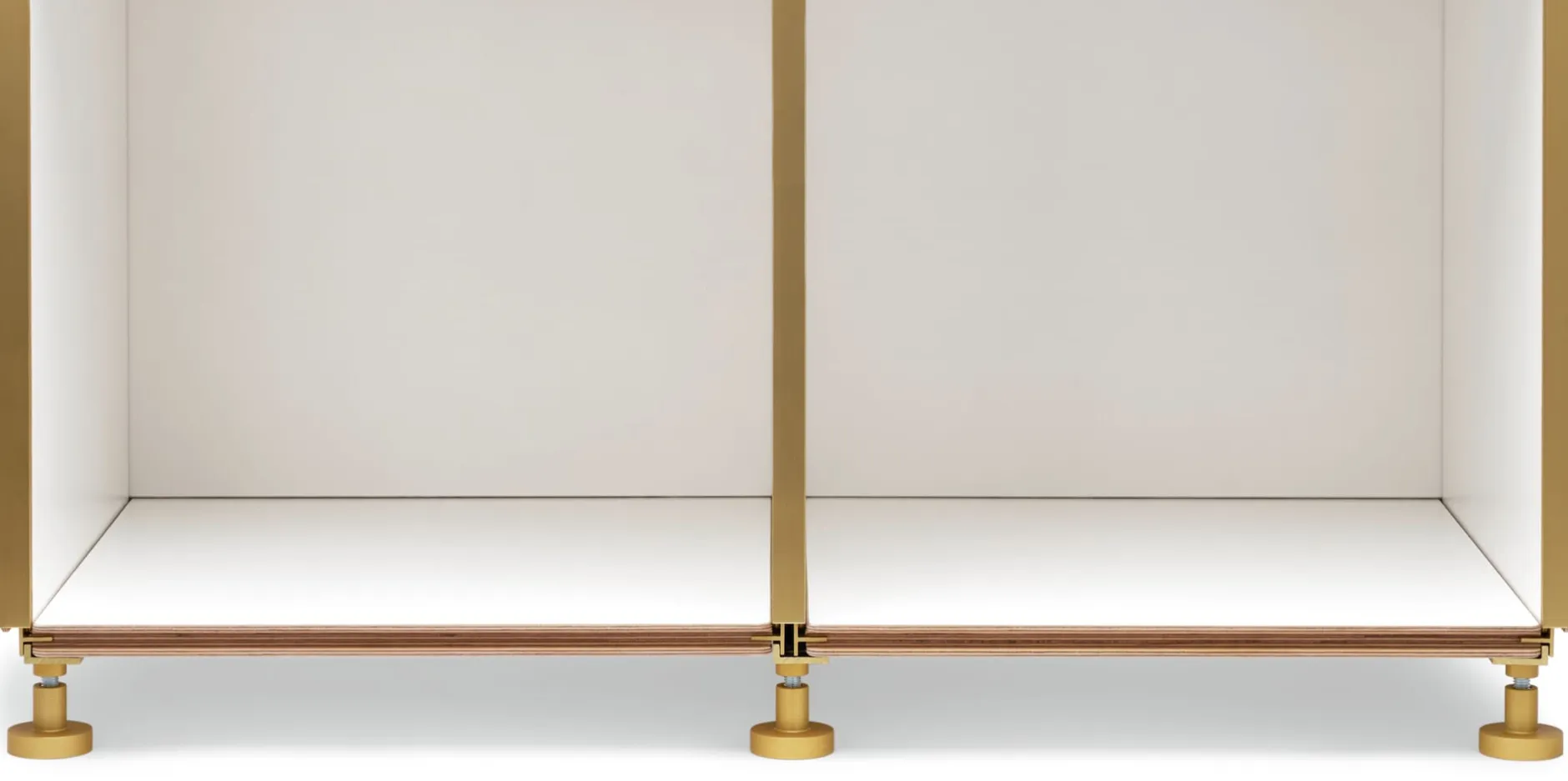 Perfekte technische Konstruktion als Ergänzung zu 1Hoch3 – in goldfarbig eloxierter Edition. Die aus zwei Stellfüßen bestehende Einheit fügt sich mit ihrer verbindenden Aluminiumschiene in die Schiene der Regalbauplatte. Der den Regalaufbau vereinfachende Ausgleich unebener Böden ist damit möglich. Eine gute Lösung, die den Zweiklang der Materialien Aluminium und Schichtholz noch unterstreicht.