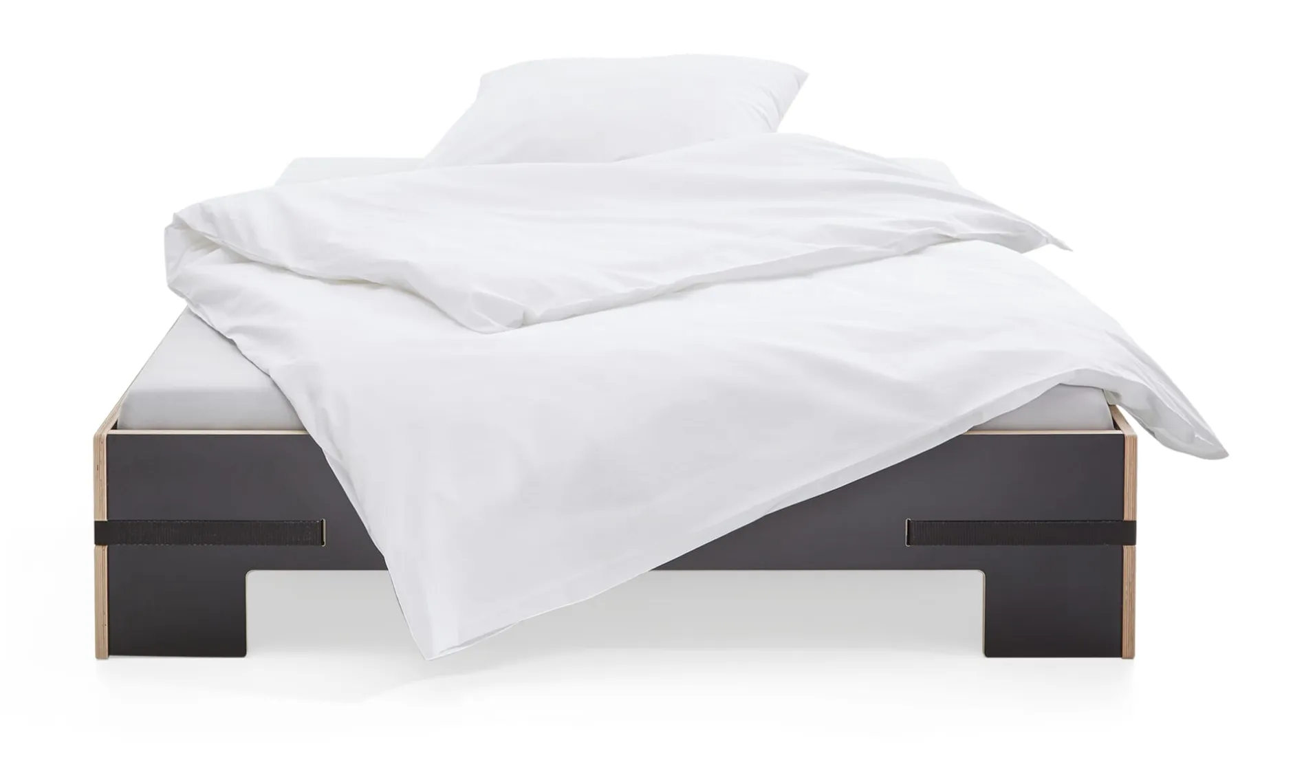 Eine Bettkonstruktion, die uns begeistert! Sie wird in doppelter Hinsicht geprägt von einem starken technischen Element, dem für die Frachtsicherung genutzten Ratschengurt. Einerseits sorgen die hinter den Ecken verborgenen Spannschlösser für exzellente Statik, andererseits kommentiert die textile Oberfläche des Gurtbandes bestens den Charakter des Möbels. Der Aufbau der sehr stabilen Konstruktion erfolgt werkzeugfrei und innerhalb weniger Minuten.