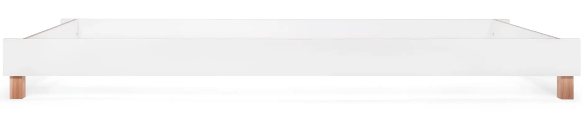 Material: Bettrahmen: Birke Multiplex (Herkunft: Osteuropa), 18 mm, beidseitig weiß melaminharzbeschichtet (bei den aus dem Karosseriebau stammenden Multiplexplatten sind Farb- und Strukturunterschiede sowie vereinzelt kleine Druckstellen möglich), Lattenrostauflage: Fichte/Tanne (Herkunft: Deutschland), Beine: Esche, unbehandelt (Herkunft: Deutschland), Traverse: Edelstahl