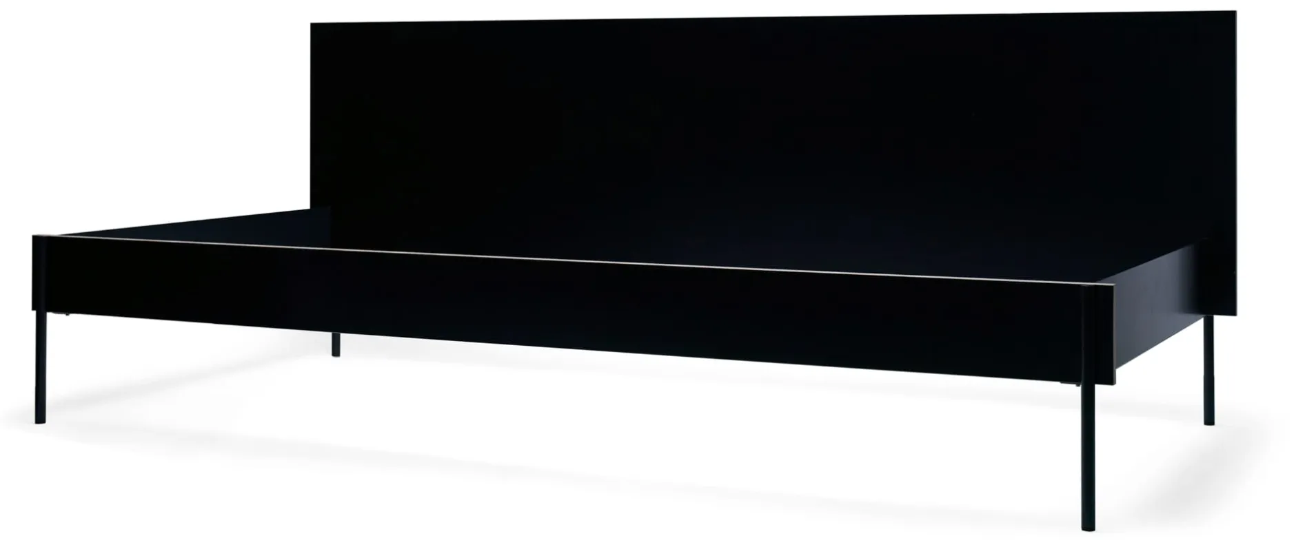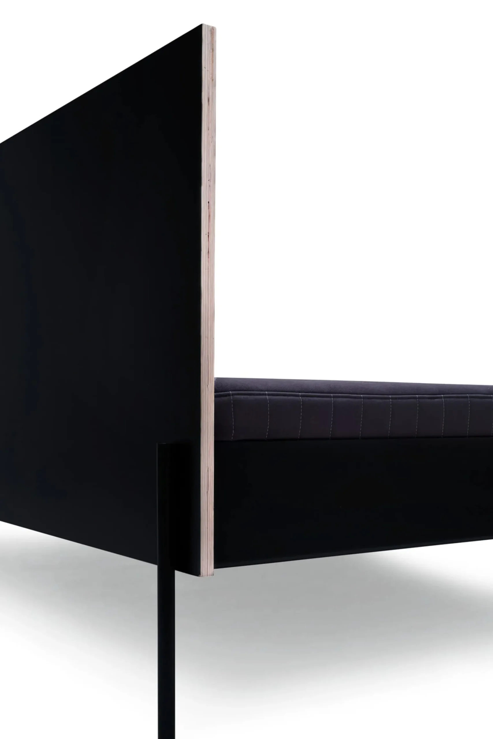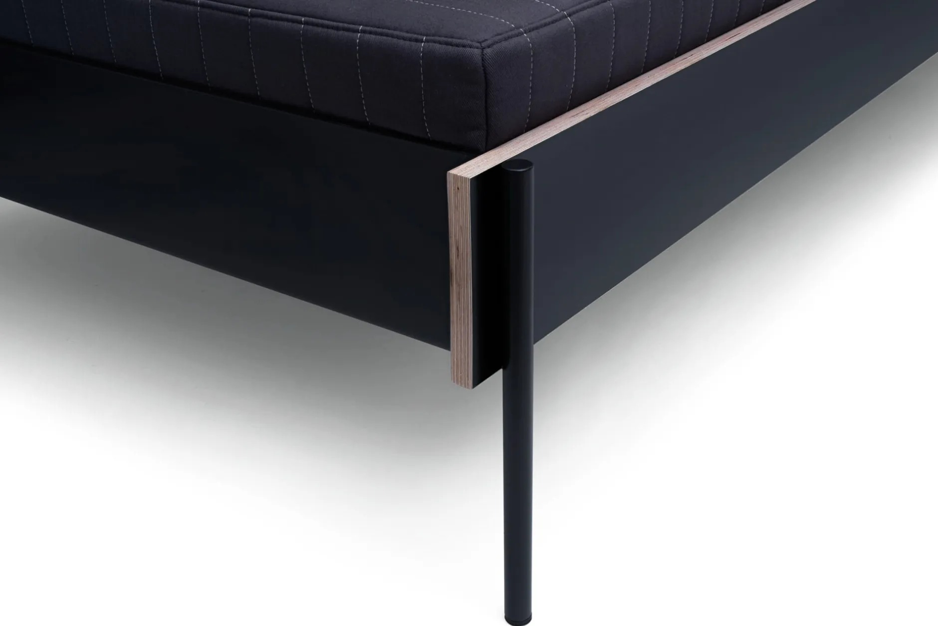 Wie das Bett steht es auf feinen Stahlfüßen, die sich aus den stählernen Kopf- und Fußteilen entwickeln. Diese werden mit den beiden Bettseiten aus beschichtetem Birkensperrholz verbunden und zu einer tragenden Einheit gebracht. Kopf- und Fußseite sowie die beiden Längsseiten werden durch eine Schlitzverbindung beschlagfrei zusammengesteckt. An einer Längsseite besitzt das Daybed HANS ein hohes Seitenteil.