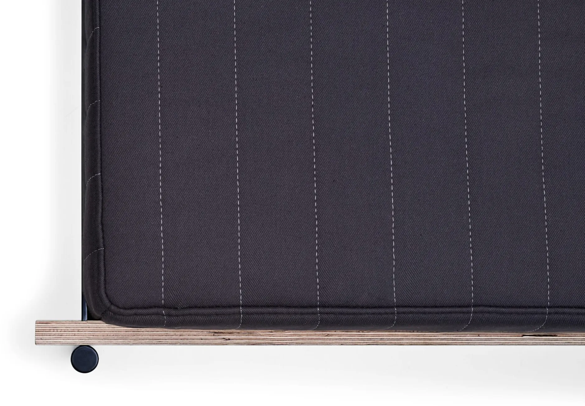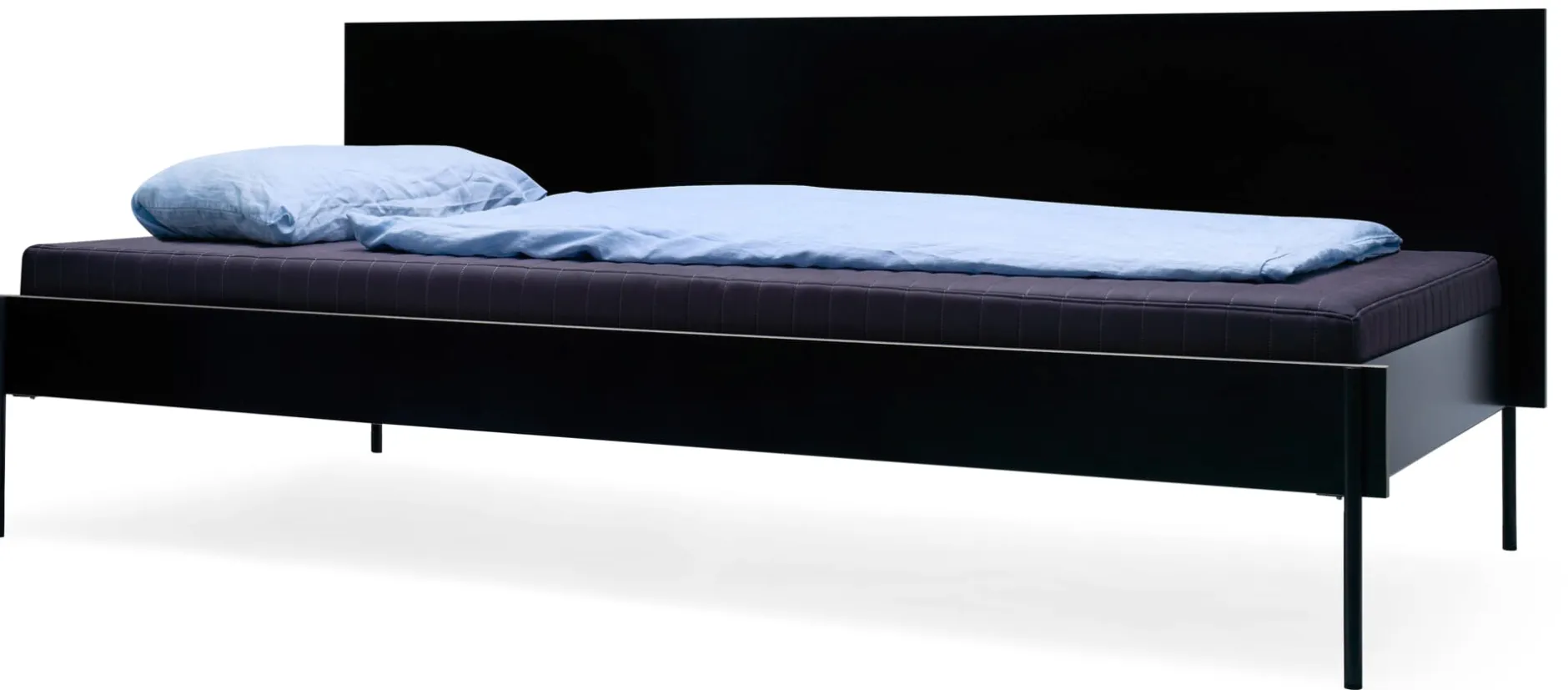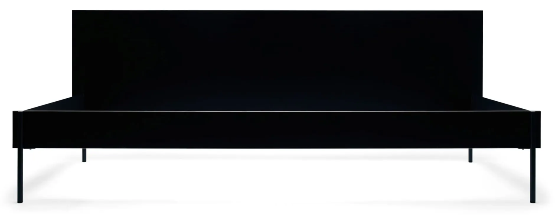 Wie das Bett steht es auf feinen Stahlfüßen, die sich aus den stählernen Kopf- und Fußteilen entwickeln. Diese werden mit den beiden Bettseiten aus beschichtetem Birkensperrholz verbunden und zu einer tragenden Einheit gebracht. Kopf- und Fußseite sowie die beiden Längsseiten werden durch eine Schlitzverbindung beschlagfrei zusammengesteckt. An einer Längsseite besitzt das Daybed HANS ein hohes Seitenteil.