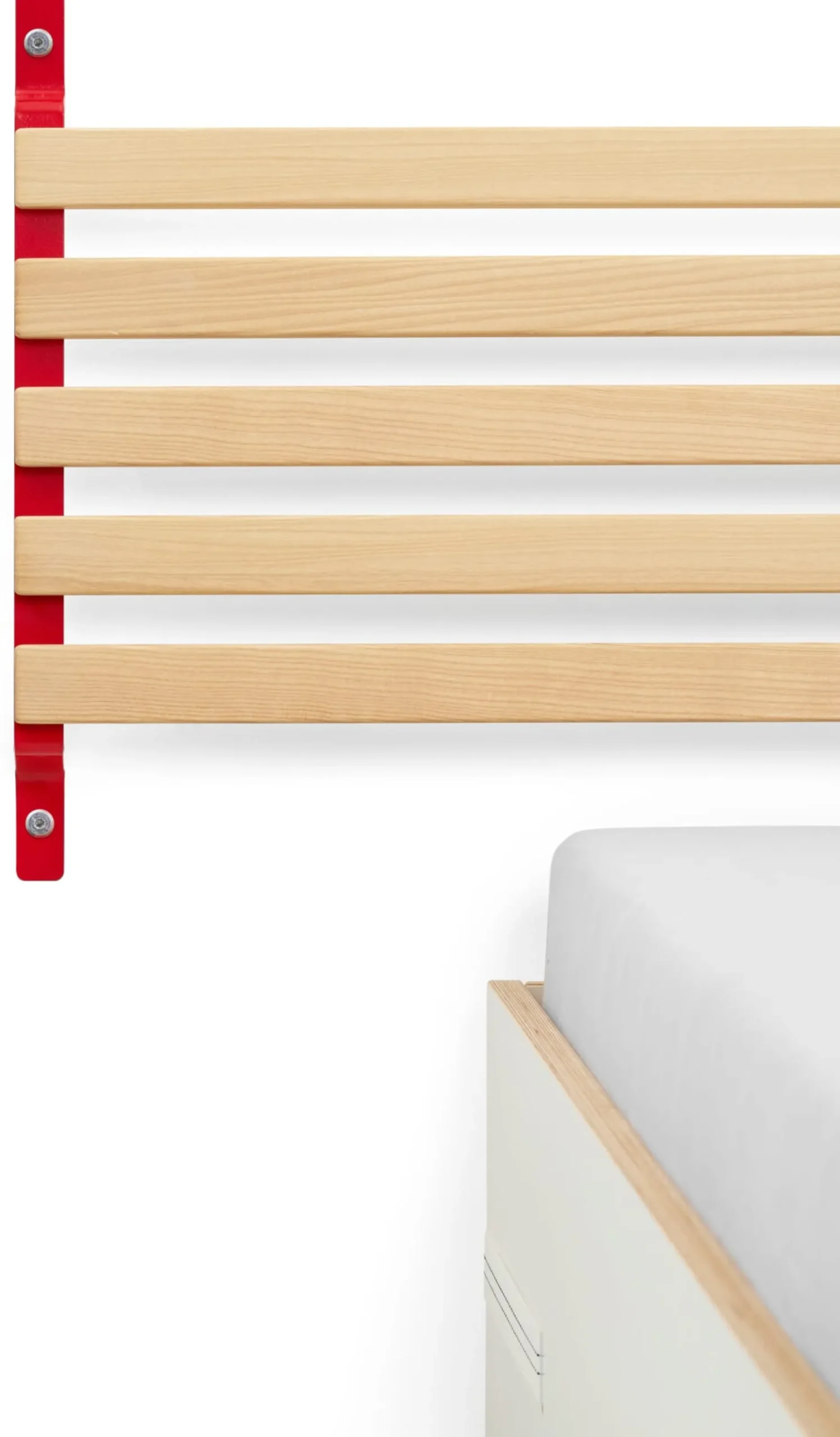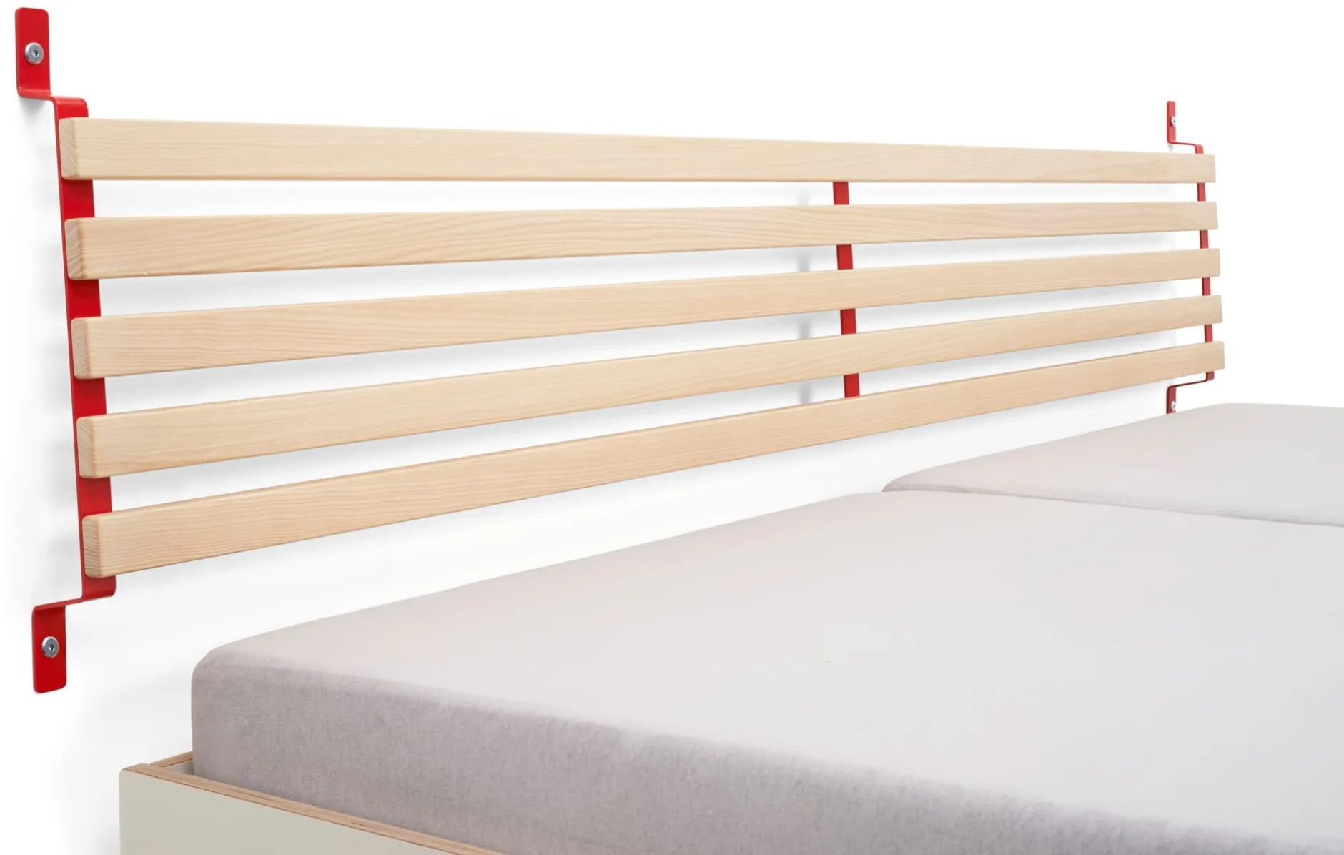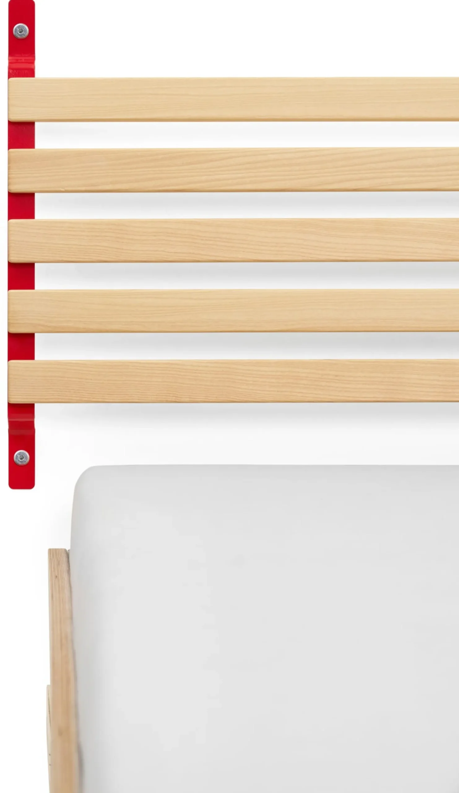 SCHMIEGER ist ein universell einsetzbares Kopfteil und Rückenlehne. Die naturbelassenen und samtweich geschliffenen Leisten aus Eschenholz sind flexibel und geben bei Belastung leicht federnd nach. Sie reagieren beim Anlehnen auf Körperdruck und bieten angenehmen Komfort. Kissen bieten sie Halt, Decken lassen sich darüber hängen. In seiner schlichten Formgebung und mit seinem Materialeinsatz passt sich SCHMIEGER diskret an und ergänzt Betten und Liegen verschiedenster Art. Als Kopfteil ist es für annähernd jedes Bettbreitenmaß gedacht, denn ein eventueller seitlicher Überstand ist Teil der Gestaltungsidee. Wir empfehlen SCHMIEGER für schmale Einzelbetten wie für breite Doppelbetten, speziell für die Betten GURTBETT und SIMPLON aus unserem MAGAZIN-Sortiment ist das Kopfteil geeignet. In Verbindung mit längs an der Wand stehenden Liegen – wie beispielsweise des stapelbaren Bettes STIEGE – erfüllt SCHMIEGER seine Rolle als komfortspendende Rückenlehne. Die Montage über die beiden an der Wand zu montierenden Metallbügel ist denkbar einfach, Schrauben und Dübel gehören zum Lieferumfang.