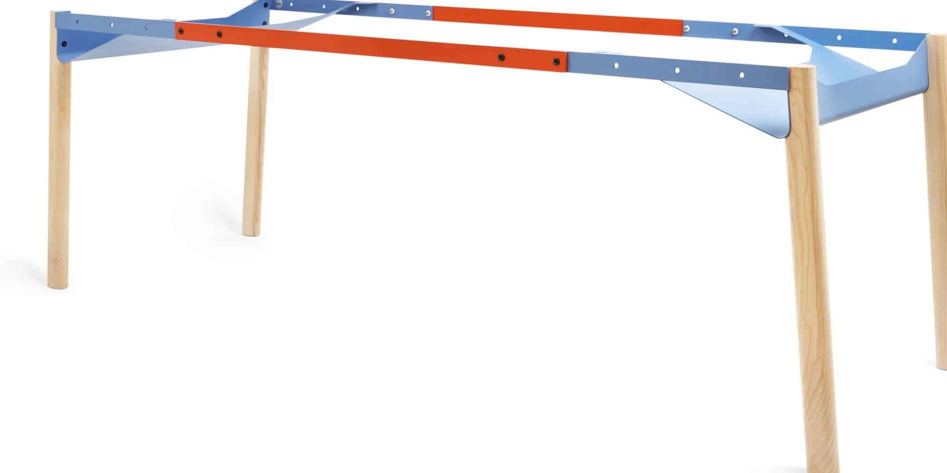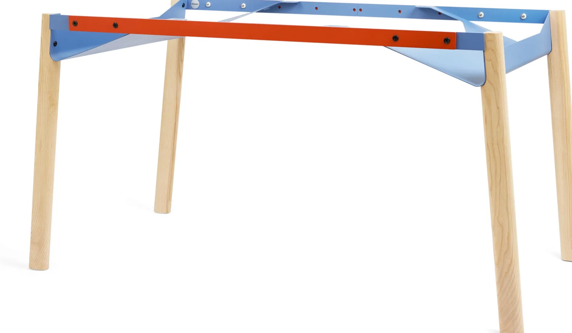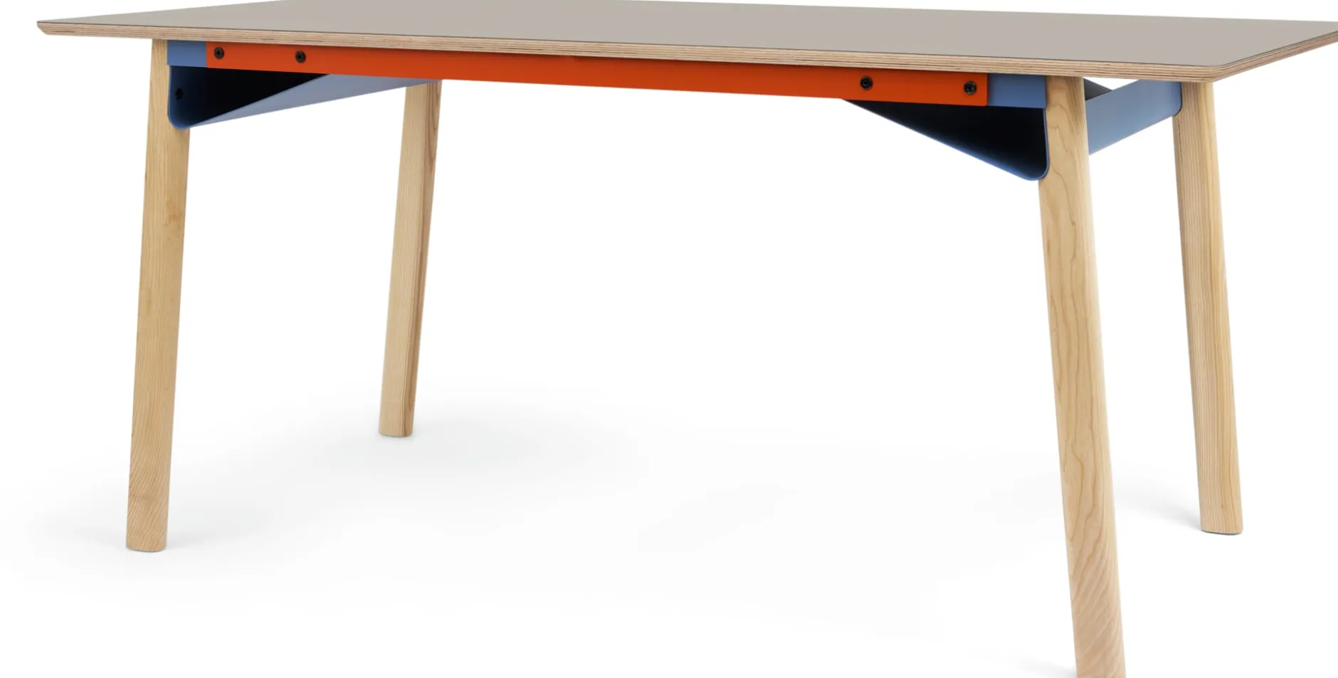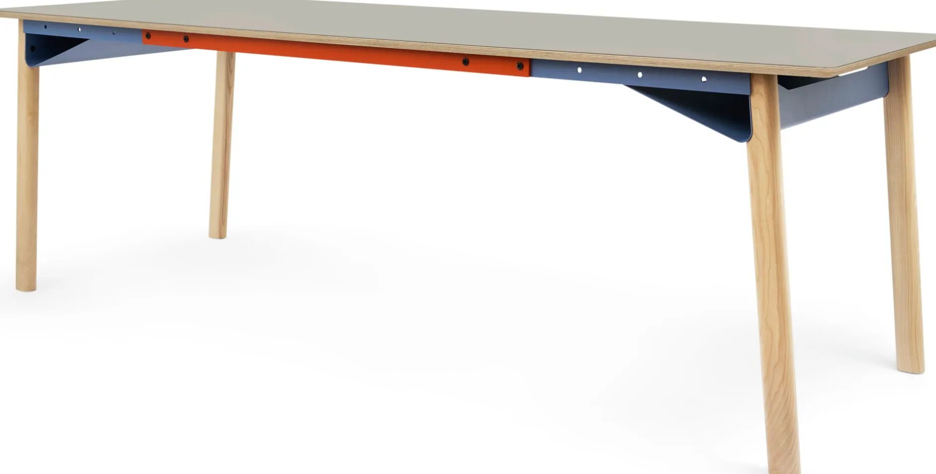 ZEHDENICKER in hölzerner Variante: Das markante Stahlgestell in den Akzentfarben Rotorange und Taubenblau steht auf soliden Holzbeinen aus massiver, unbehandelter Esche. Die bewährte Konstruktion bleibt: Diagonalverstrebungen und wannenartige Kopfbauteile sorgen für Stabilität und Verwindungssteifigkeit. Kein Wackeln, kein Schaukeln. Die stählernen Zargen des Tischgestells sind mit einem Lochraster versehen und erlauben es, das Gestell zwischen einer Breite von 135 bis 210 cm in festen Abständen zu variieren. Die beiden Wannen bieten praktische Ablageflächen – beispielsweise für Servietten am Esstisch, Zeitungen oder auch die Mehrfachsteckdose am Arbeitsplatz.