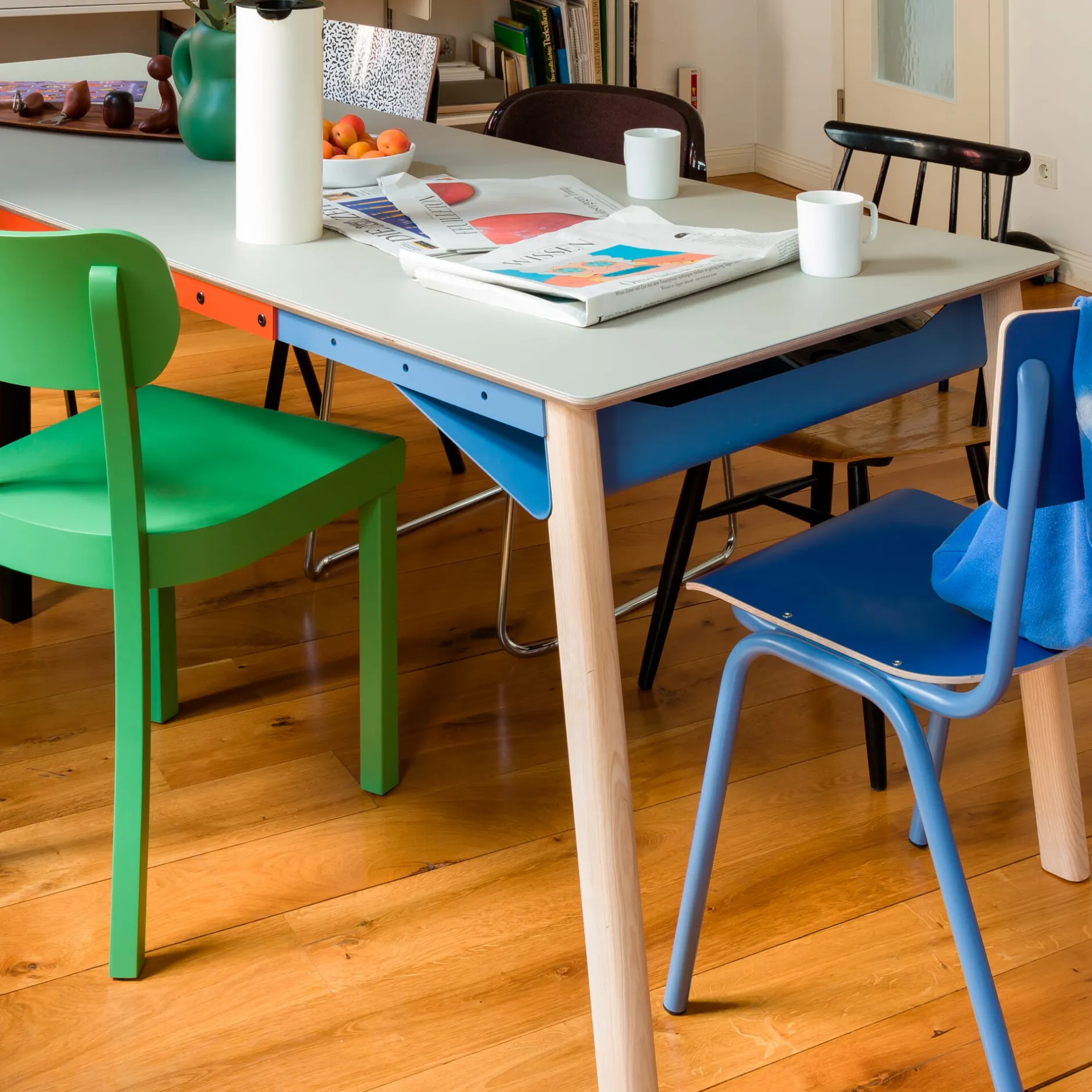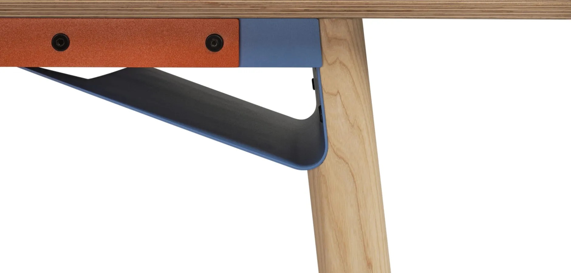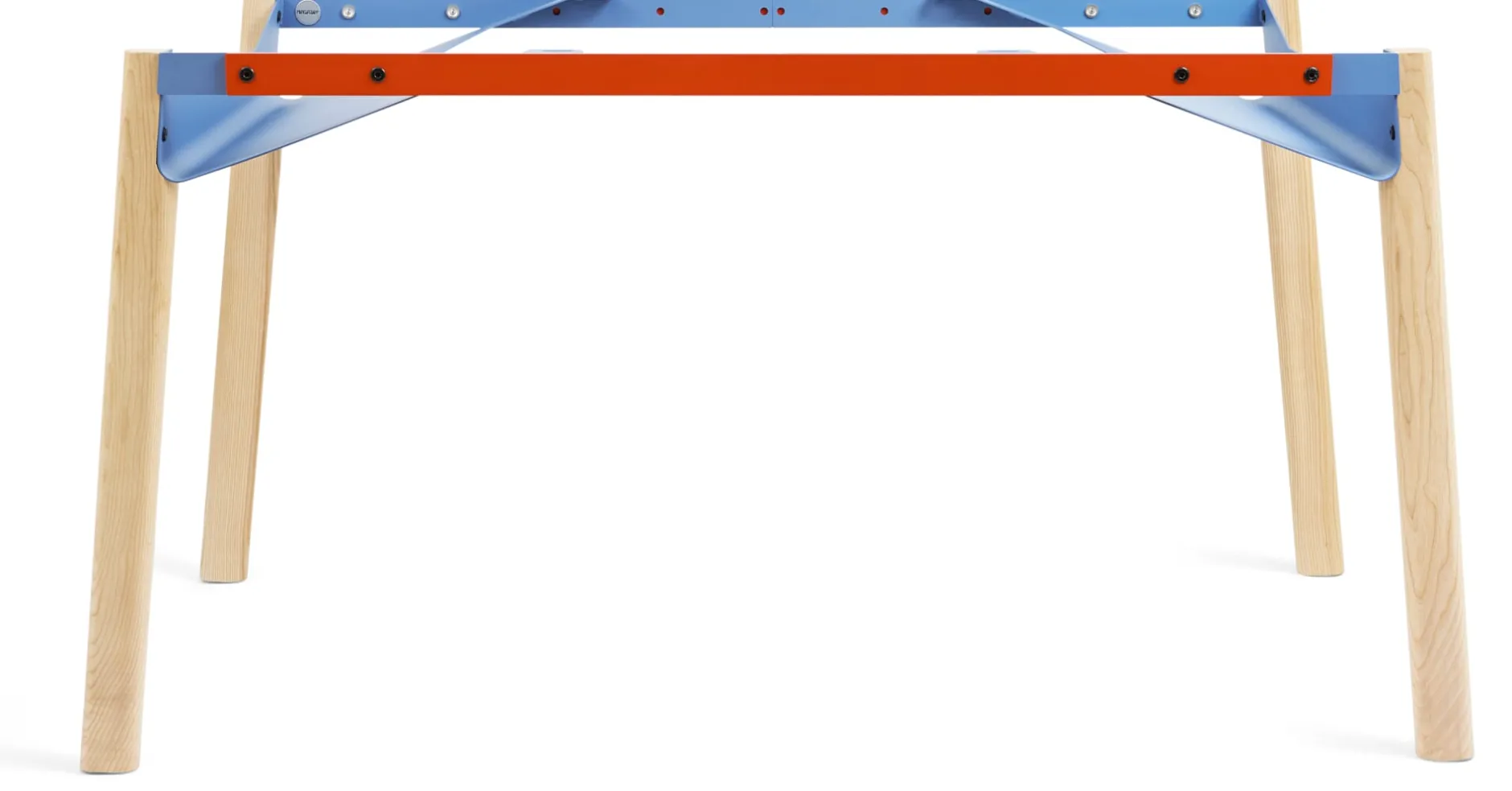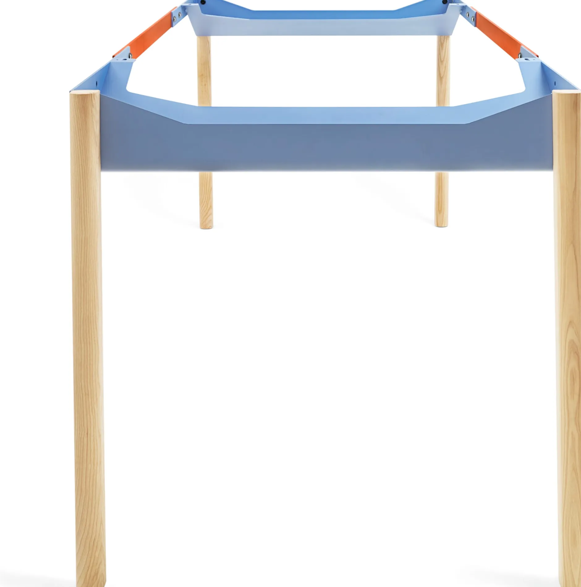 ZEHDENICKER in hölzerner Variante: Das markante Stahlgestell in den Akzentfarben Rotorange und Taubenblau steht auf soliden Holzbeinen aus massiver, unbehandelter Esche. Die bewährte Konstruktion bleibt: Diagonalverstrebungen und wannenartige Kopfbauteile sorgen für Stabilität und Verwindungssteifigkeit. Kein Wackeln, kein Schaukeln. Die stählernen Zargen des Tischgestells sind mit einem Lochraster versehen und erlauben es, das Gestell zwischen einer Breite von 135 bis 210 cm in festen Abständen zu variieren. Die beiden Wannen bieten praktische Ablageflächen – beispielsweise für Servietten am Esstisch, Zeitungen oder auch die Mehrfachsteckdose am Arbeitsplatz.