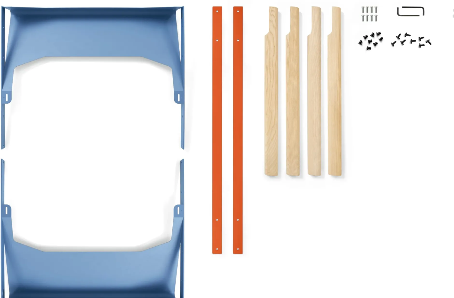 Material: Stahl, pulverbeschichtet (Rotorange RAL 2001 und Taubenblau RAL 5014); Kunststoff; Esche, unbehandelt (Herkunft: Deutschland)