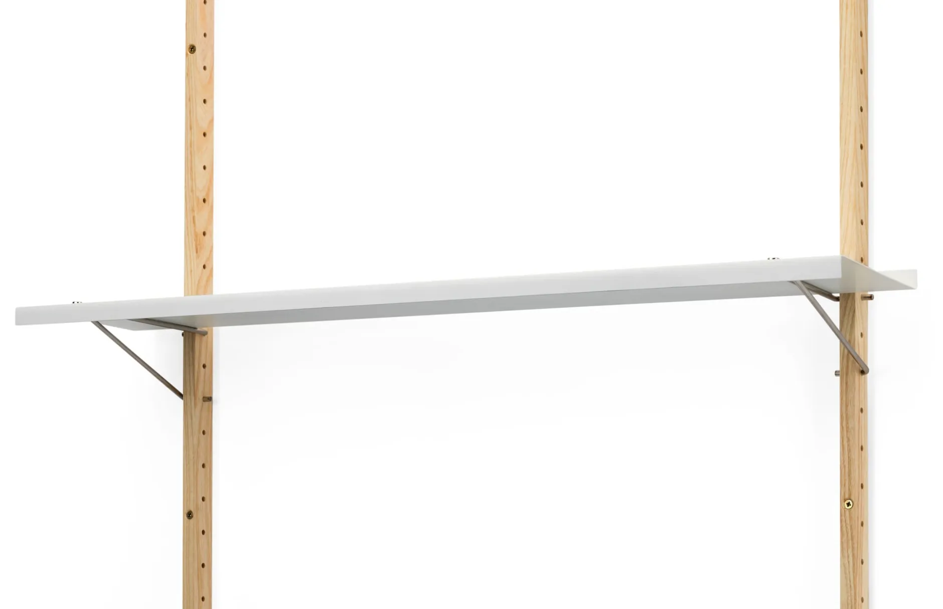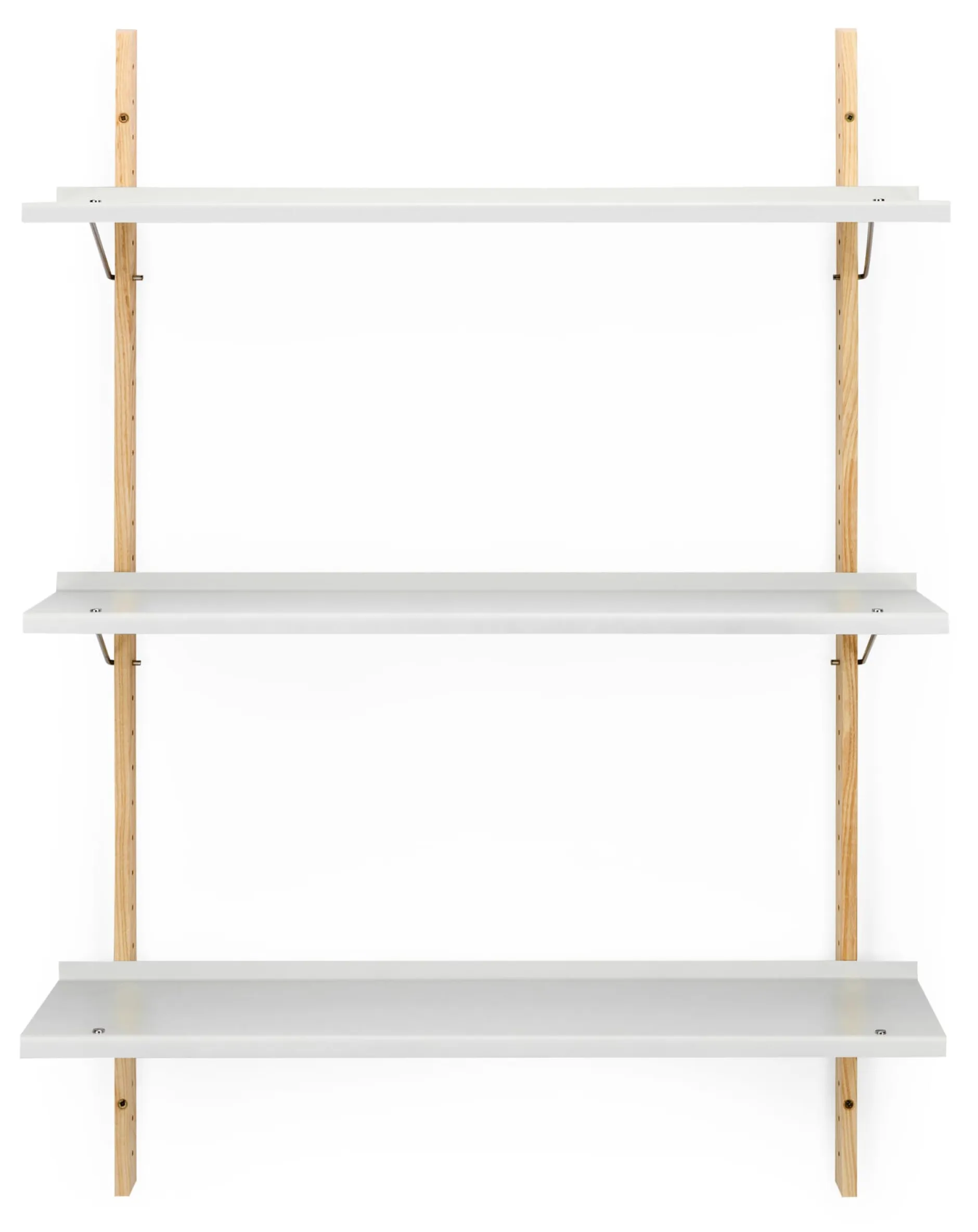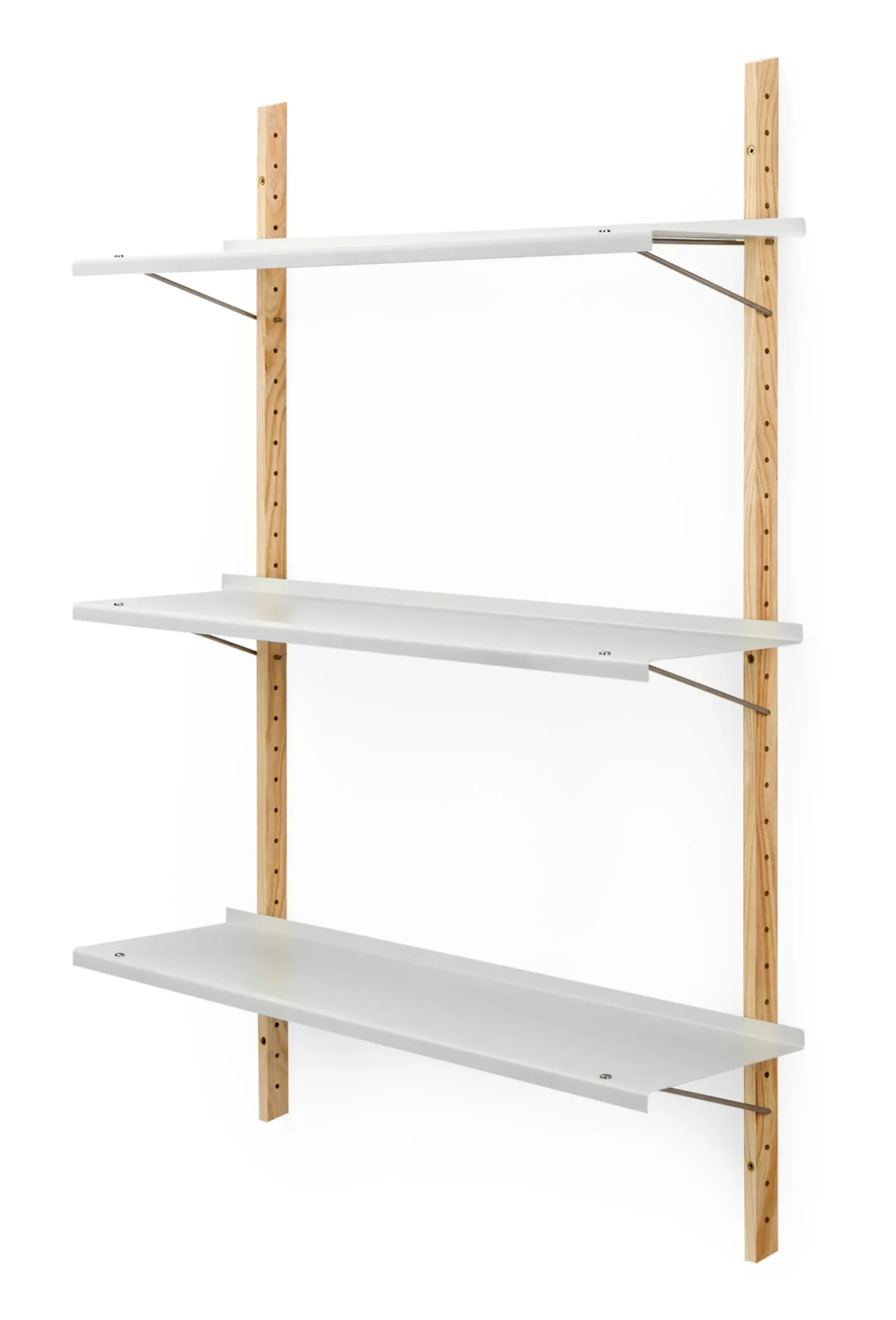 Material: Wandprofil: Esche, massiv (Herkunft: Kanada); Regalböden: Stahlblech, pulverbeschichtet; Bodenträger: Edelstahldraht