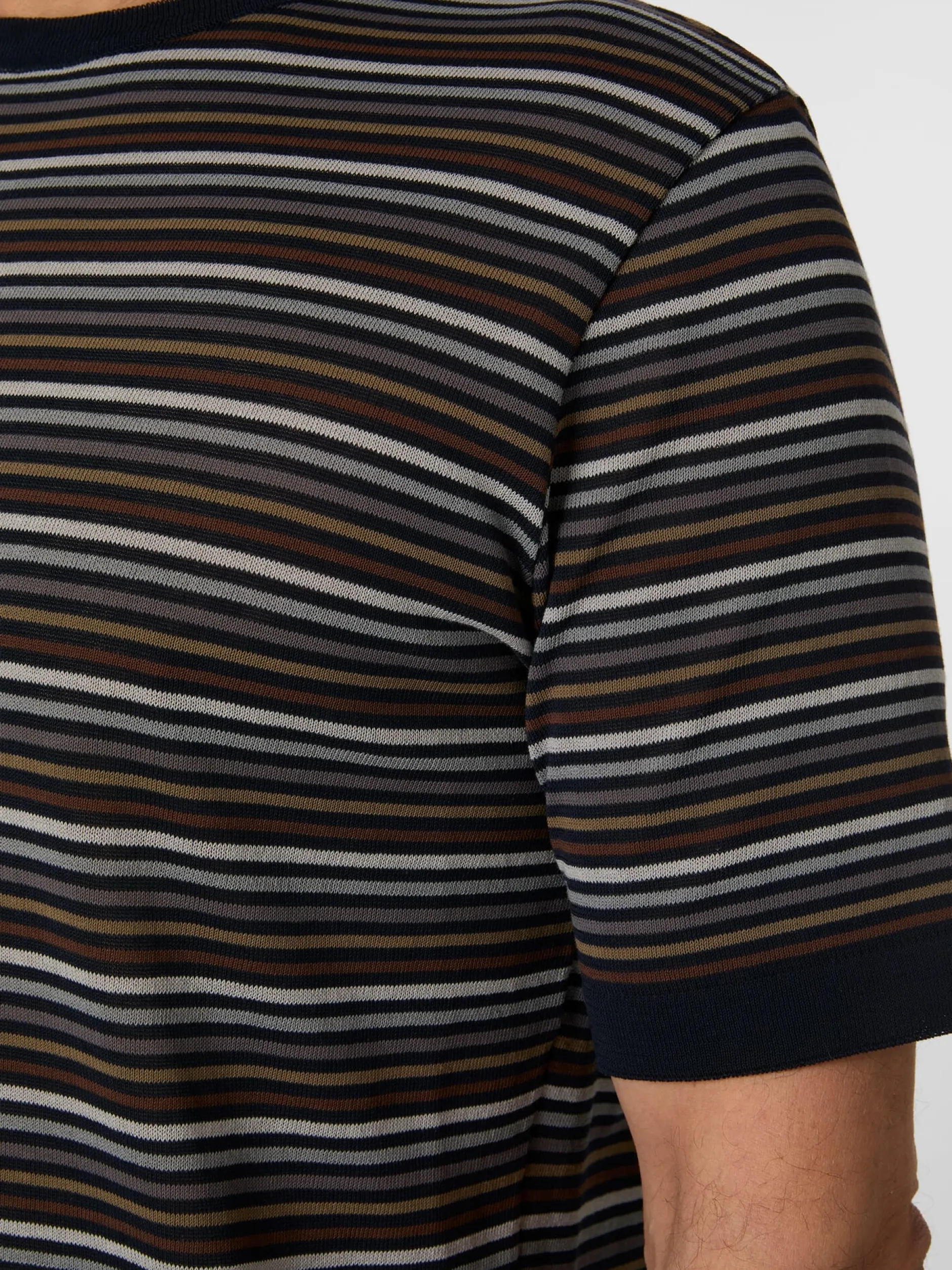 Obgleich in klassischer T-Shirt-Form gearbeitet, besteht dieses Shirt nicht aus Jersey, sondern aus einem Gestrick. Die leichte Ware mit körnigem Griff wird aus hochgezwirnten Baumwollgarnen gemacht. Das feine Ringelmuster ist eingestrickt. Die Abschlüsse an Hals, Ärmeln und Rumpf sind unifarben.