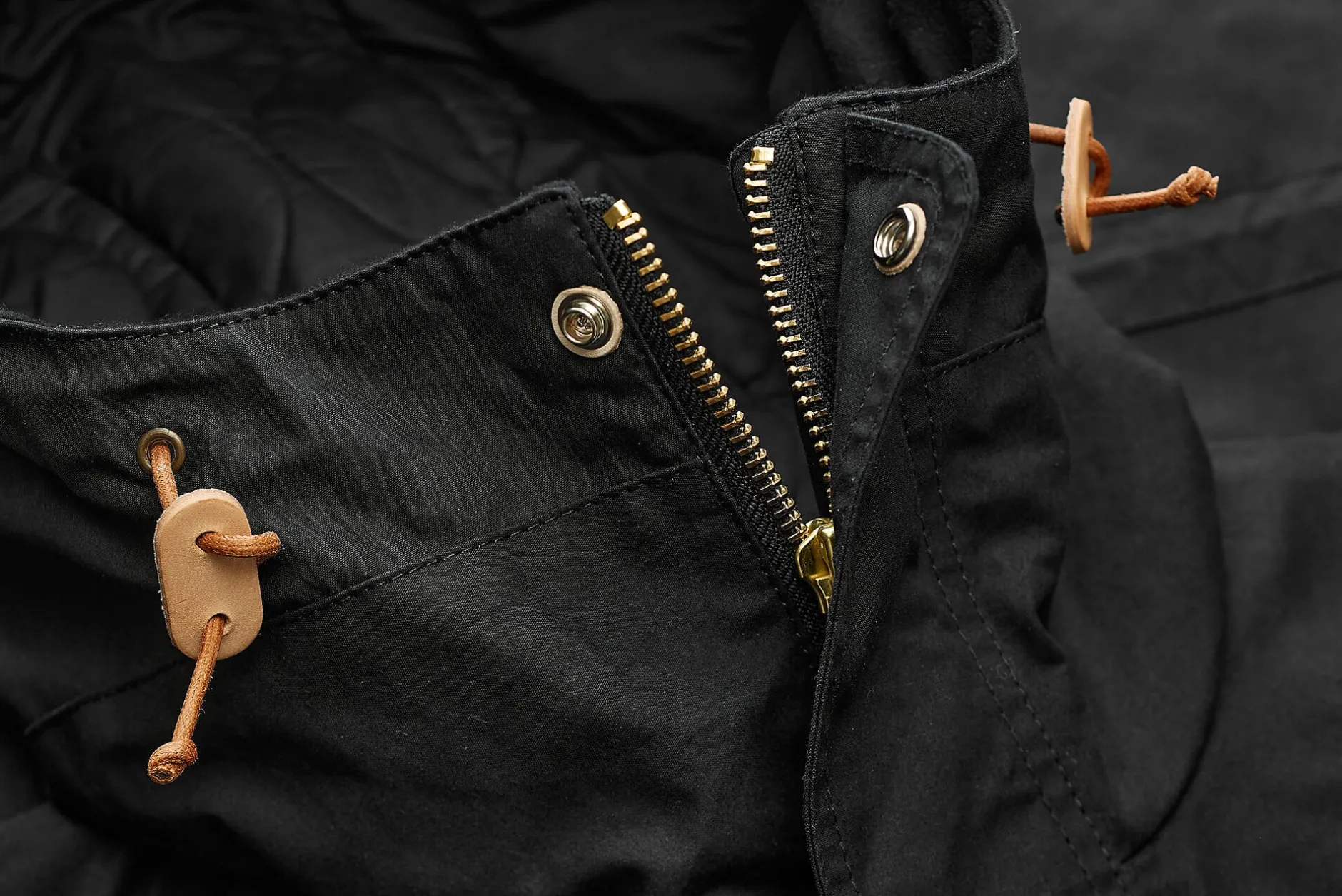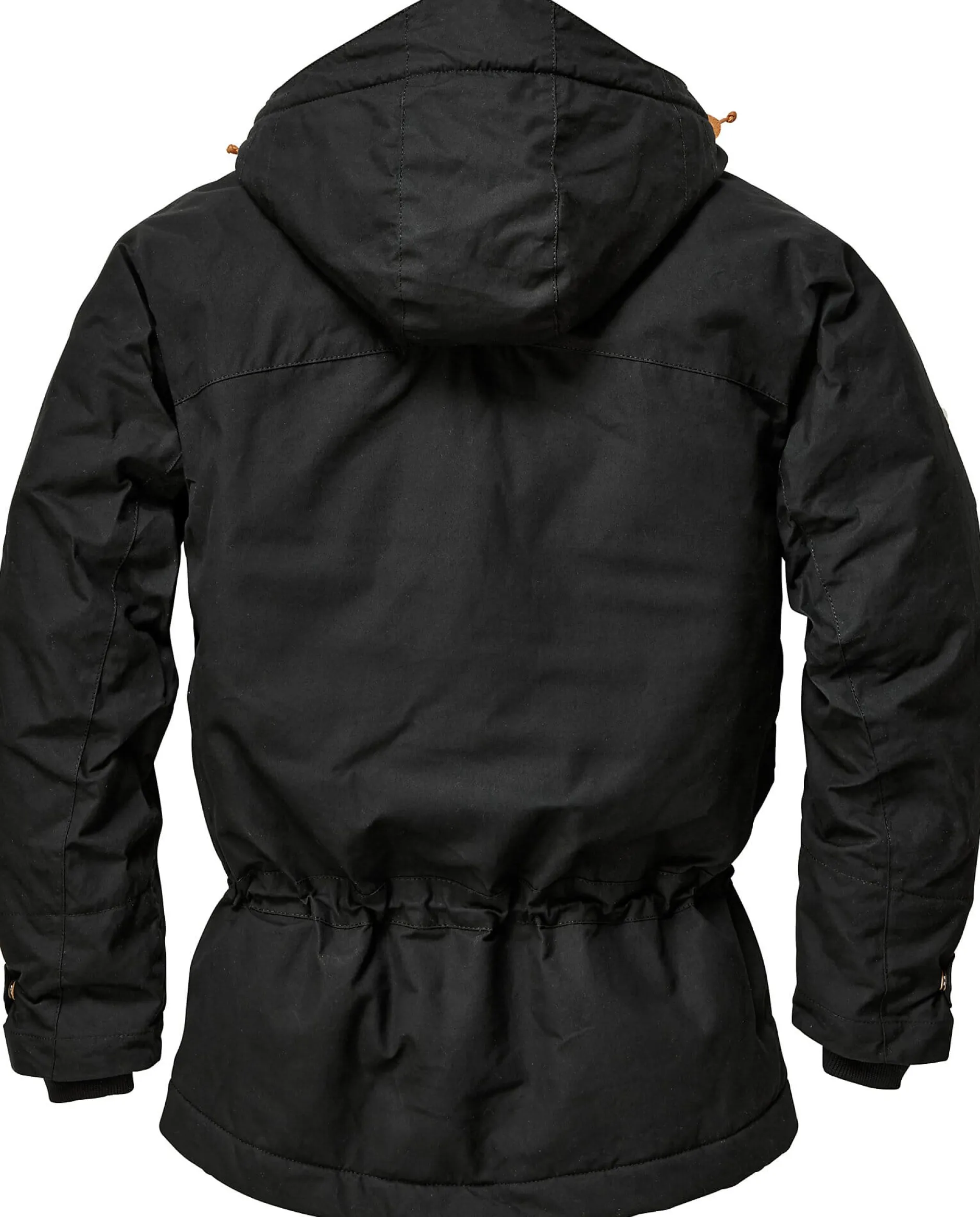 … und auch Kälte kann dem Träger dieser Parkajacke nichts anhaben. Das Obermaterial ist ein moderat gewachstes Baumwolltuch, unter dem eine wärmende Wattierung aus Schurwolle liegt (auch die geräumige Kapuze ist wattiert). Über dem Zweiwegereißverschluss liegt eine windabweisende Blende mit Druckknöpfen; Strickbündchen in den Ärmelöffnungen halten auch dort den Wind fern. Die beiden seitlichen Einschubtaschen sind mit Reißverschlüssen und darüberliegenden knöpfbaren Blenden ausgestattet – hinzu kommt eine Innentasche mit senkrecht angesetztem Reißverschluss. Die Jackenärmel sind mit Cupro, einer seidig-glatten, weichen Zelluloseregeneratfaser gefüttert, was das An- und Ausziehen erleichtert. Tunnelzüge in Taillenhöhe und im Rumpfsaum erlauben eine Weitenanpassung der Jacke, auch die Kapuzenweite lässt sich mittels Tunnelzug regulieren.