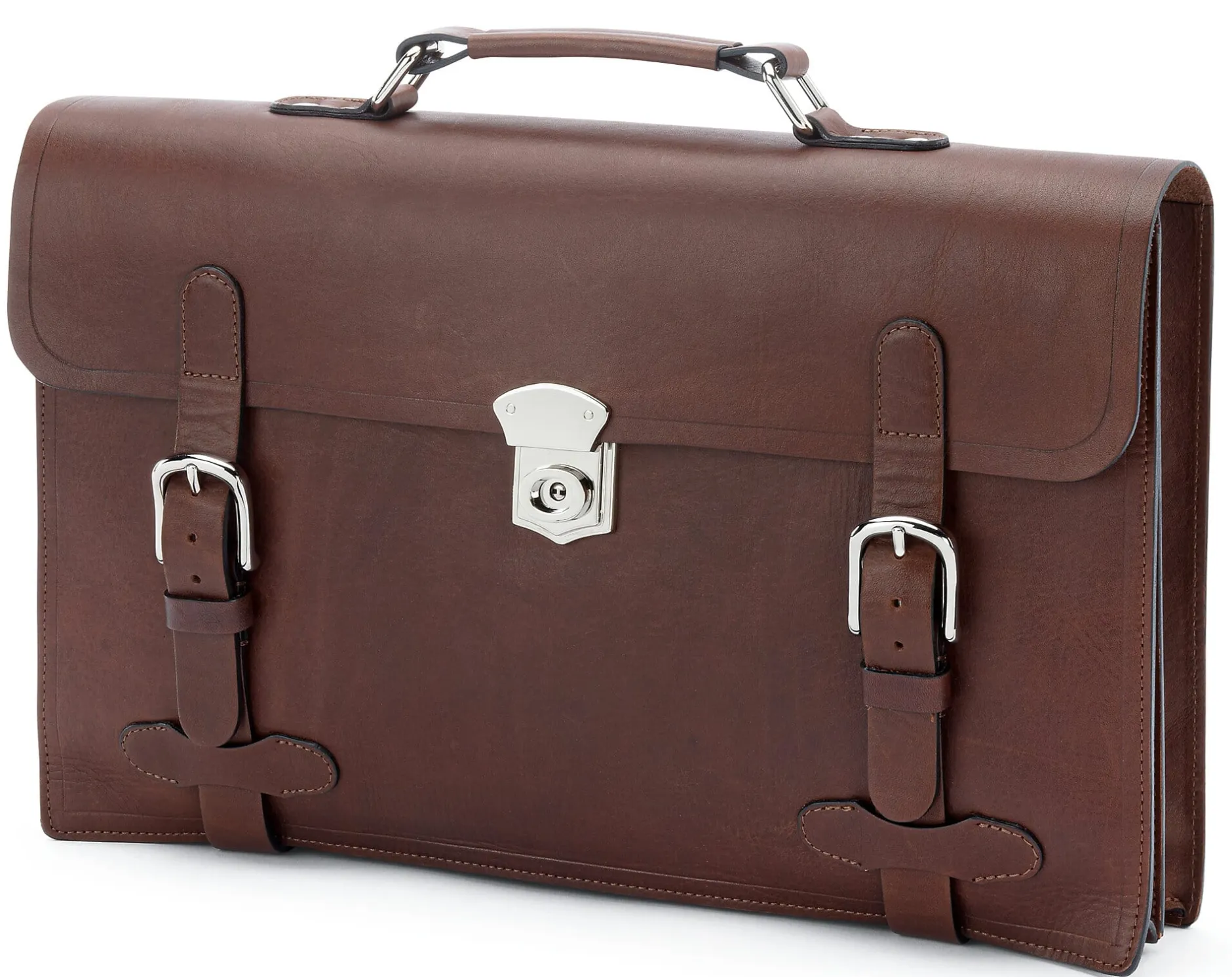 Die Nähte sind offenkantig verarbeitet, die Lederkanten mit einem sehr dünnen, umlaufenden Reifelstrich versehen. Diese kaum noch angewandte Sattlertechnik, bei der ein heißes Streicheisen – freihändig über das Leder gezogen – die Kanten belastbarer macht, ist erkennbar an einer feinen Linie, auf der das Leder durch die Temperatureinwirkung gedunkelt ist. Die Griffe sind aus Vollleder, was einen handgreiflichen Qualitätsunterschied ausmacht. Beschläge und Schließen der Taschen kommen aus Italien. Die Schlösser sind aus Zamak, die Schließen selbst aus Messing, jeweils glänzend vernickelt.