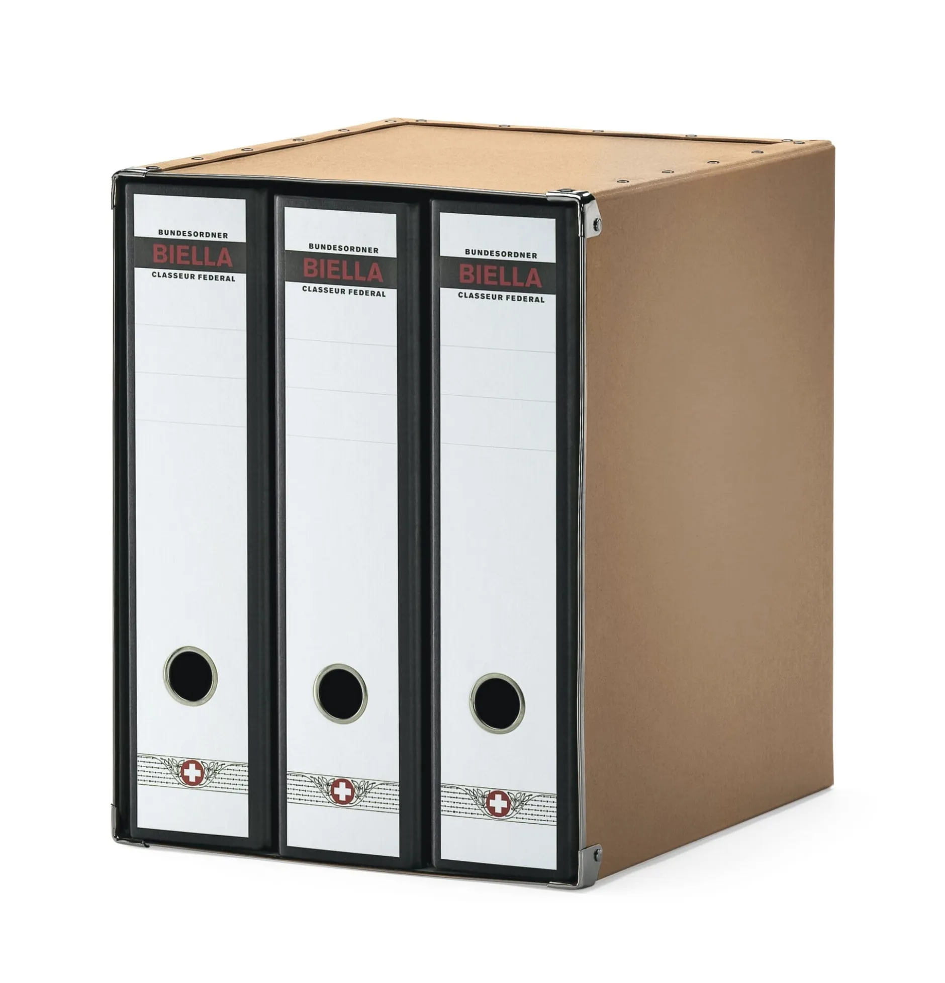 Der Schuber wird aus stabiler Pappe zusammengenietet und mit Metallkanten versehen. Drei handelsübliche Ringorder von 7,5 cm Rückenbreite (wie z.B. unsere Schweizer Bundesordner) passen hinein. Der Vorteil liegt nicht nur im vereinfachten Transport, der Schuber verleiht leeren oder halb gefüllten Ordnern auch Standfestigkeit.