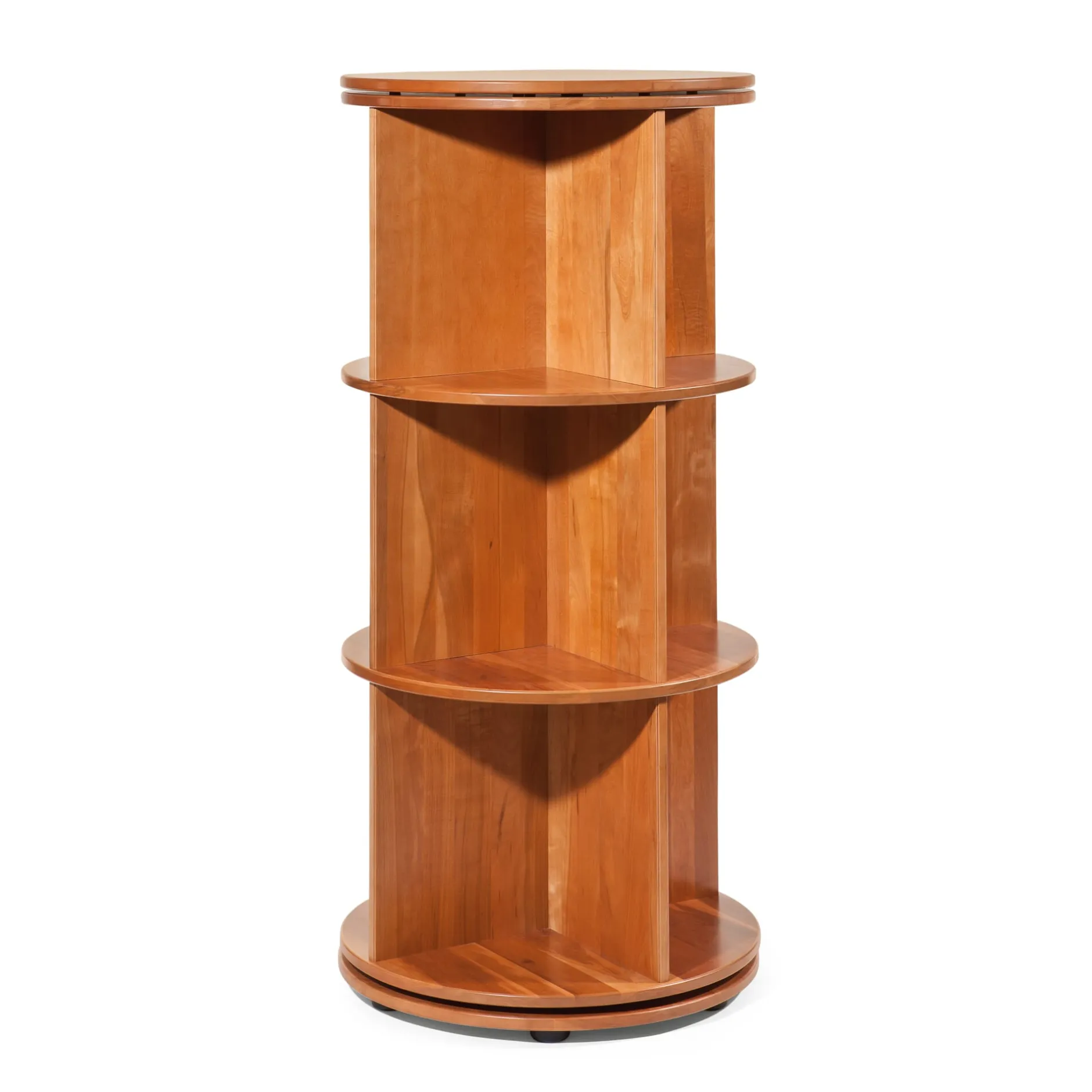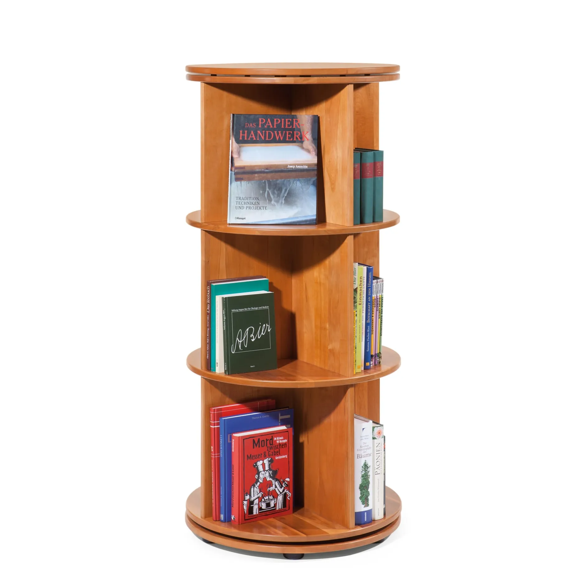 Das Prinzip wird in Bibliotheken und Archiven seit langem genutzt; raumsparender lassen sich Bücher und Ordner nicht aufbewahren als in einer drehbaren Säule, die bei geringster Grundfläche ein Maximum an Stellplatz bietet. Unser Bücherkarussell – zwei-, drei- oder vierstöckig – hat in der zweistöckigen Variante zusätzlich einen Pultaufsatz und wird damit zu einem überaus ansehnlichen und praktischen Mittelpunkt jedes Arbeitszimmers. Geschreinert wird das Bücherkarussell aus massiver Feuerlandkirsche, dem Holz, aus dem auch unsere Registratoren gebaut sind. Die Sockelplatte birgt einen massiven, kugelgelagerten, bis 300 kg belastbaren Aluminium-Drehbeschlag, über den der gesamte Turm leicht dreht. Jede Etage bietet eine nutzbare Stellhöhe von 39 cm bei einer nutzbaren Stellbreite pro Etage von insgesamt ca. 100 cm.