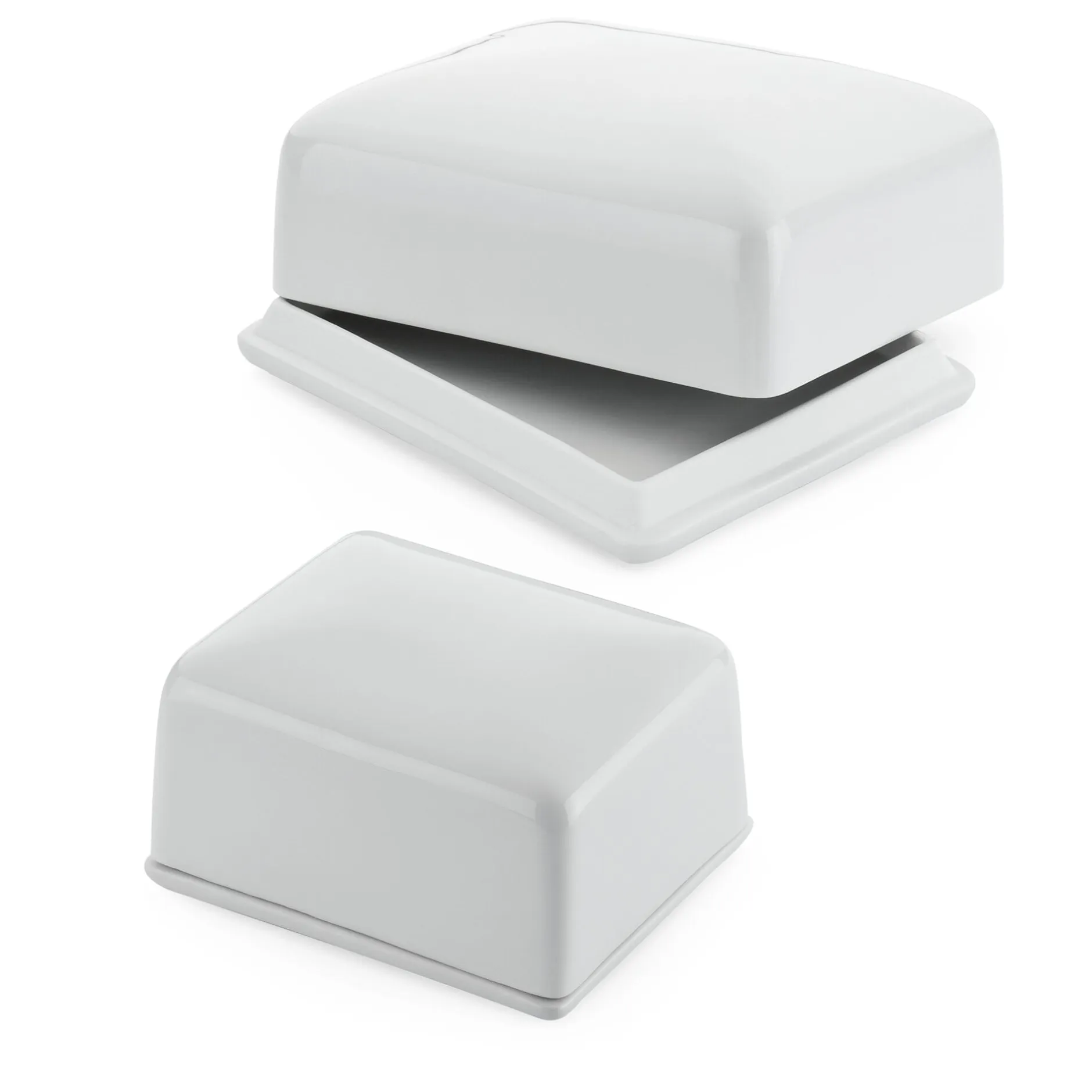In dem oberfränkischen Städtchen Küps, entlang der Bayerischen Porzellanstraße gelegen, entstehen unsere Butterdosen. Lindner fertigt sie dort mit einem minimal zurückgesetzten Steg auf der Unterseite des Bodens, der ihre Handhabung erleichtert. Auf der Oberseite desselben fasst ein nach außen schräg ausgebildeter Steg den Deckel, der an der leicht rauen Oberfläche des an dieser Stelle nicht glasierten Porzellans guten Halt hat. Der Deckel ist bei beiden Dosen in gewölbter Form mit gerundeten Kanten gearbeitet.