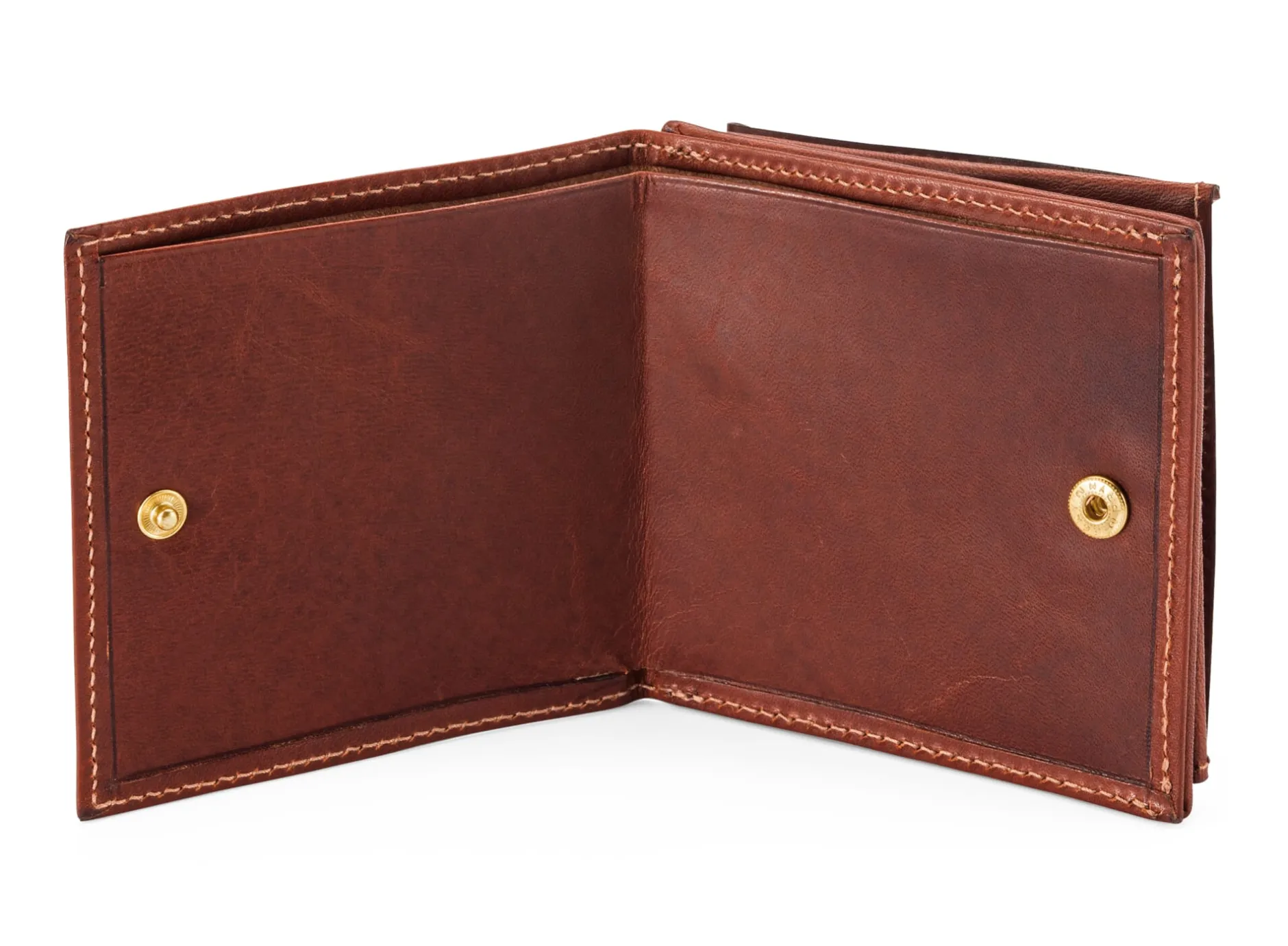 Rindleder (Stärke 1–1,2 mm), vegetabil gegerbt, Herkunft Deutschland. Mit Messingdruckknopf. Hergestellt in Deutschland. 9 × 9 cm.